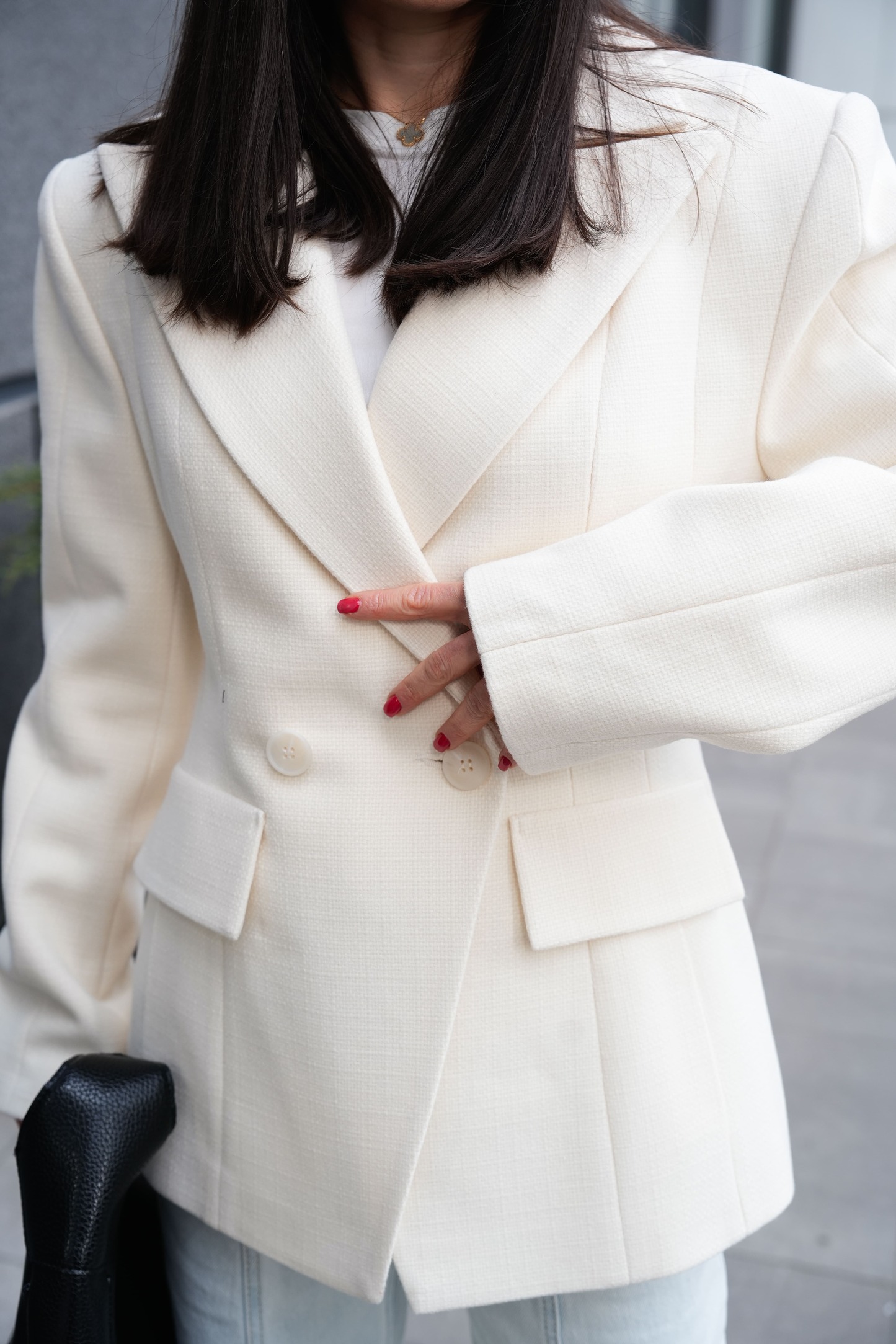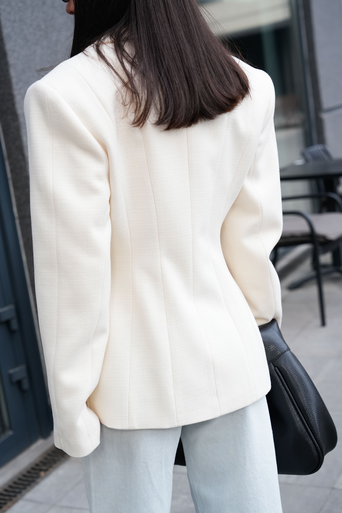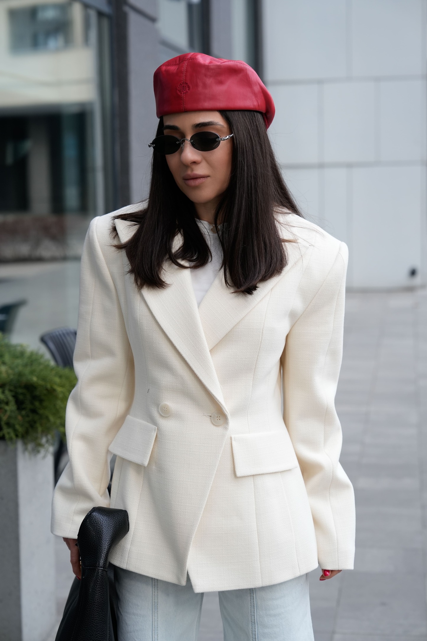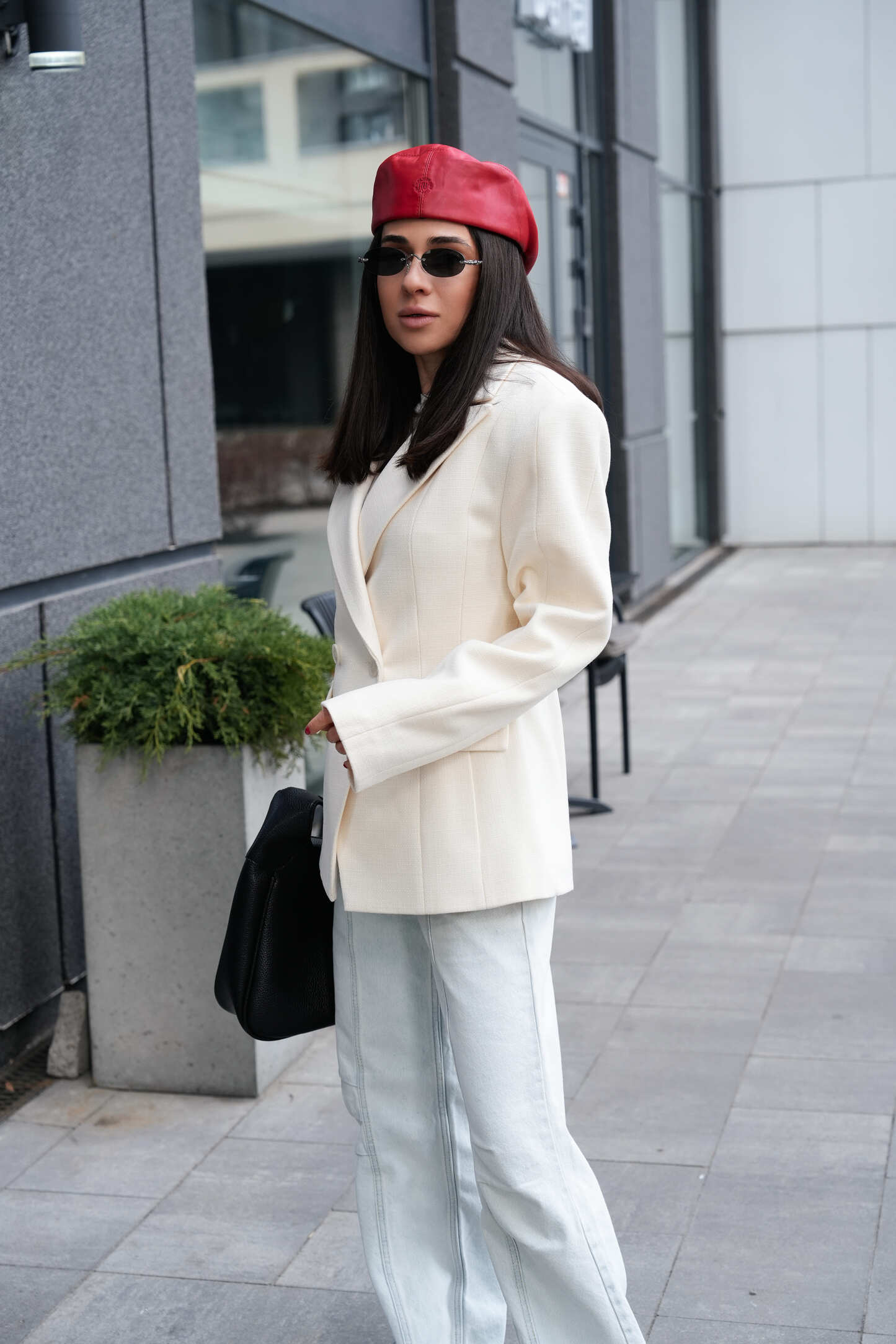 Блейзер Sharp Line у вишуканому молочному відтінку — це ідеальне поєднання чистоти кольору та чіткої геометрії крою. Світлий, м’який тон додає образу легкості та елегантності, підкреслюючи текстуру тканини й акуратність кожної деталі. Такий відтінок виглядає дорого, освіжає образ і легко комбінується як із базовими, так і з акцентними речами гардероба.