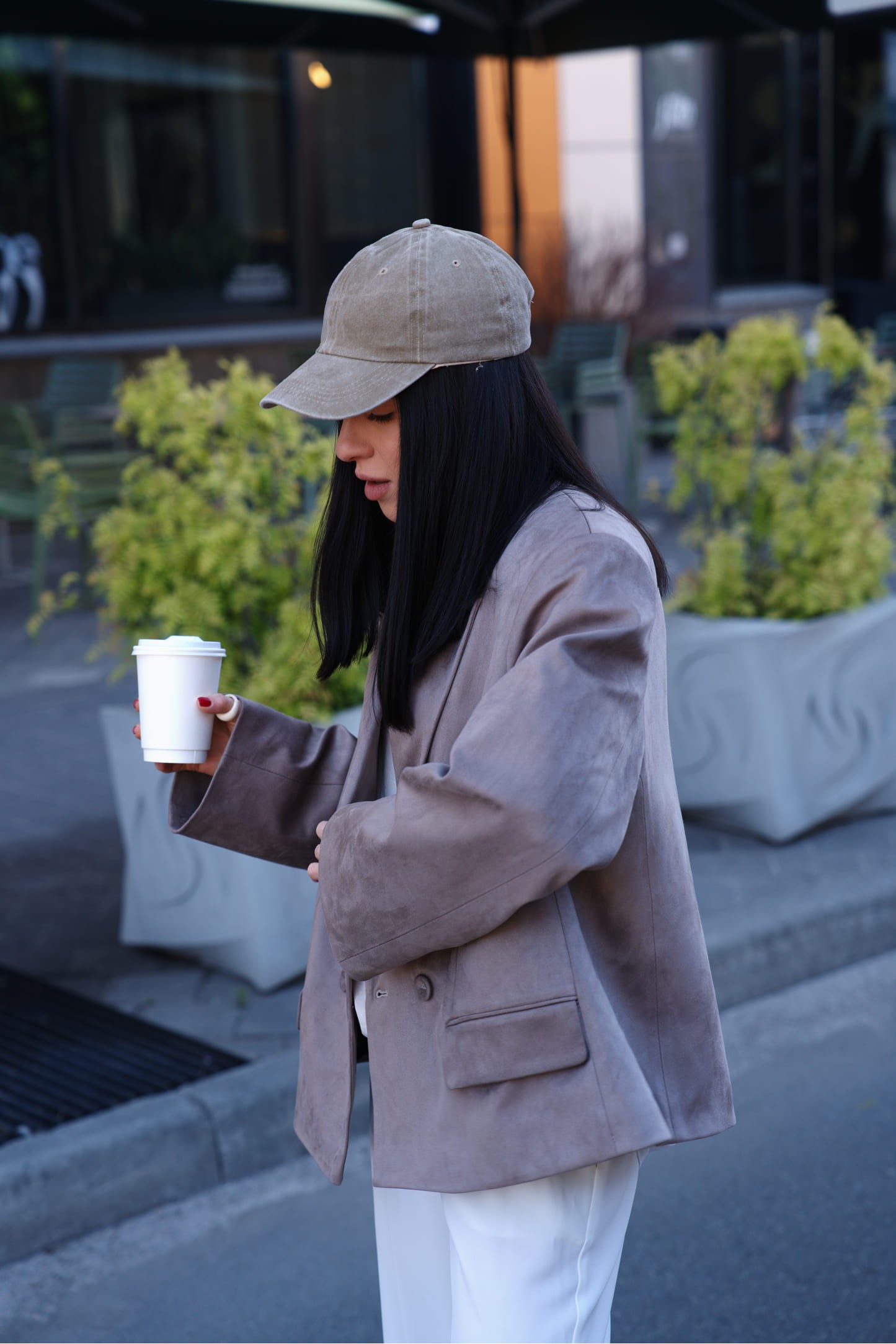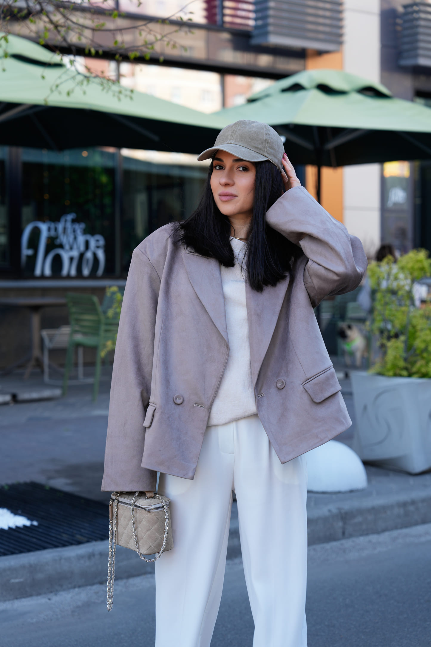 Вільний oversize крій з чіткою лінією плеча формує сучасний силует і дозволяє стилізувати блейзер у різних напрямках — від міських casual образів до більш витончених комбінацій. Класичні лацкани, двобортна застібка та функціональні кишені додають виробу характеру класичного піджака, водночас зберігаючи модний актуальний настрій. Внутрішня кишеня та петелька для підвішування роблять модель практичною у повсякденному використанні.
