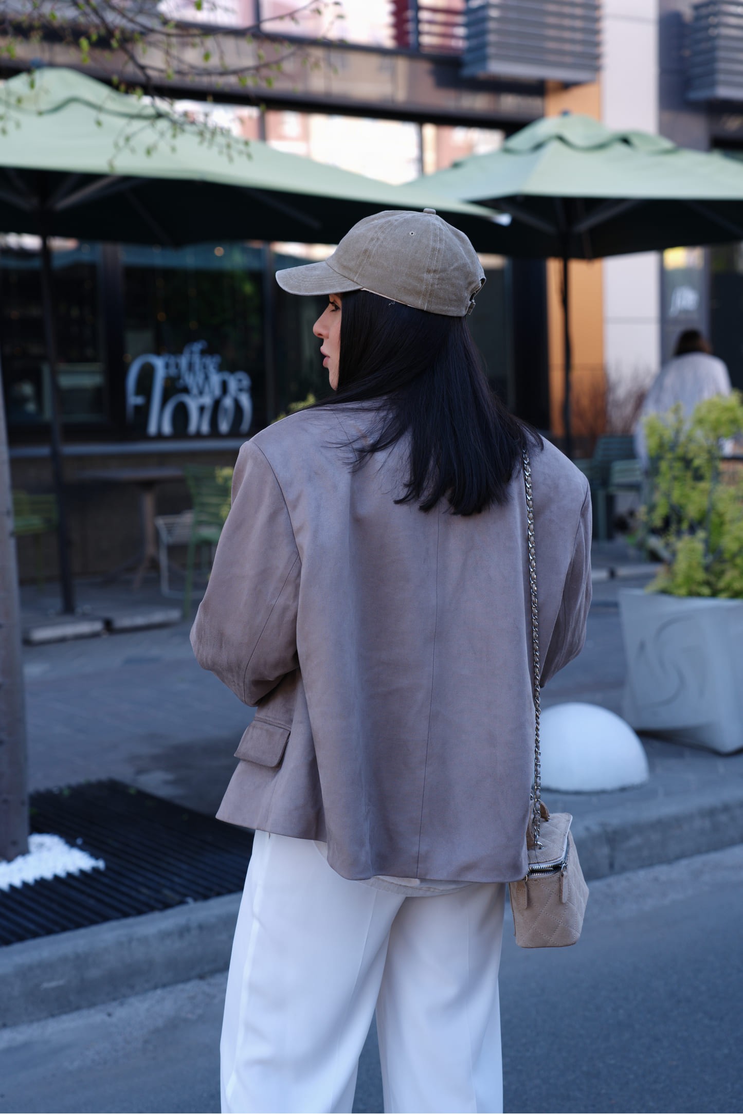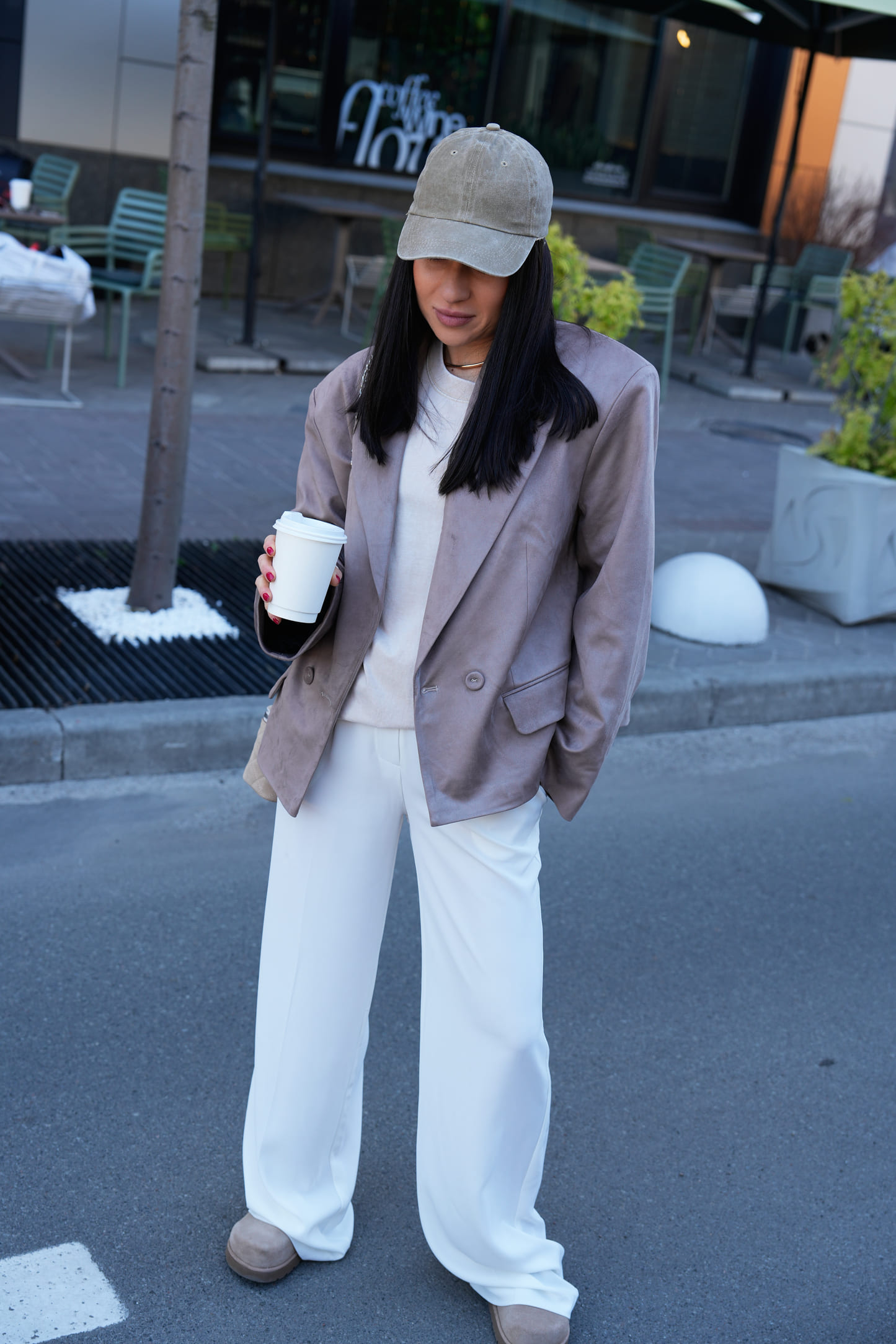 Модель виконана з м’якої еко-замші з делікатною бархатистою текстурою, що створює благородний матовий ефект і додає образу глибини. Бежевий відтінок виглядає стримано та елегантно, легко поєднується як з базовими речами гардеробу, так і з більш контрастними акцентами. Матеріал приємний на дотик і добре тримає форму, зберігаючи акуратний вигляд протягом дня.