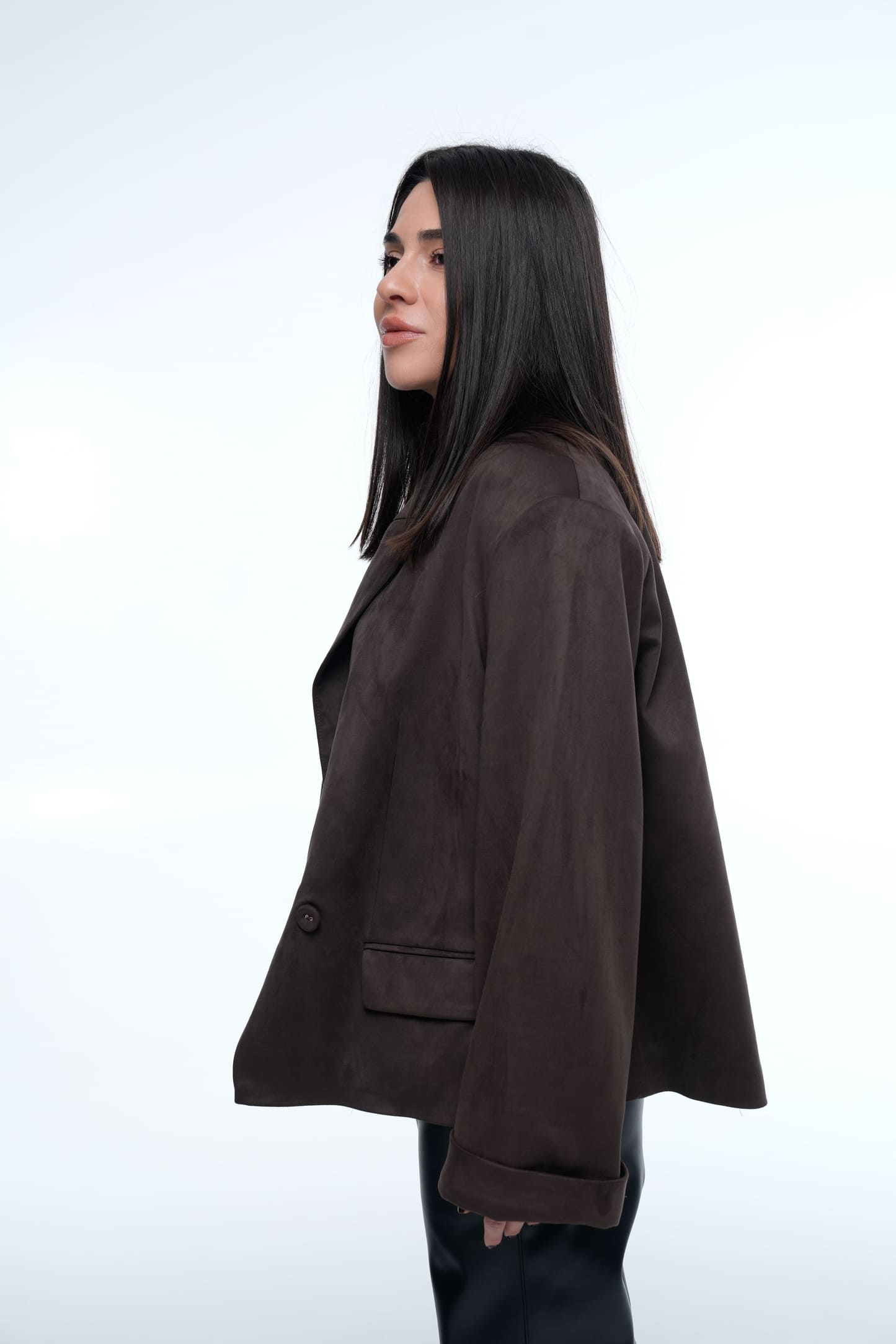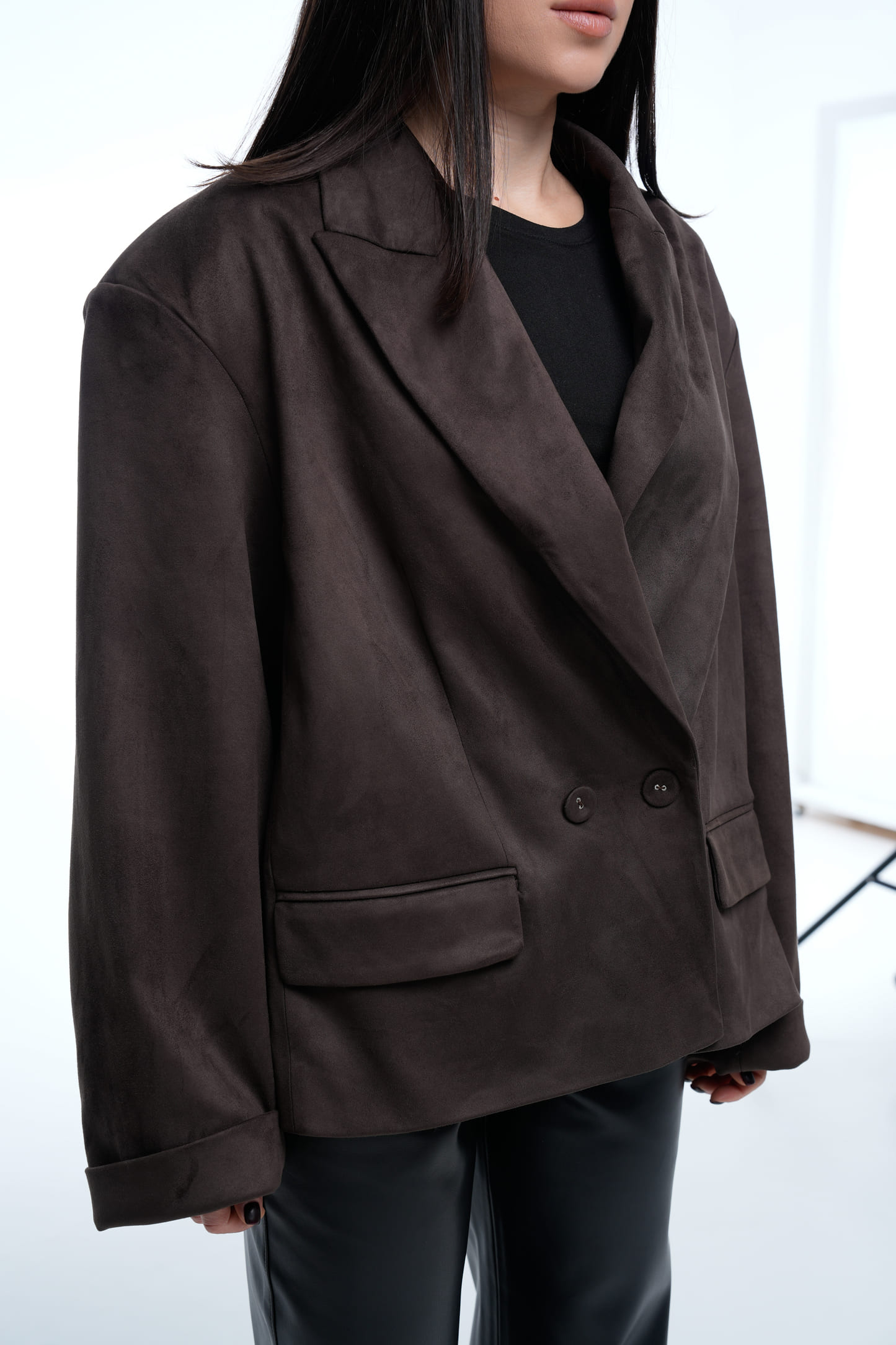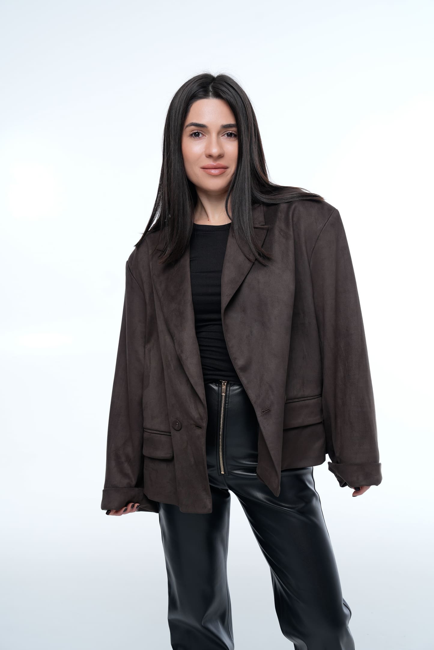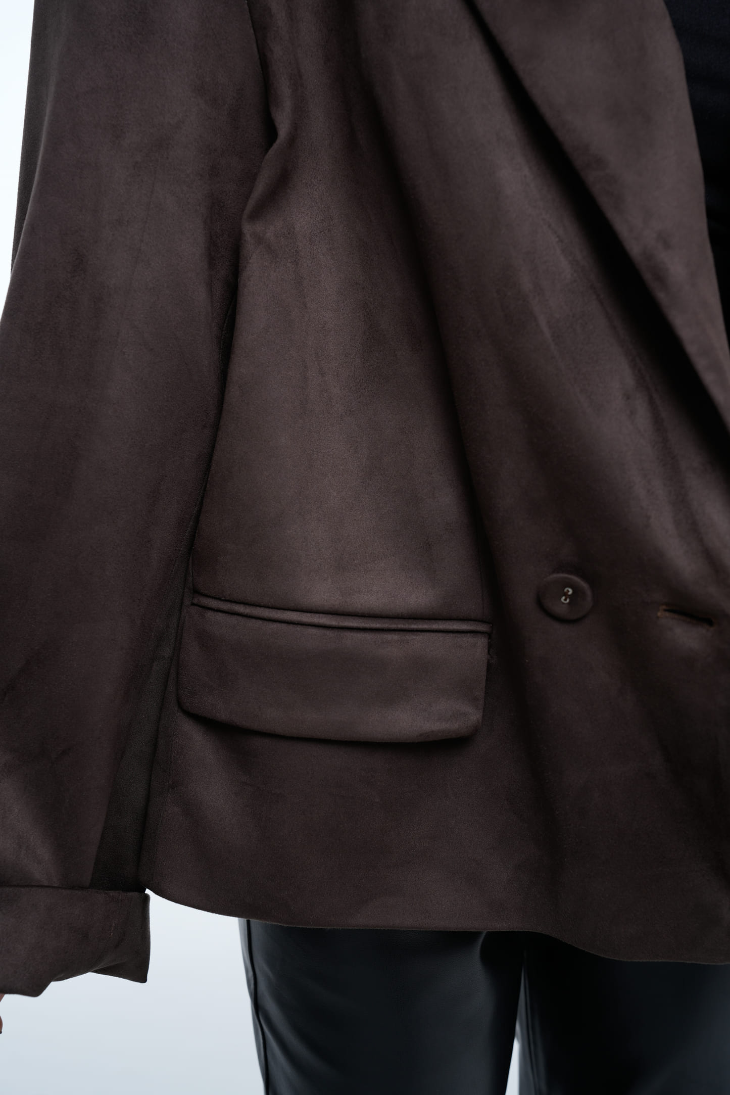 Блейзер виконаний з еко-замші насиченого шоколадного відтінку, який виглядає глибоко та благородно. Матеріал має м’яку бархатисту текстуру та приємний матовий ефект, завдяки чому виріб виглядає дорого та виразно. Шоколадний колір додає образу тепла і добре поєднується з базовими елементами гардероба, такими як чорні штани, денім, молочні або бежеві топи.