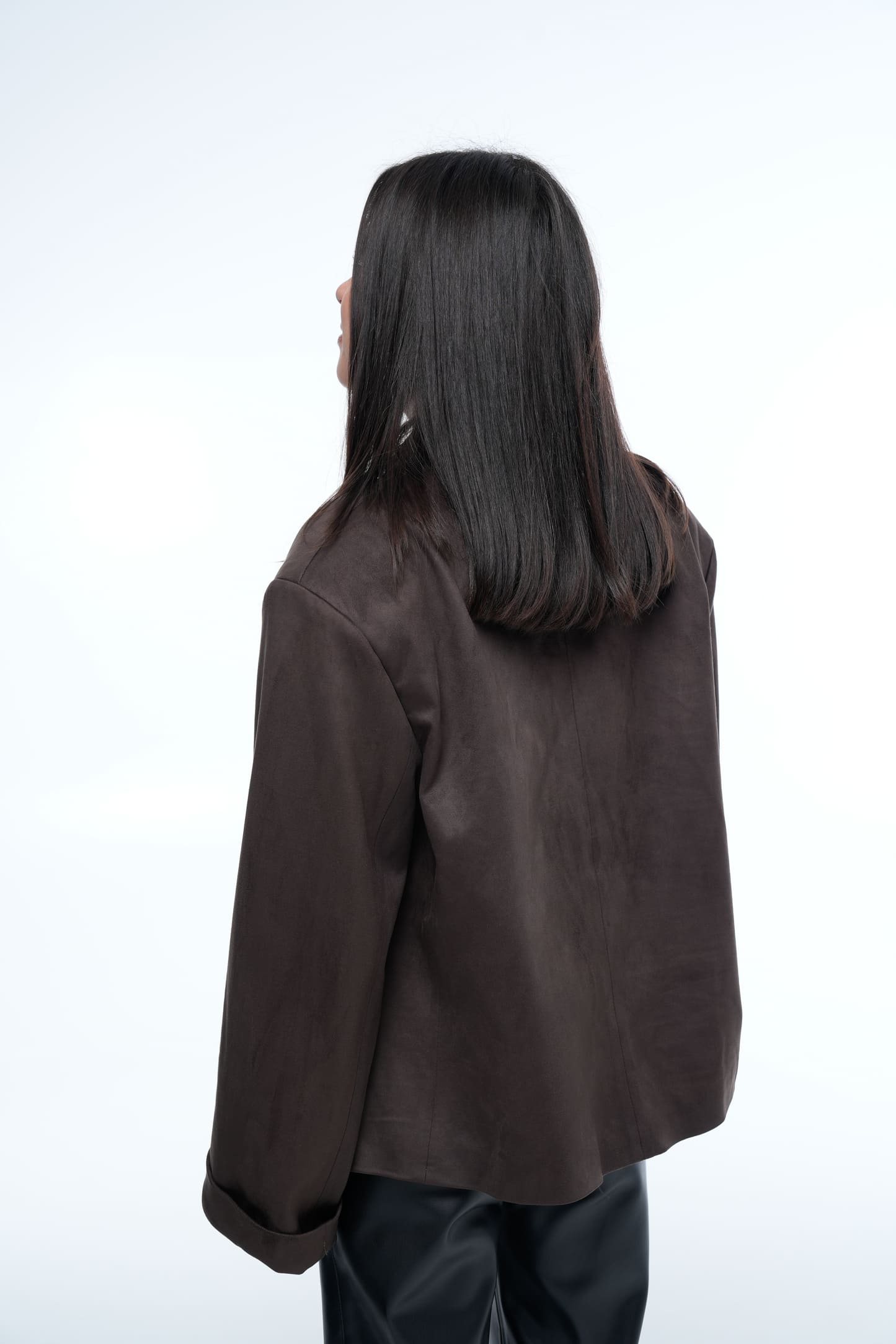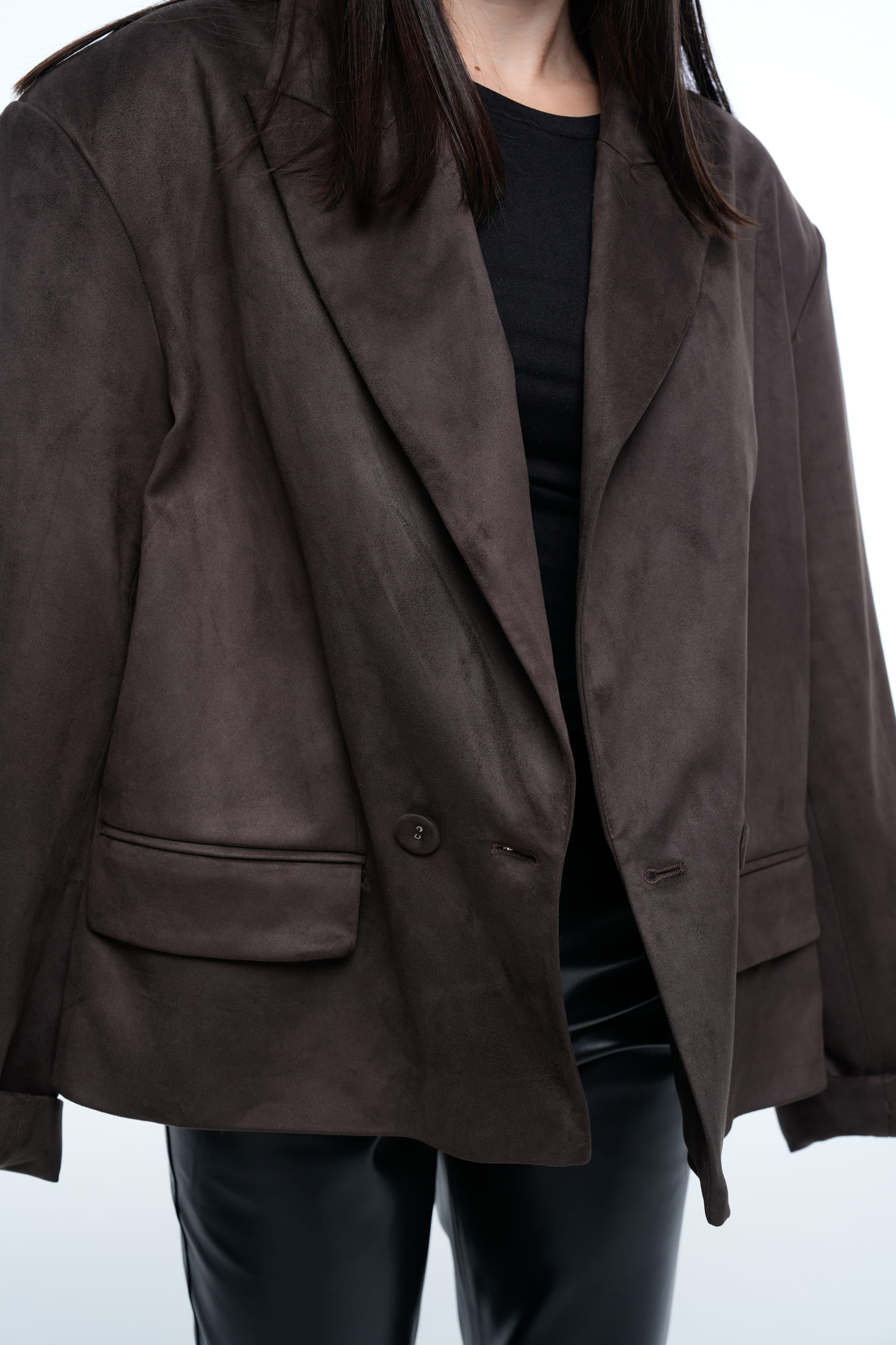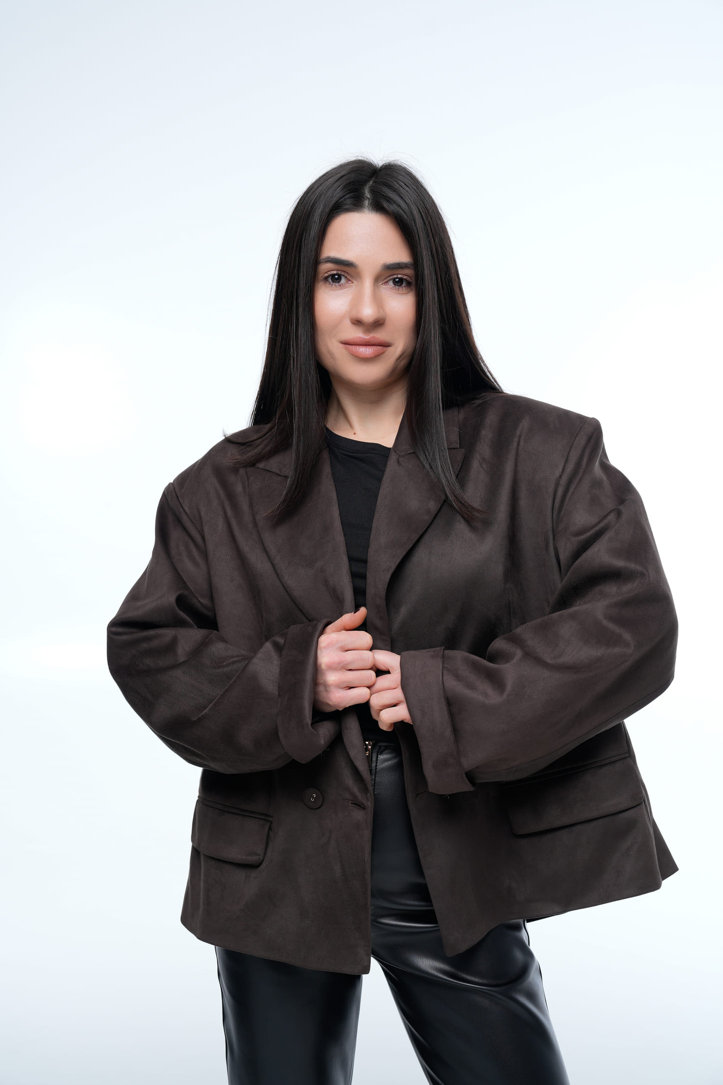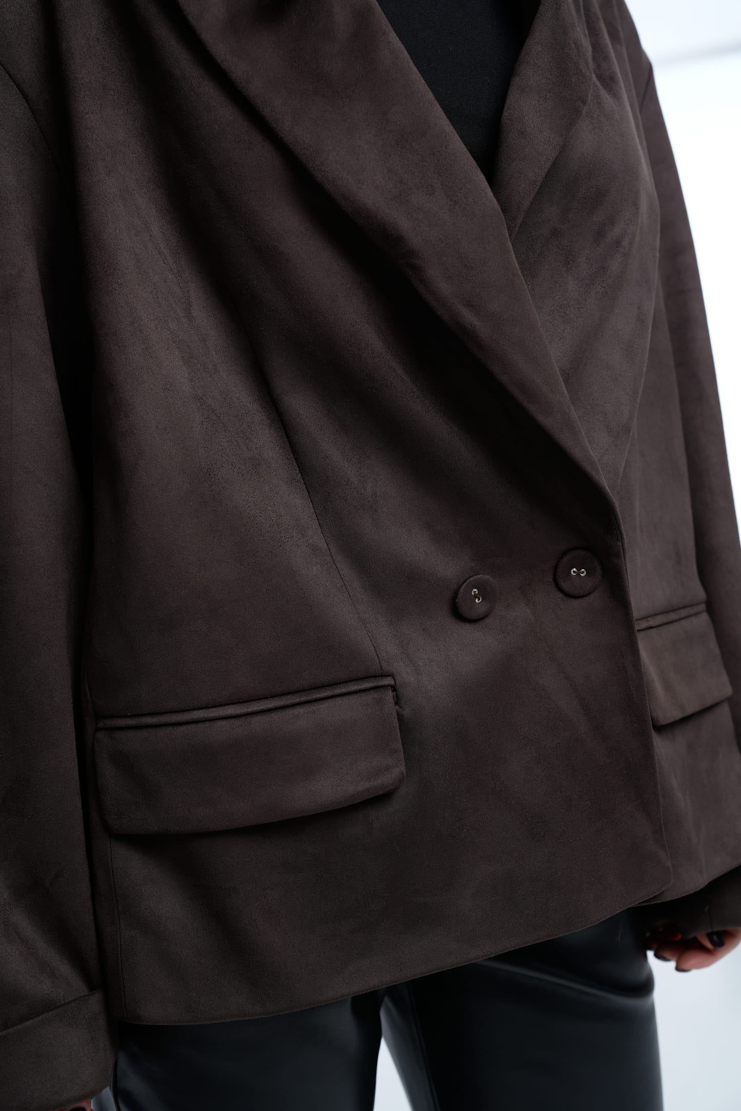 Блейзер виконаний з еко-замші насиченого шоколадного відтінку, який виглядає глибоко та благородно. Матеріал має м’яку бархатисту текстуру та приємний матовий ефект, завдяки чому виріб виглядає дорого та виразно. Шоколадний колір додає образу тепла і добре поєднується з базовими елементами гардероба, такими як чорні штани, денім, молочні або бежеві топи.
