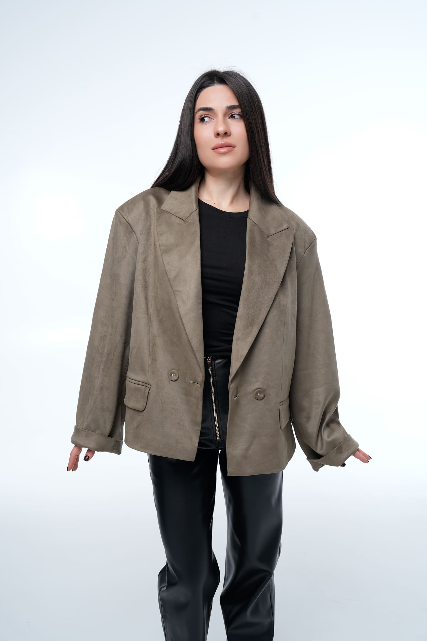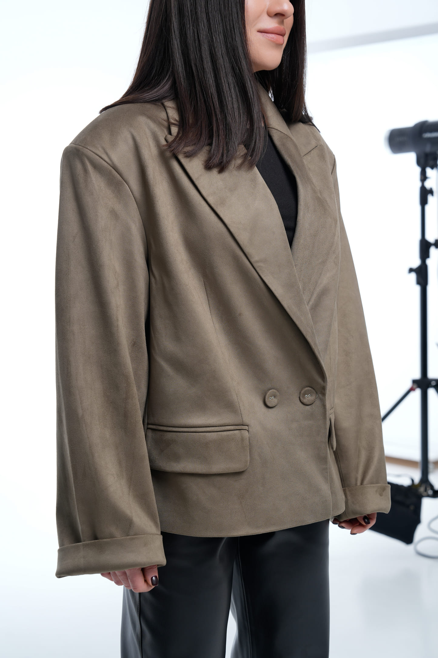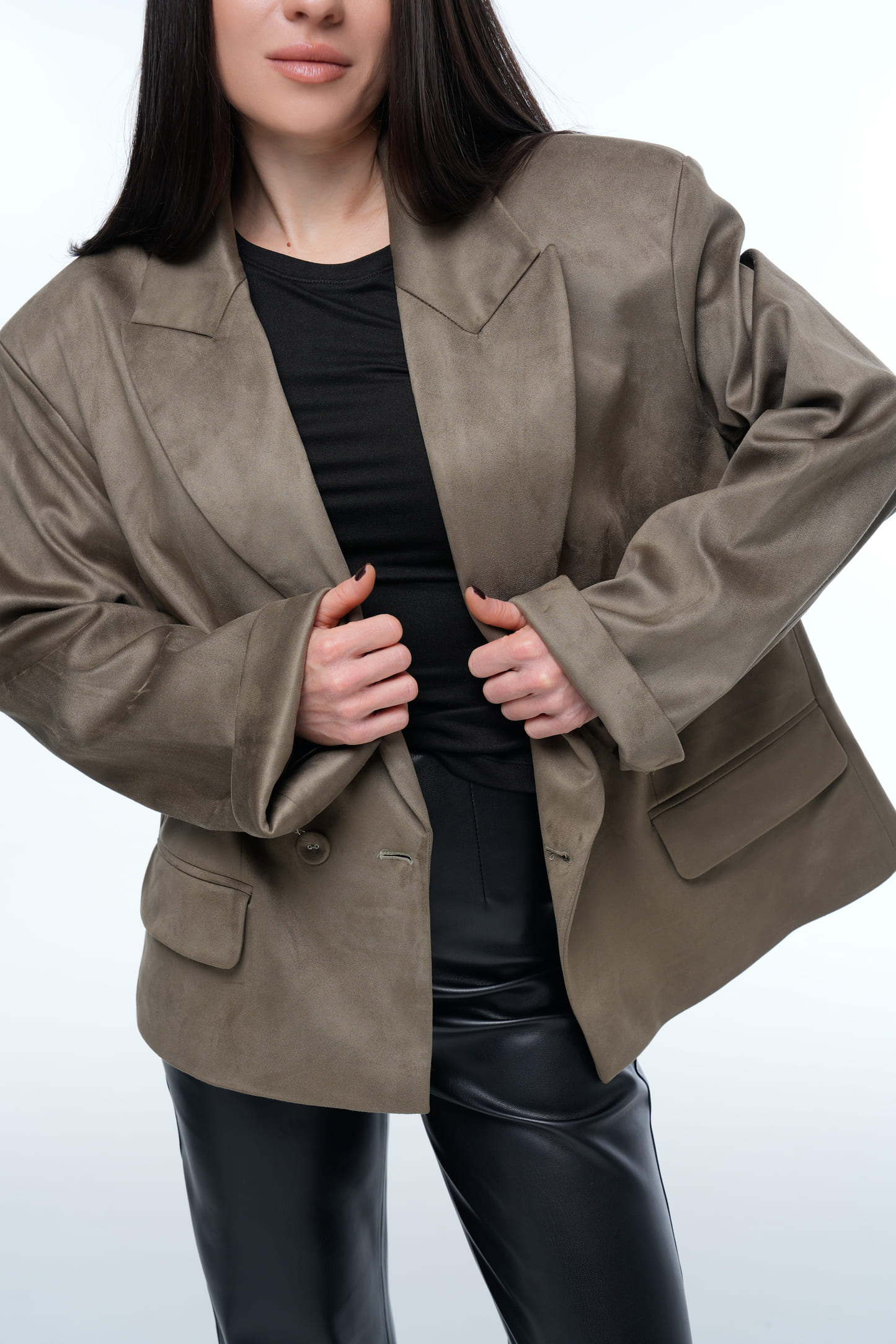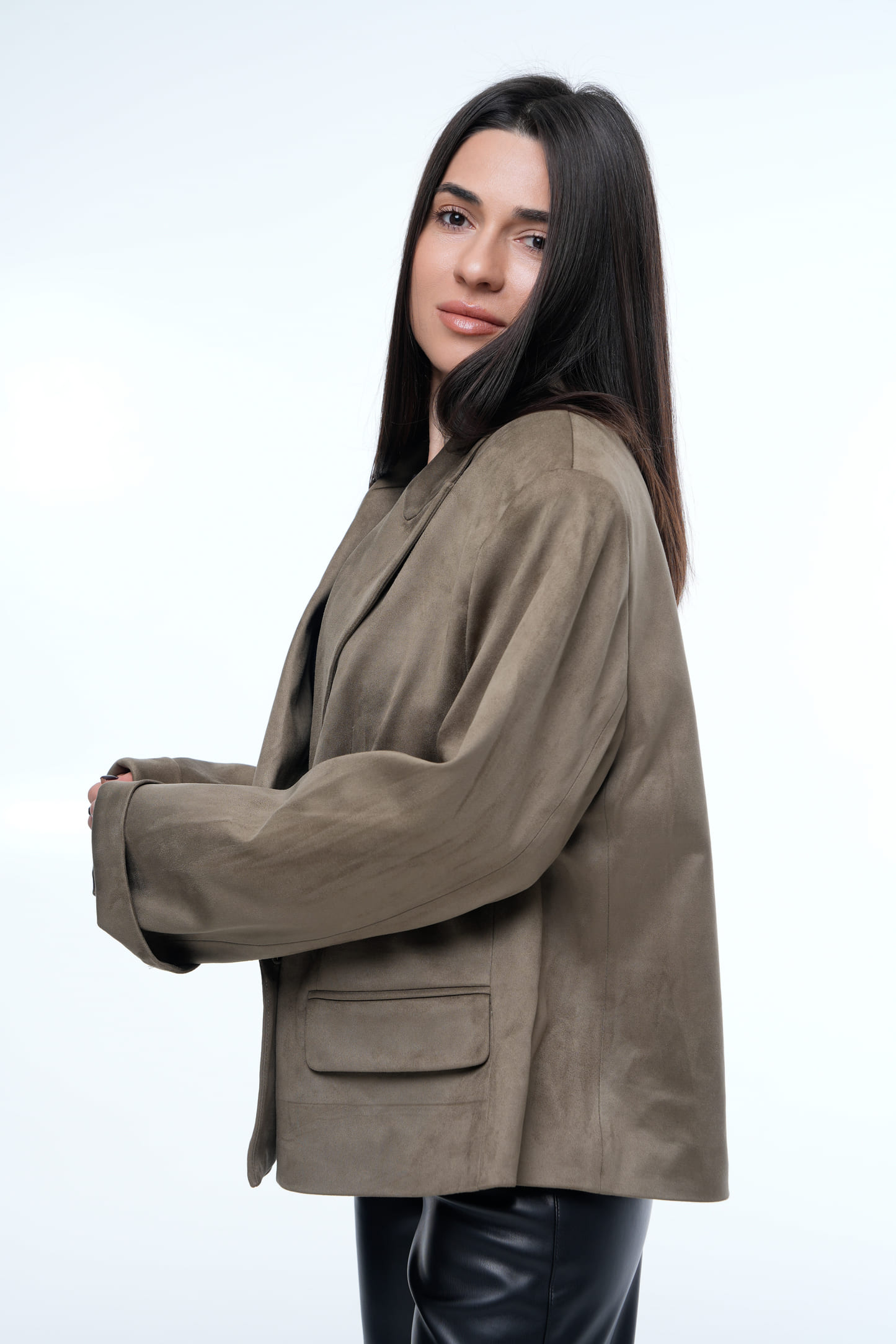 Блейзер виконаний з еко-замші з делікатною матовою текстурою, яка створює благородний та глибокий візуальний ефект. Оливковий відтінок виглядає стримано й елегантно, додає образу характеру та легко комбінується з базовими кольорами гардероба. Такий колір гармонійно поєднується з чорними штанами, денімом, світлими топами або фактурними спідницями.