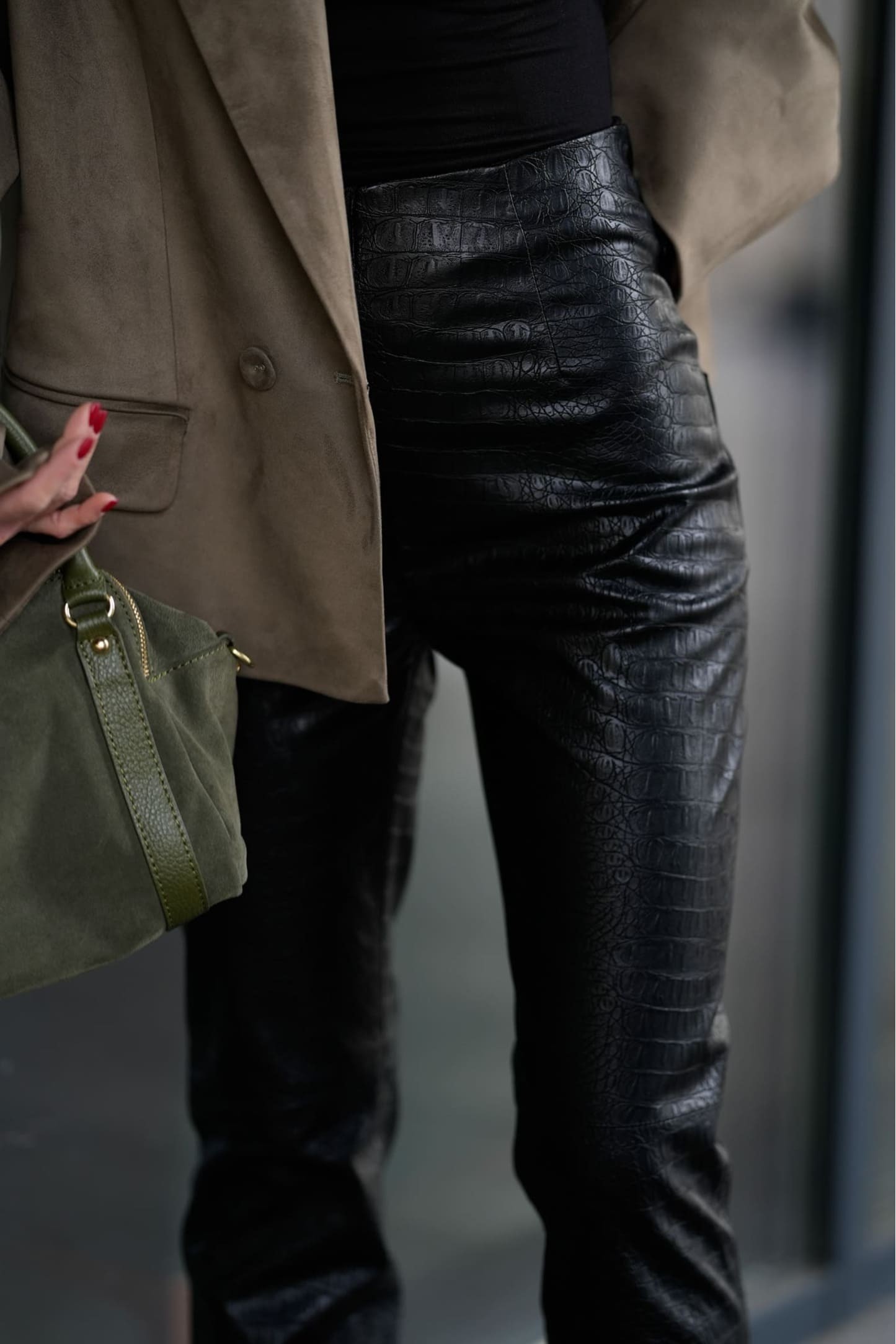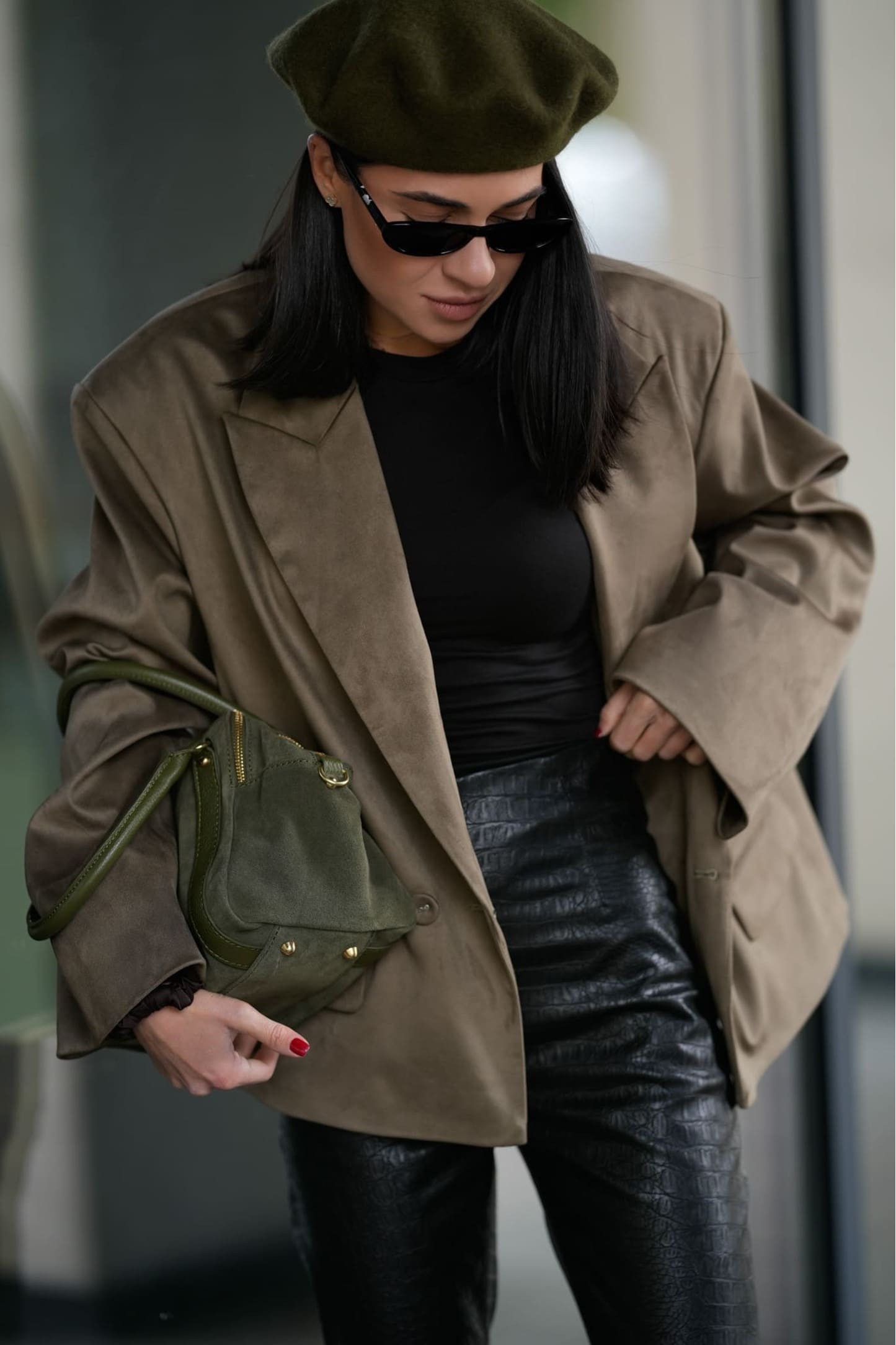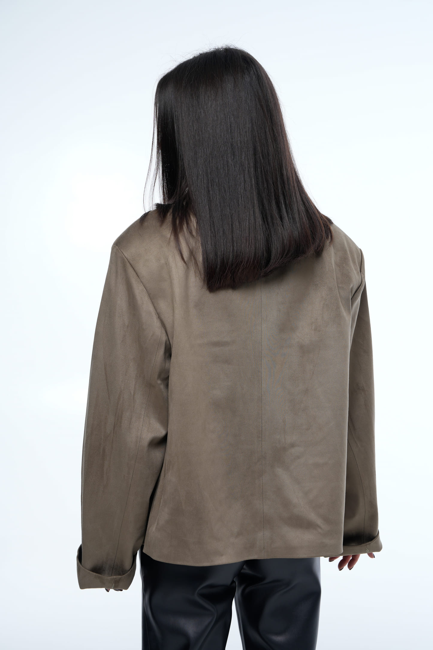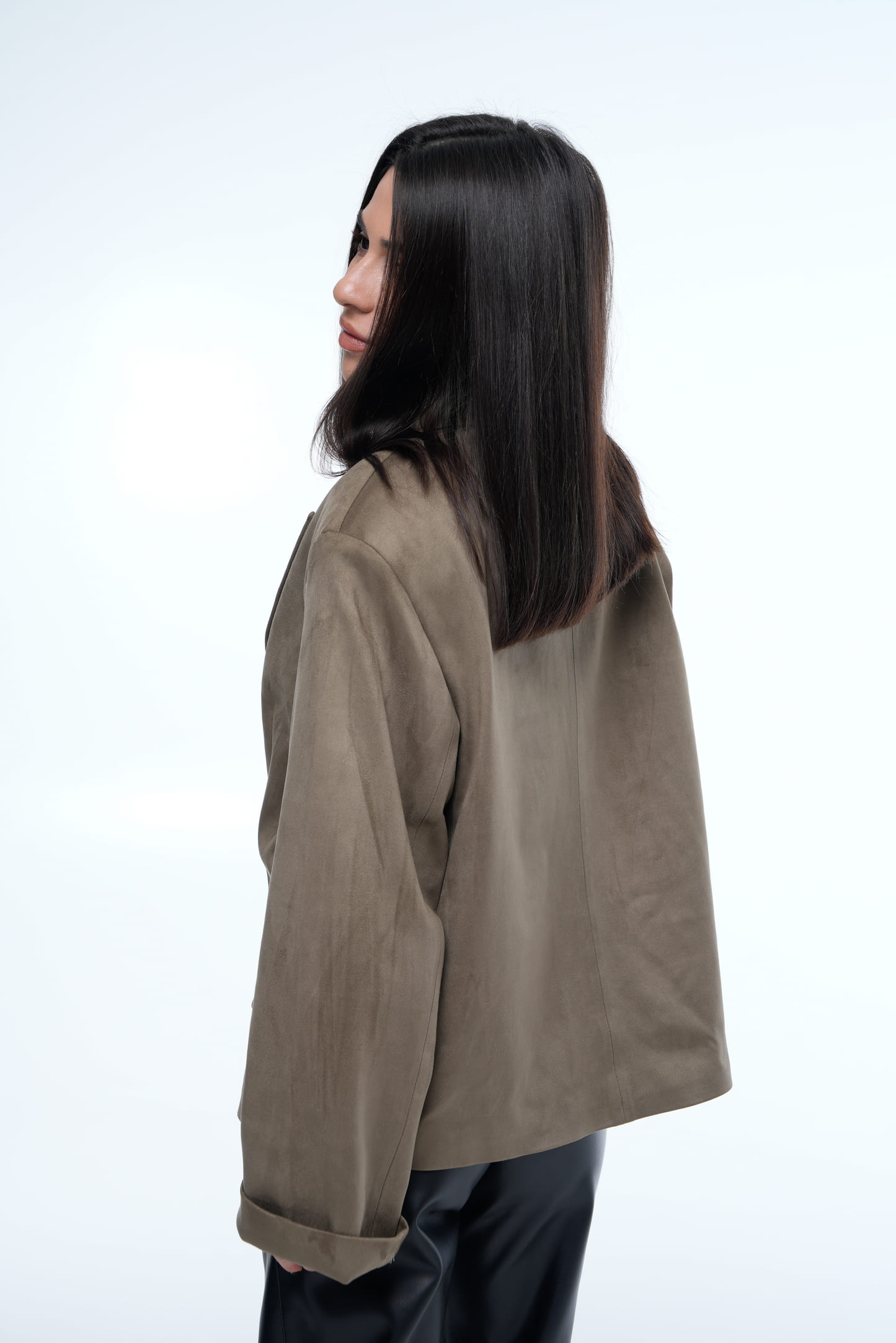 Блейзер виконаний з еко-замші з делікатною матовою текстурою, яка створює благородний та глибокий візуальний ефект. Оливковий відтінок виглядає стримано й елегантно, додає образу характеру та легко комбінується з базовими кольорами гардероба. Такий колір гармонійно поєднується з чорними штанами, денімом, світлими топами або фактурними спідницями.
