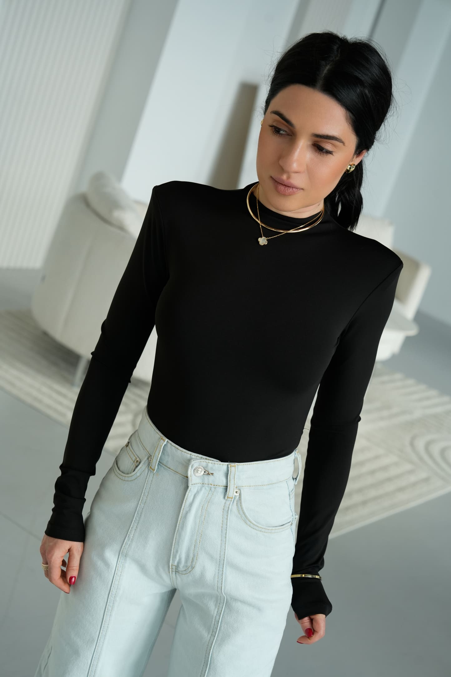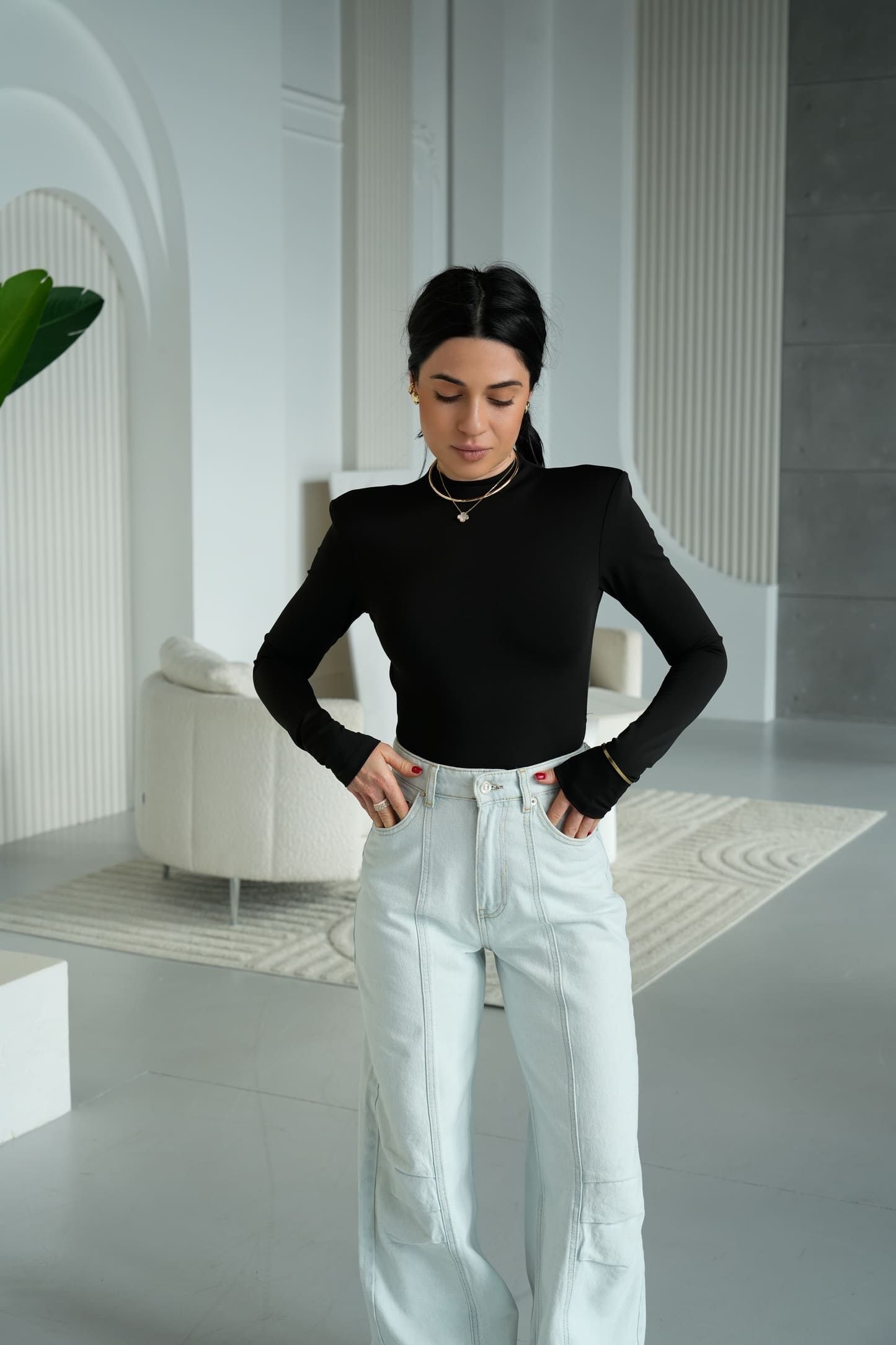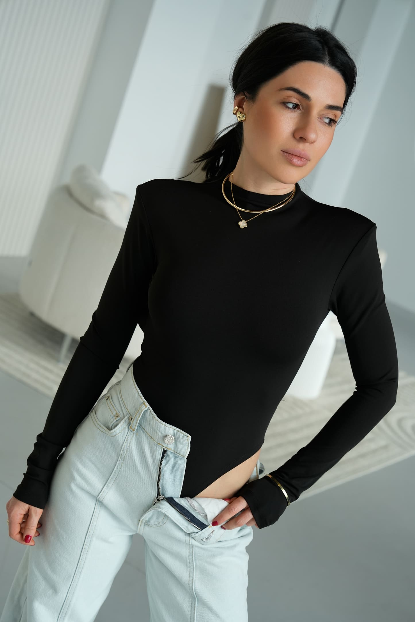 Акцентні плечики формують чітку геометрію верху, додаючи образу структури та сучасного характеру. Завдяки цьому боді виглядає більш зібрано і може легко замінити базовий топ або лонгслів у стилізованих образах.