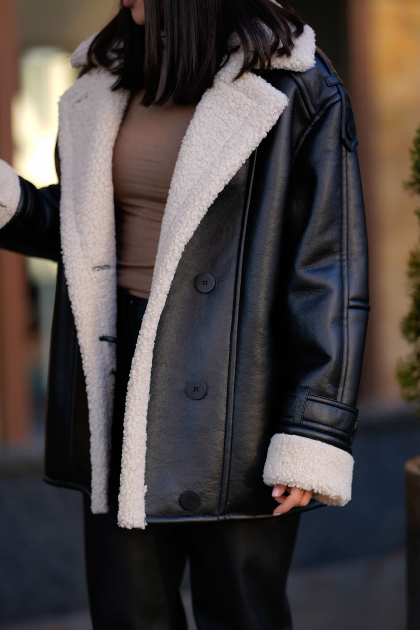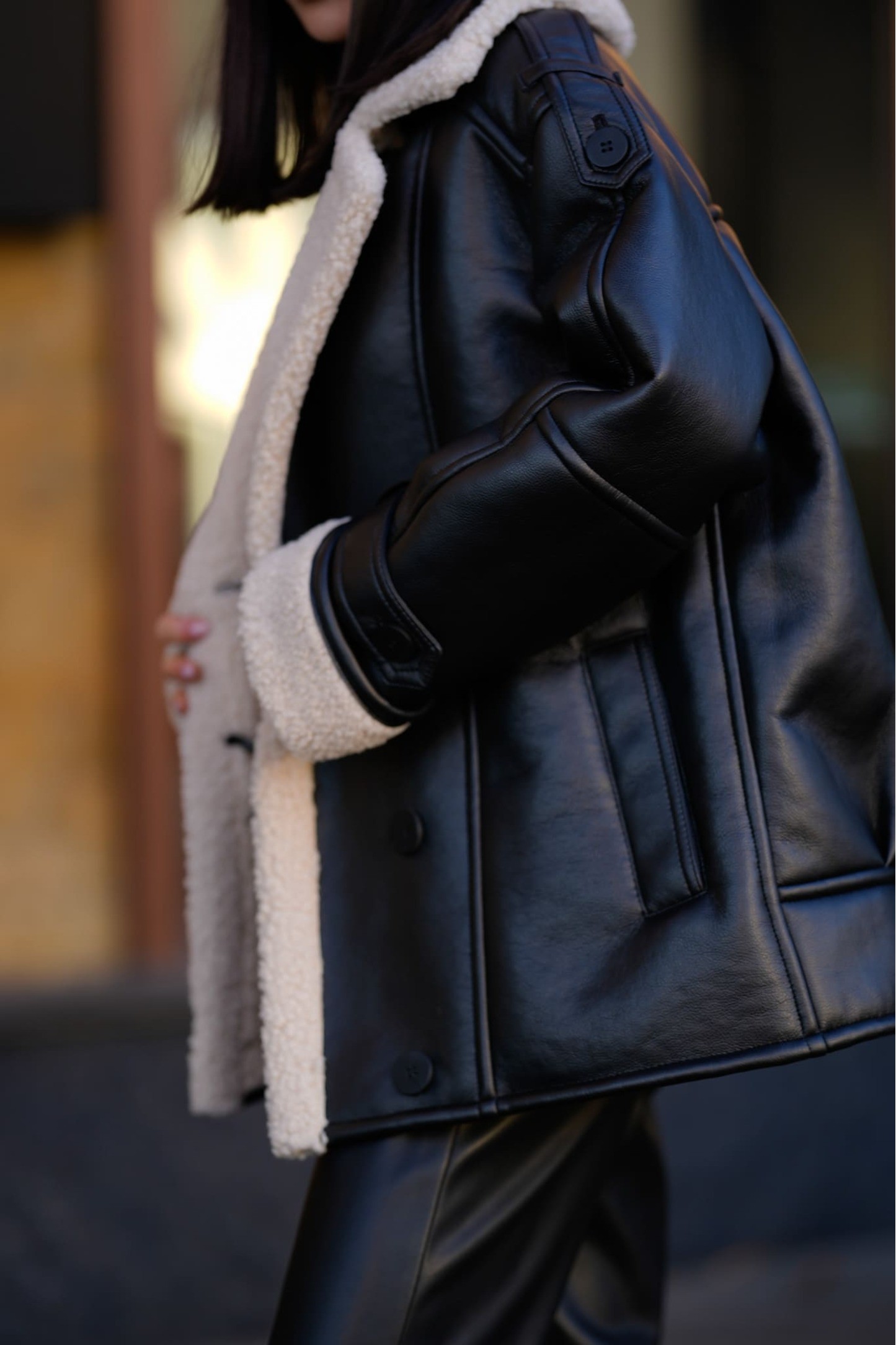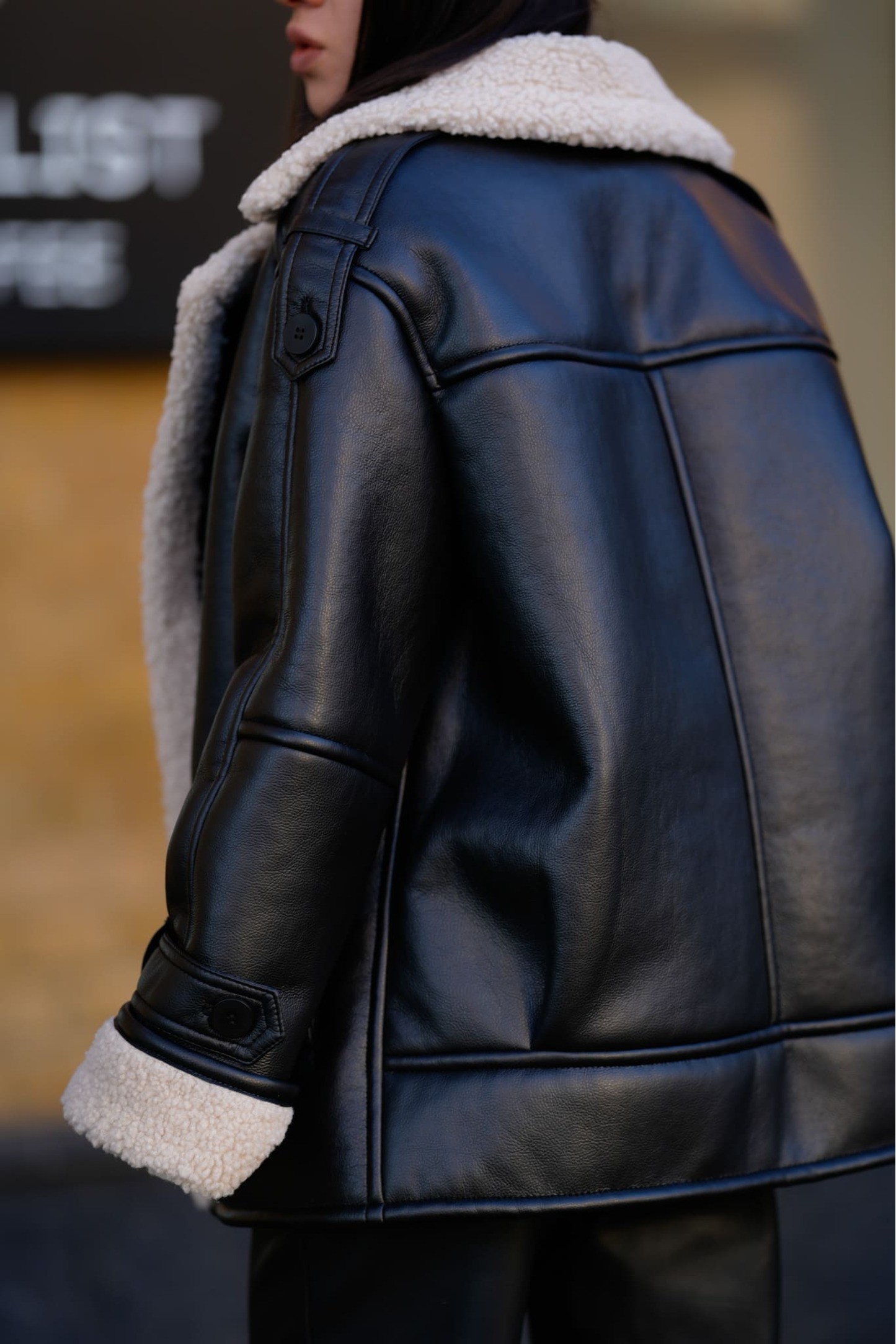 Дублянка Aviator Shearling Black — стильна зимова модель у форматі класичної льотної куртки. Виконана з матової екошкіри та утеплена м’яким вовняним штучним хутром всередині, що створює ефект "шубки" та забезпечує максимальний комфорт у холодний сезон. Модель має структурований крій, акуратні декоративні лінії та стильні акценти у вигляді фурнітури у тон.