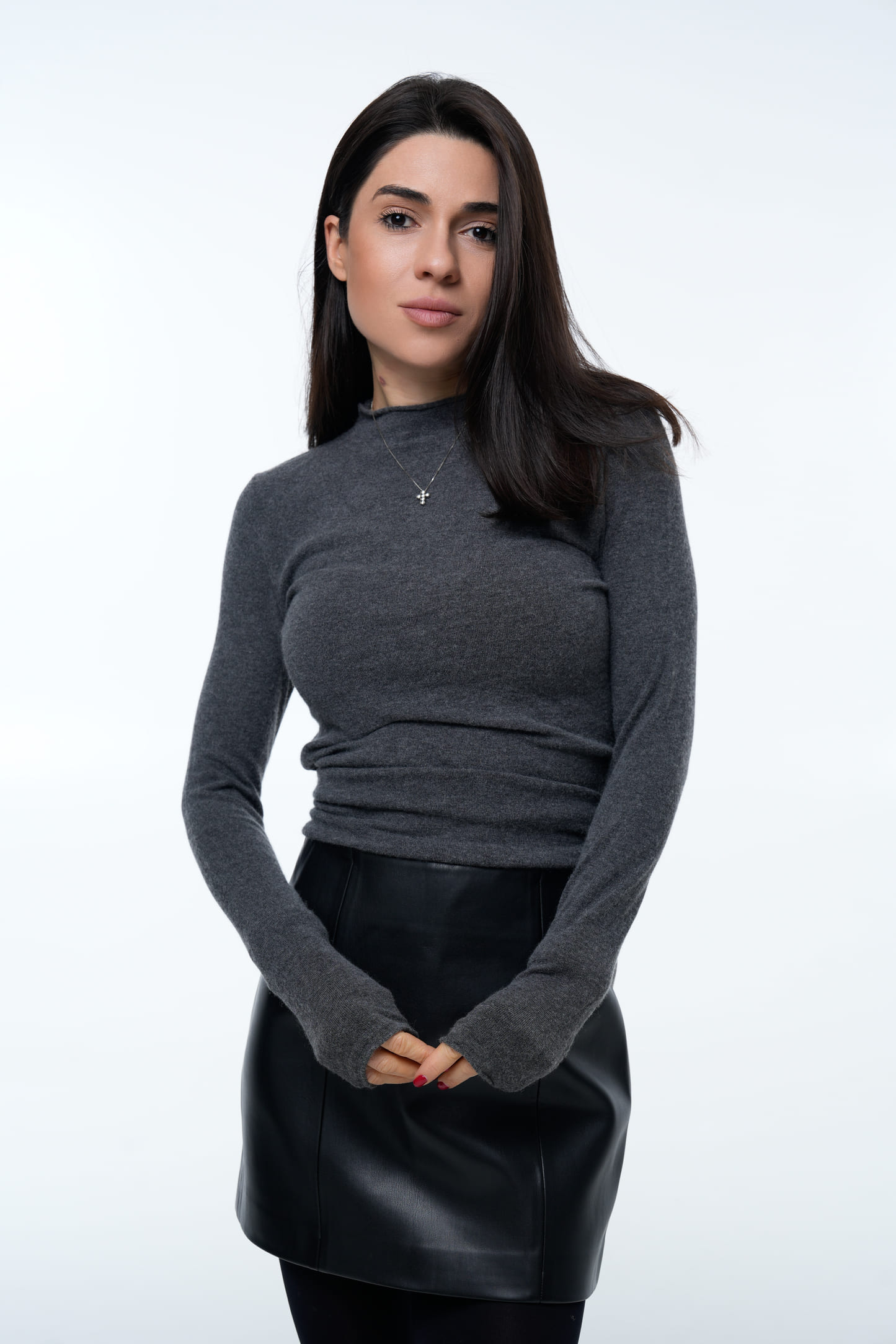 Подовжені рукави з м’яким краєм створюють ефект легкого драпування та додають образу делікатності. Тканина виглядає по-особливому теплішою та затишною, що робить гольф ідеальним для прохолодного сезону. Завдяки універсальному графітовому кольору легко поєднується зі шкіряними спідницями, денімом, костюмними штанами чи верхнім одягом.
