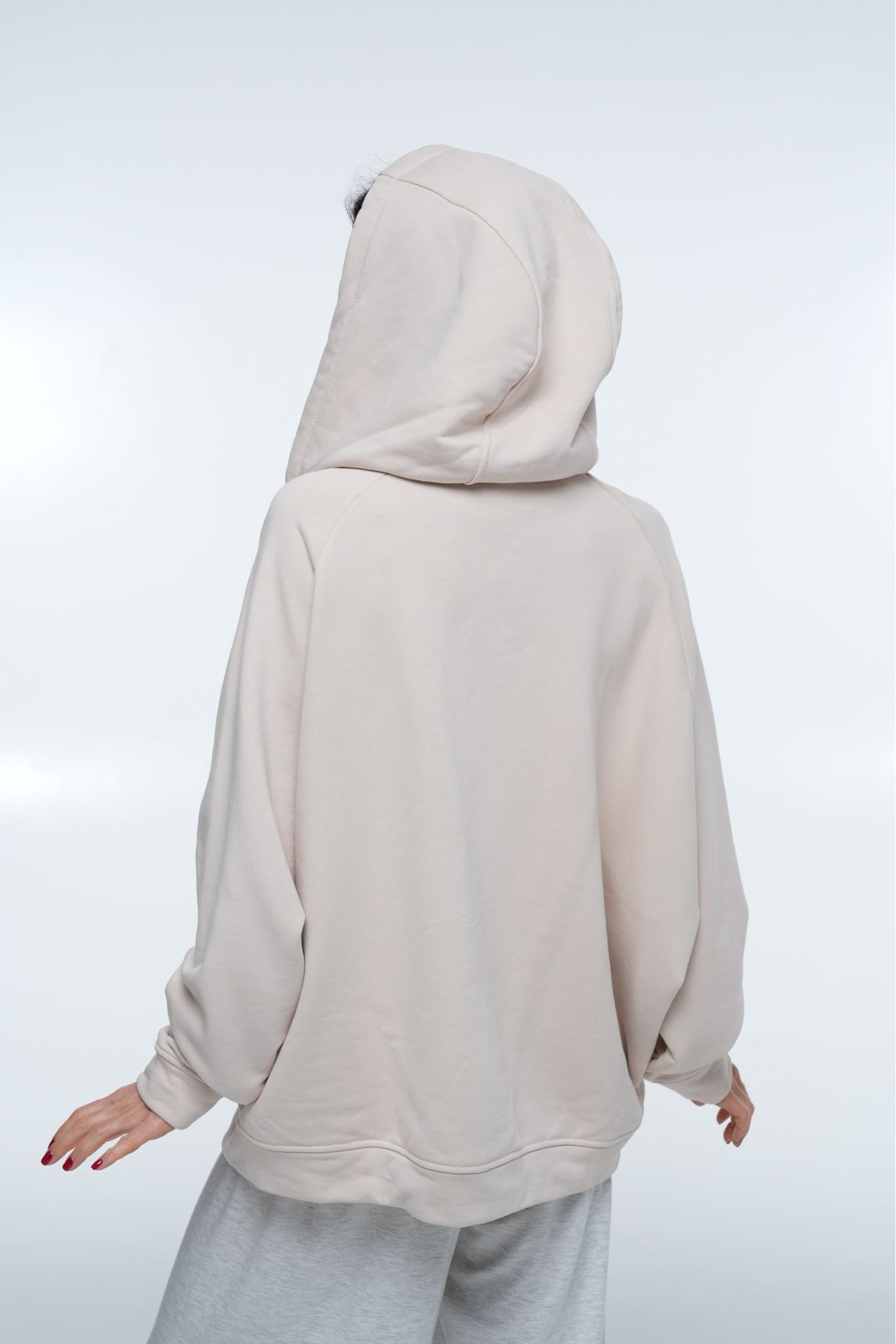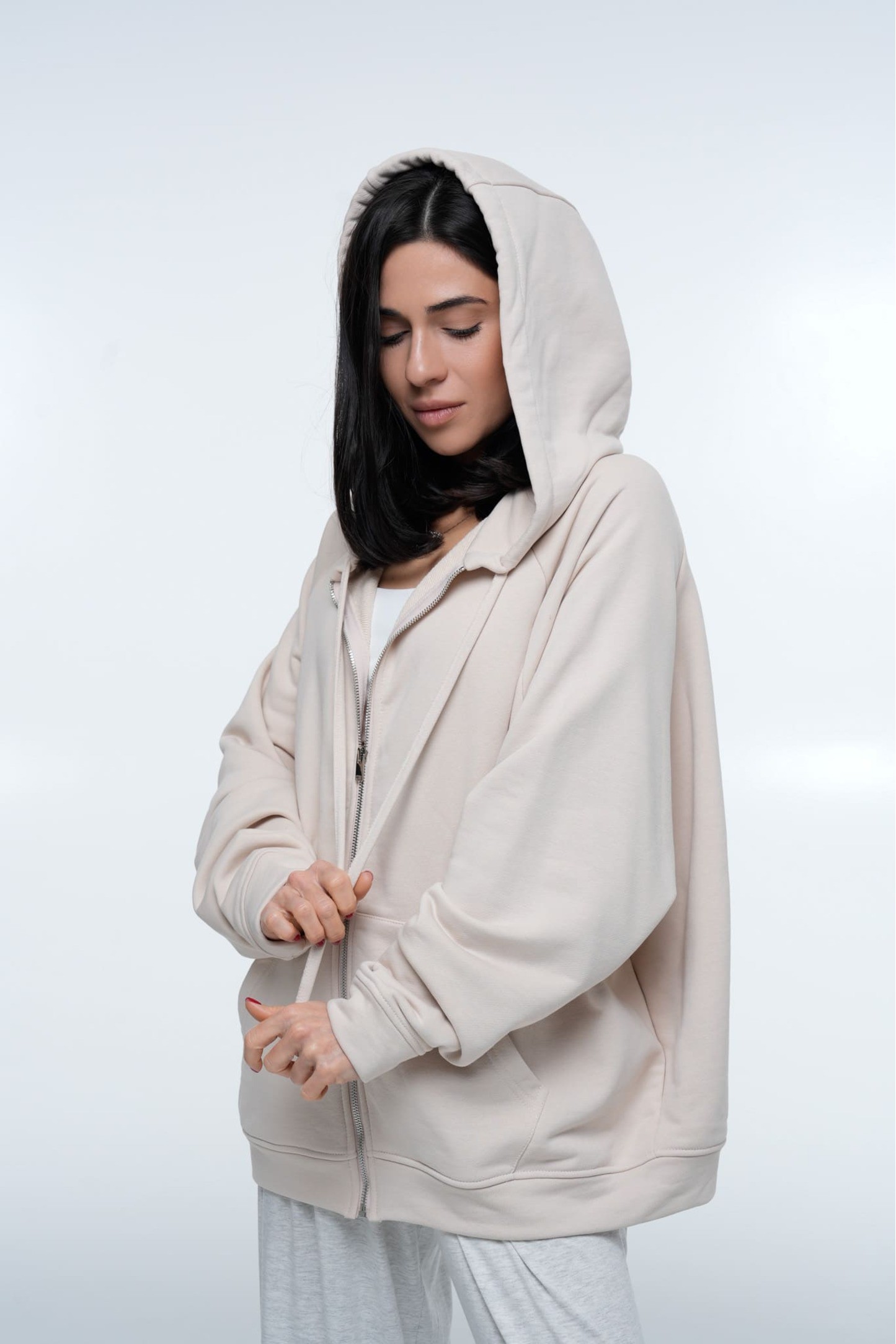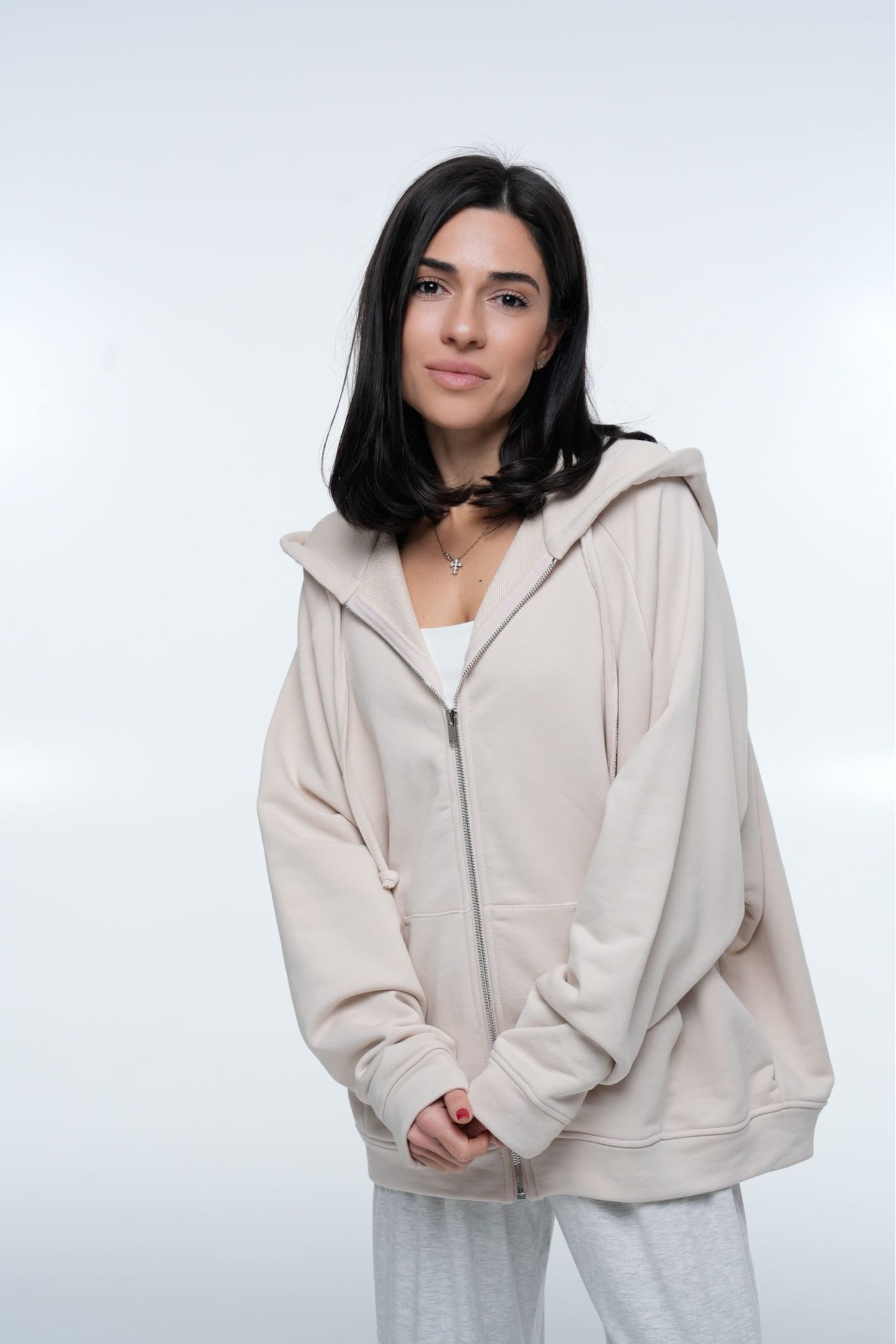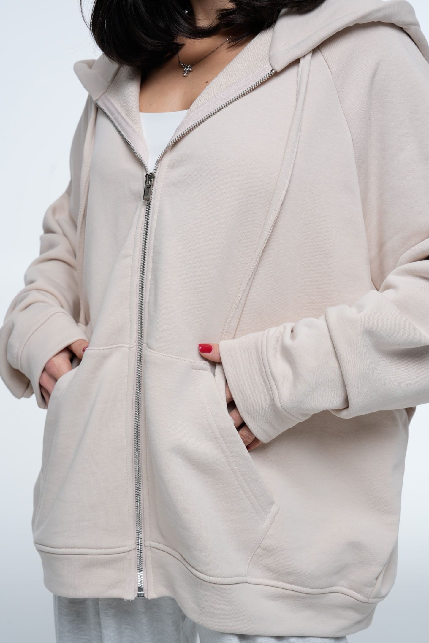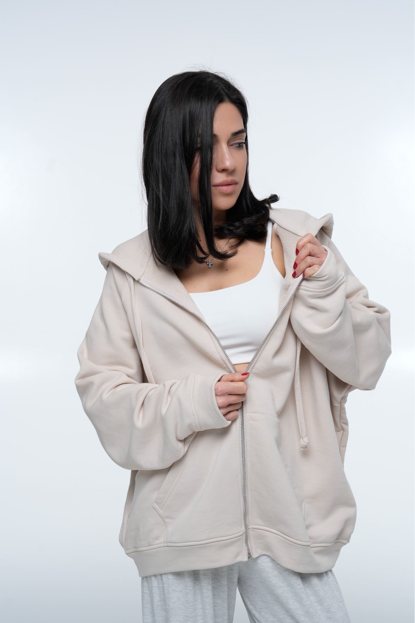 Худі на блискавці в ніжному бежевому відтінку виконане з м’якої тринитки-петлі, що забезпечує комфорт і легке тепло на щодень. Вільний крій створює розслаблений силует, не обмежує рухи та підходить на різні параметри (One size).