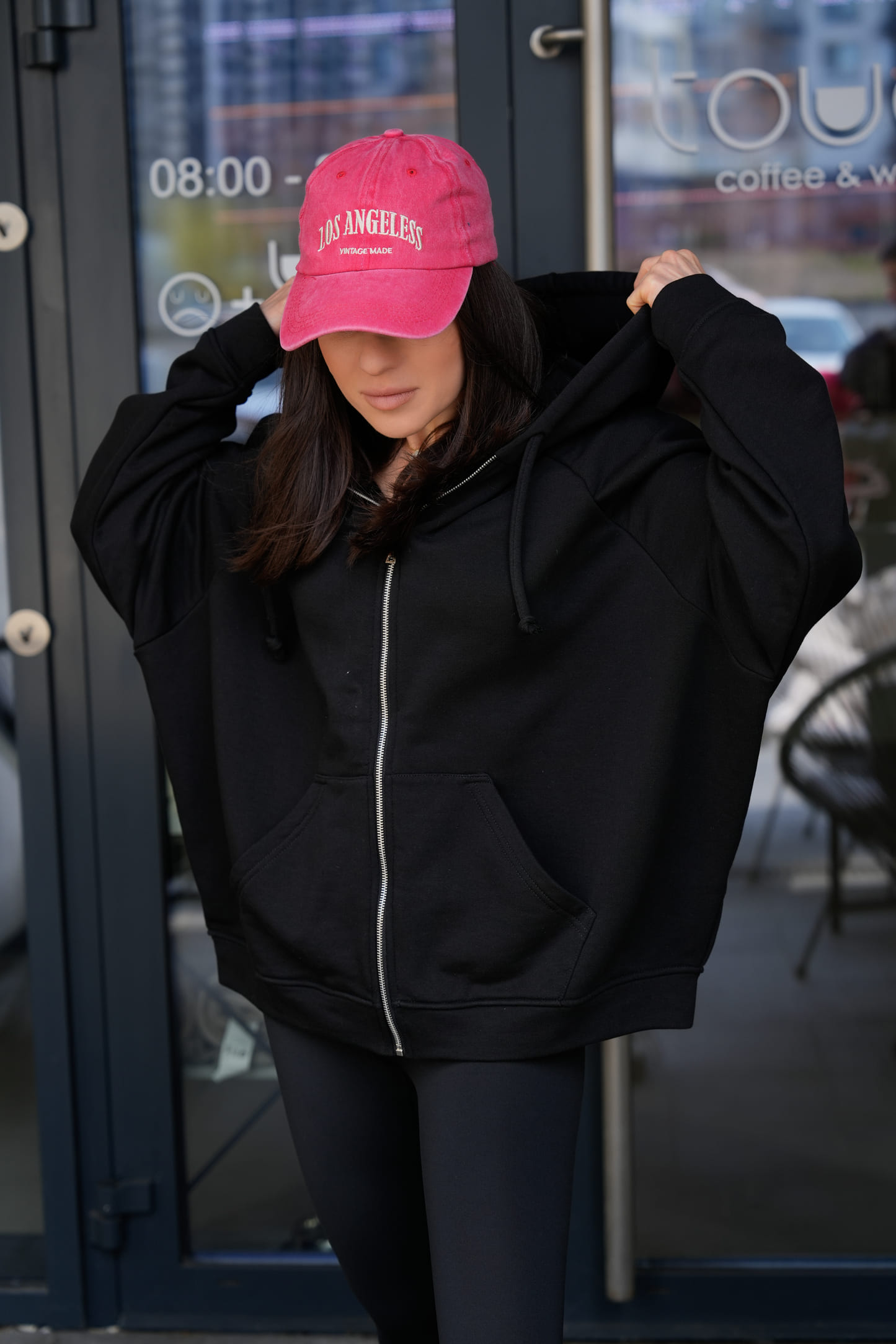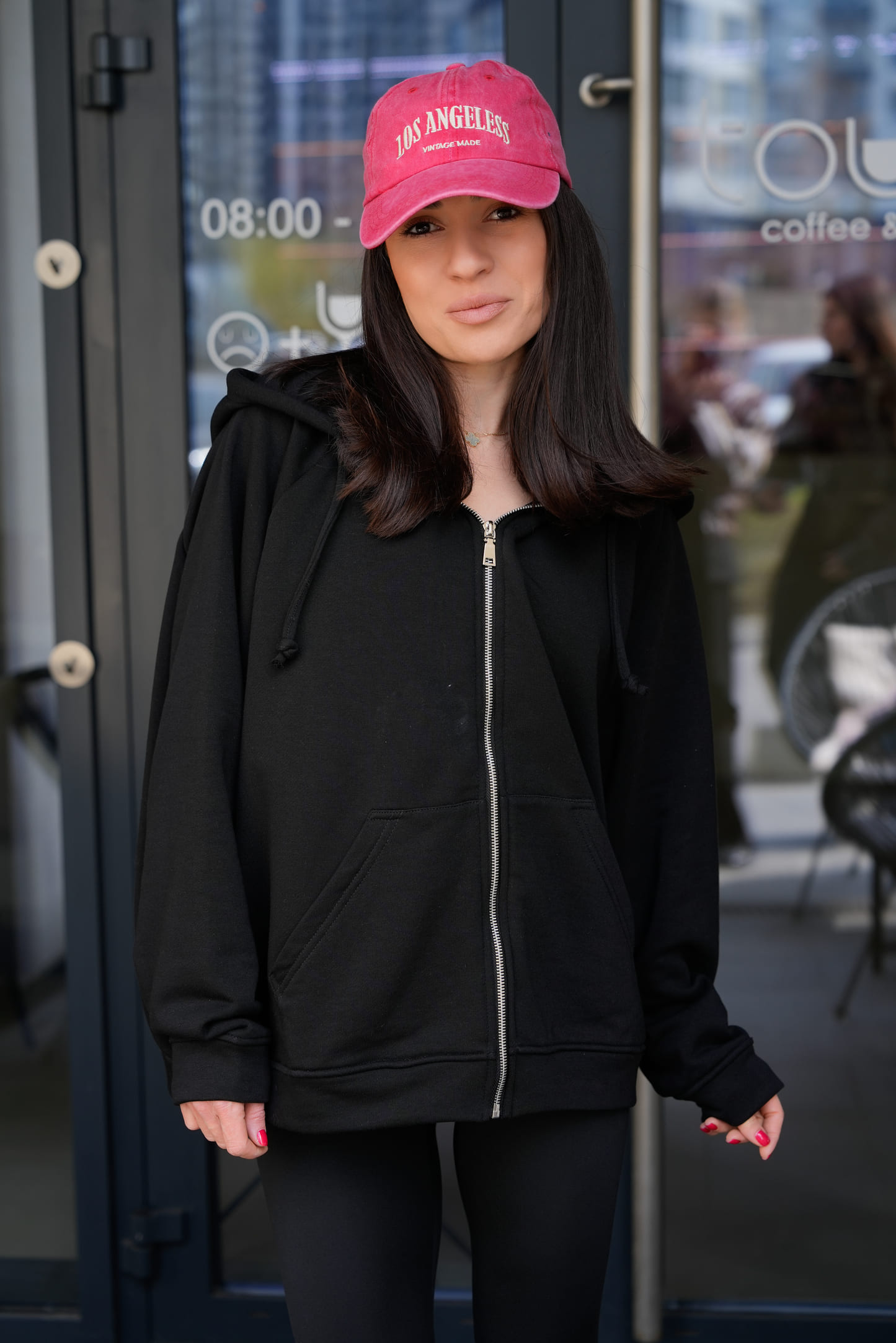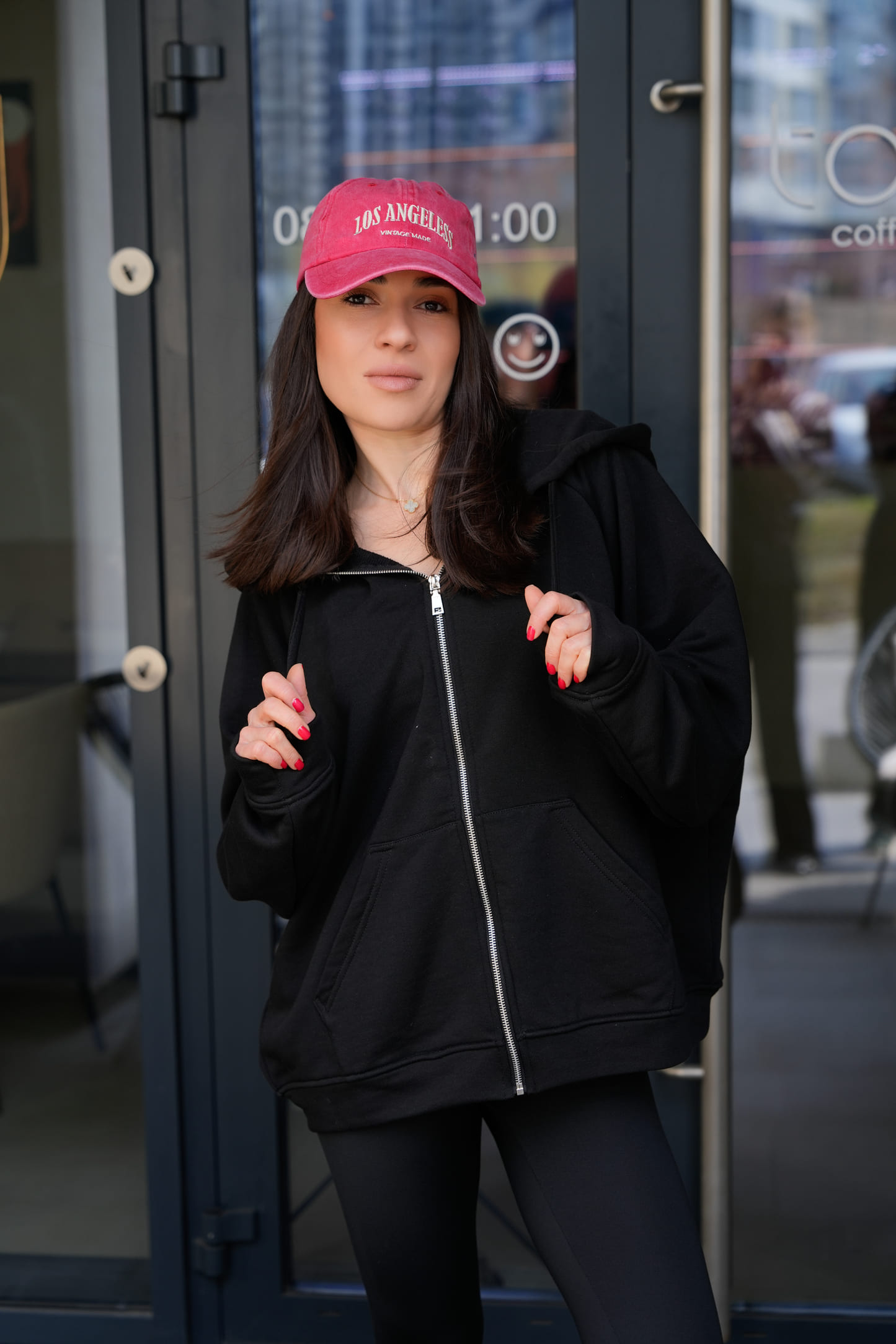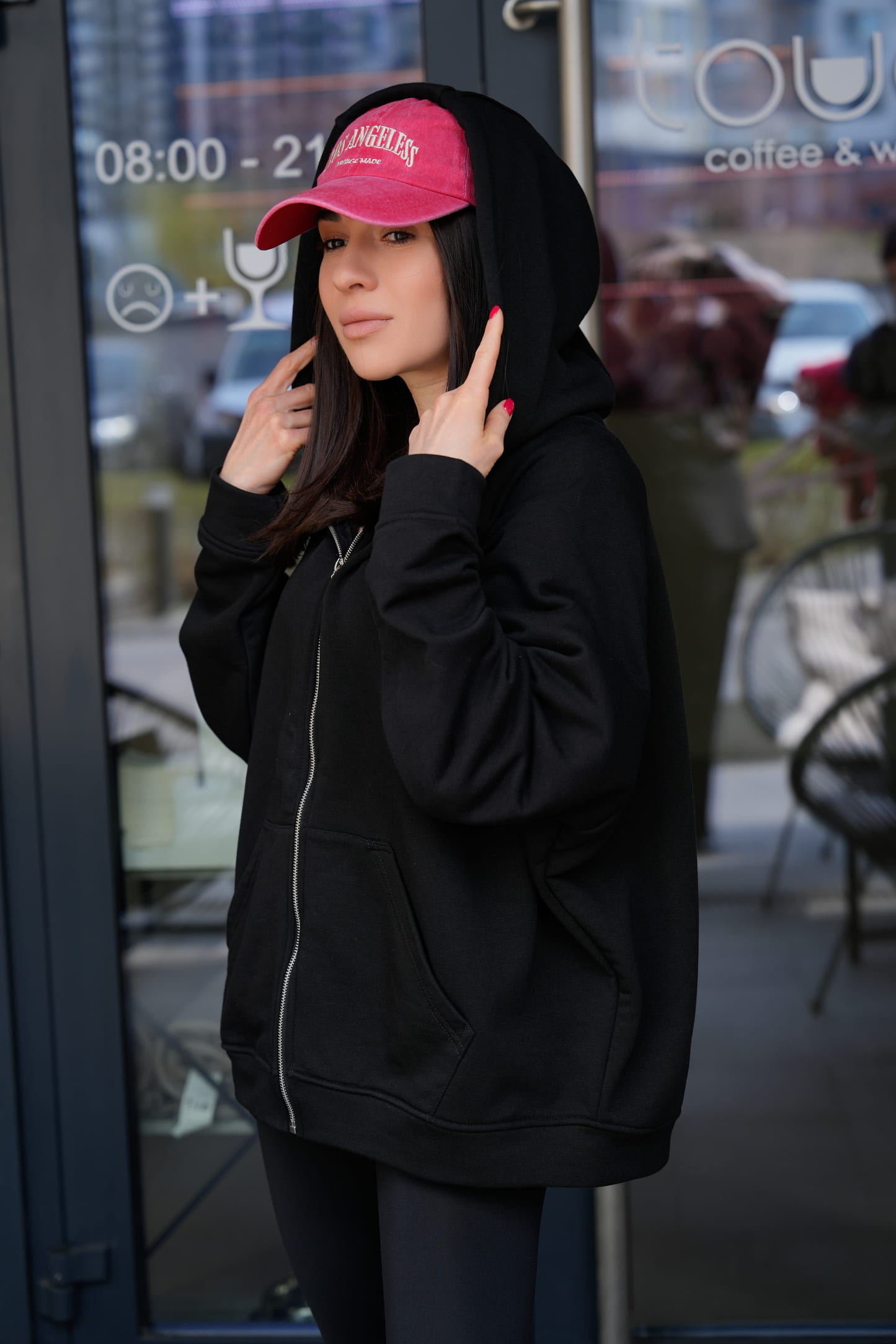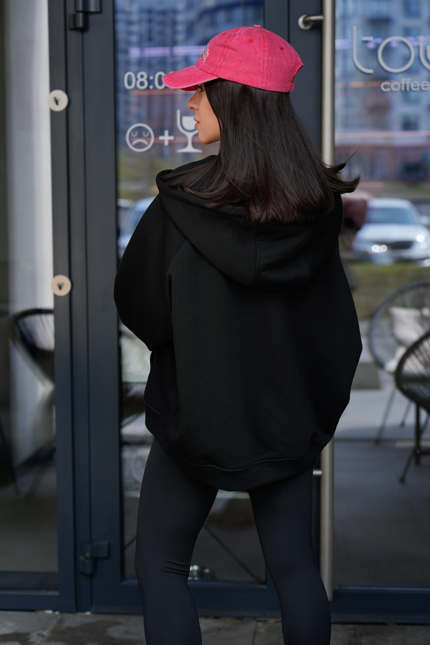 Глибокий чорний колір виглядає стримано та дорого, роблячи модель універсальною базою для будь-яких поєднань. Худі легко комбінується як з легінсами, так і з джинсами або спортивними штанами, формуючи збалансований повсякденний образ.