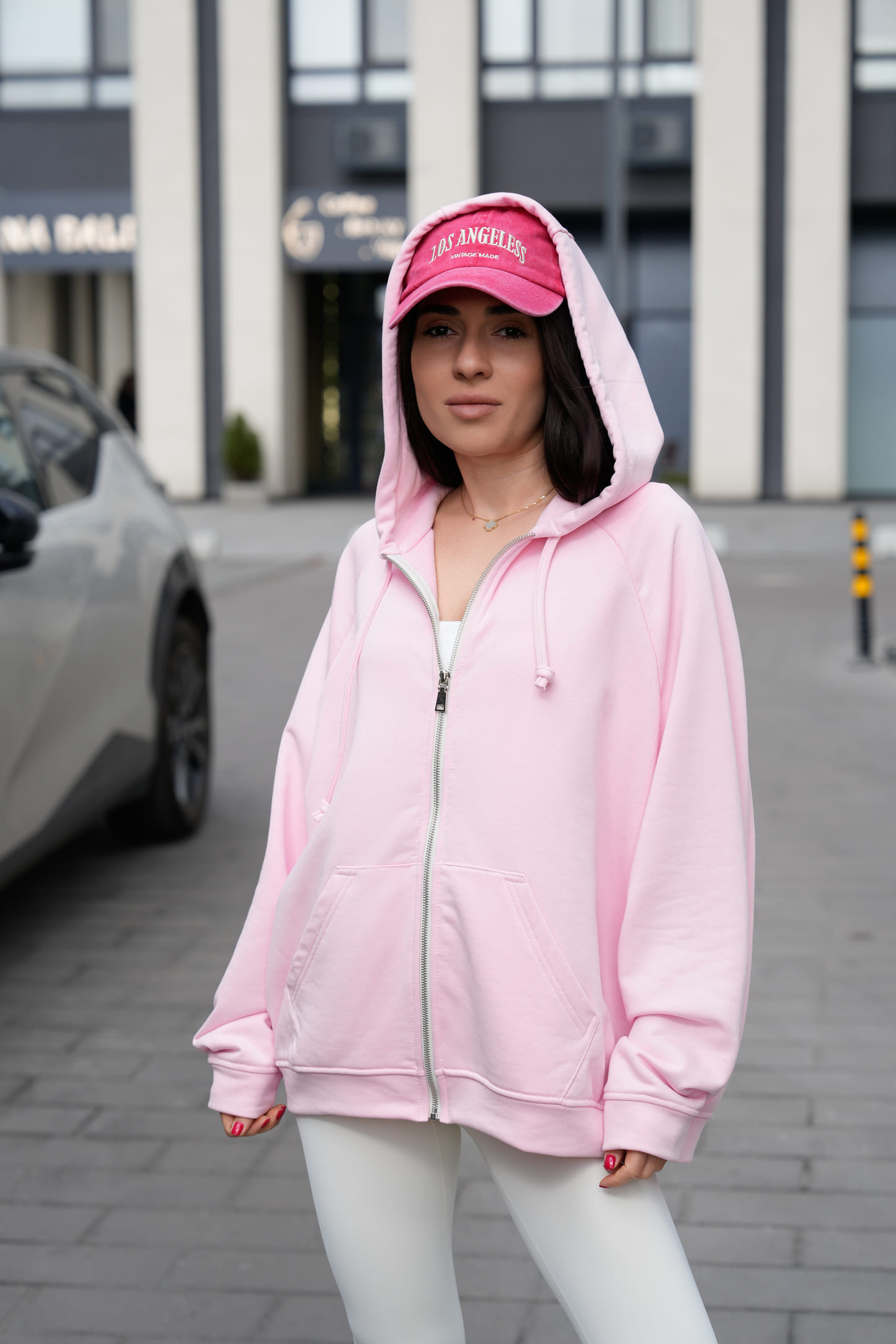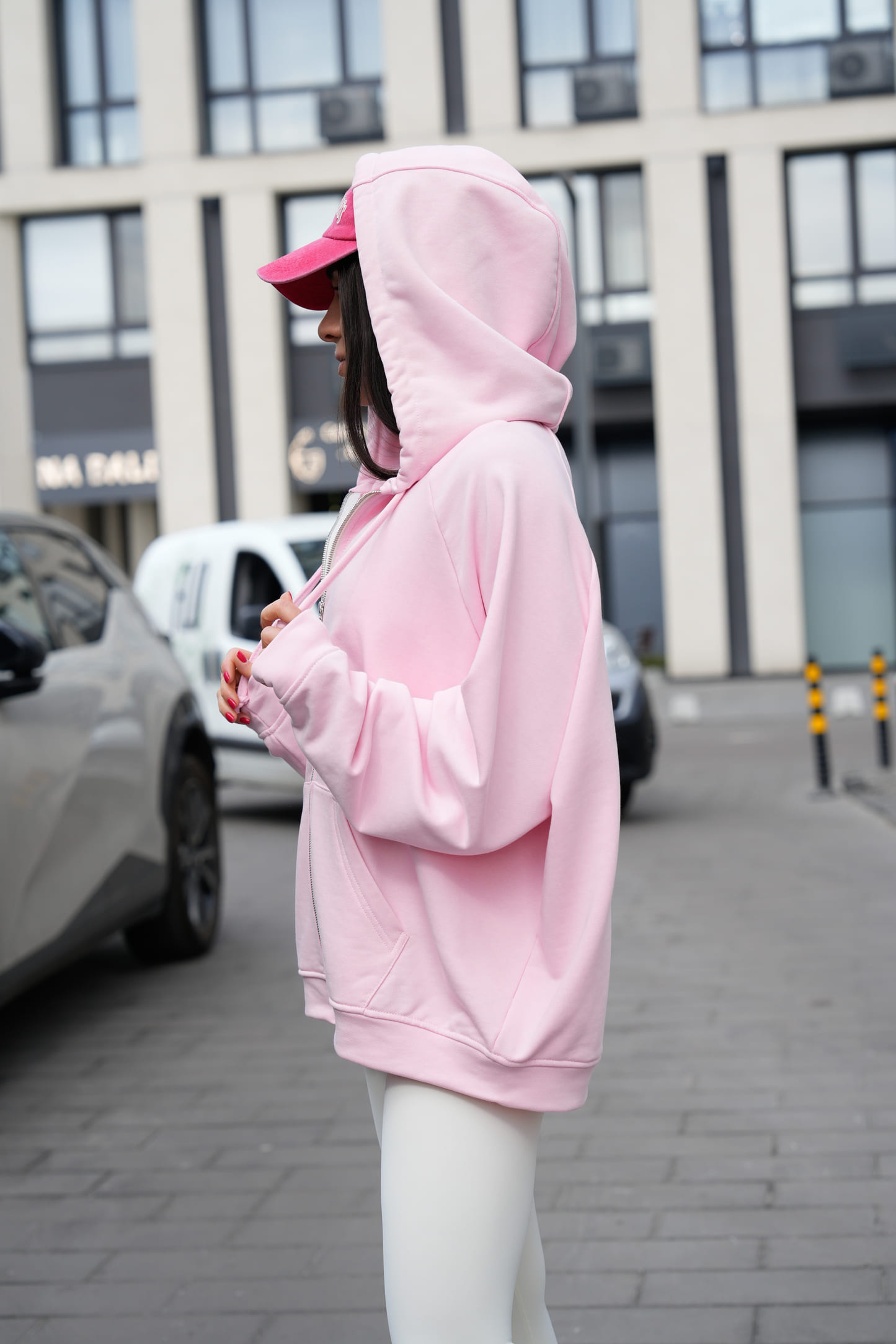 Металева блискавка по центру додає функціональності та створює акуратний контраст із ніжним відтінком тканини. Подвійний капюшон виглядає об’ємно, добре тримає форму та забезпечує додатковий комфорт, а шнурок дозволяє регулювати посадку.
