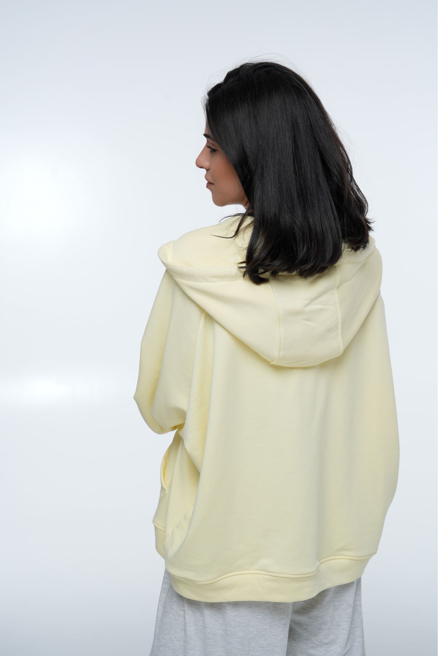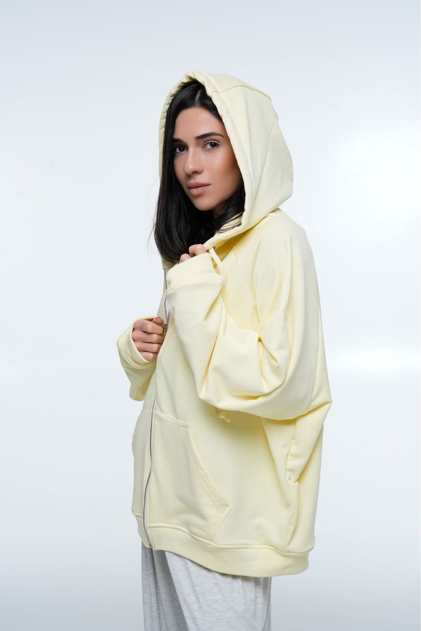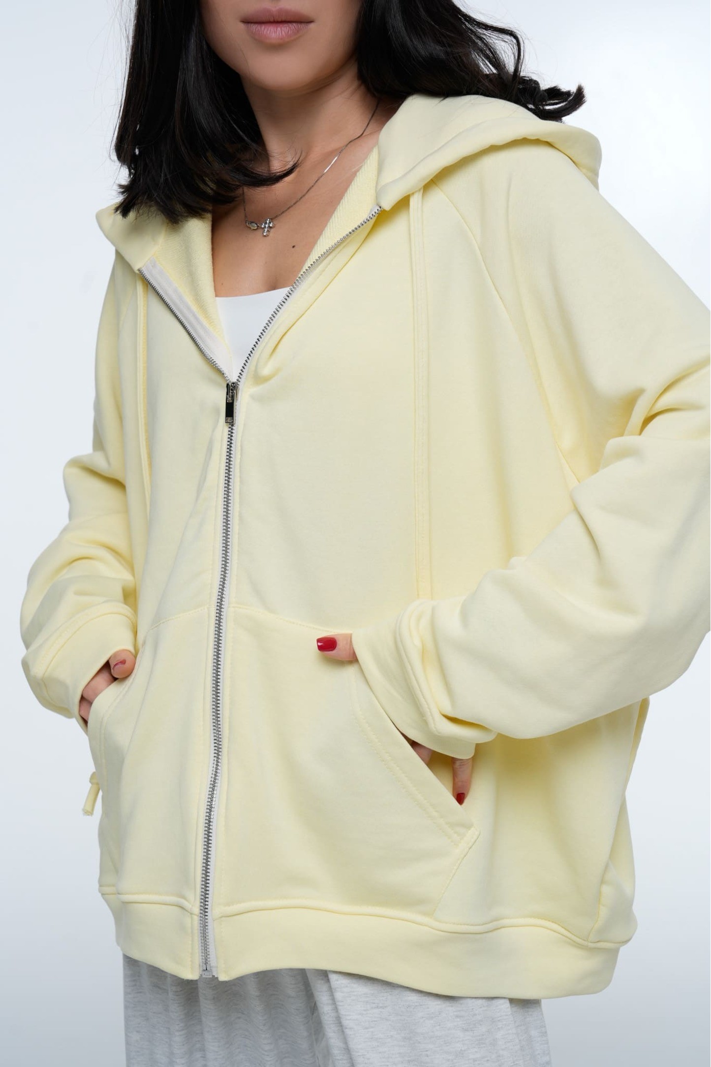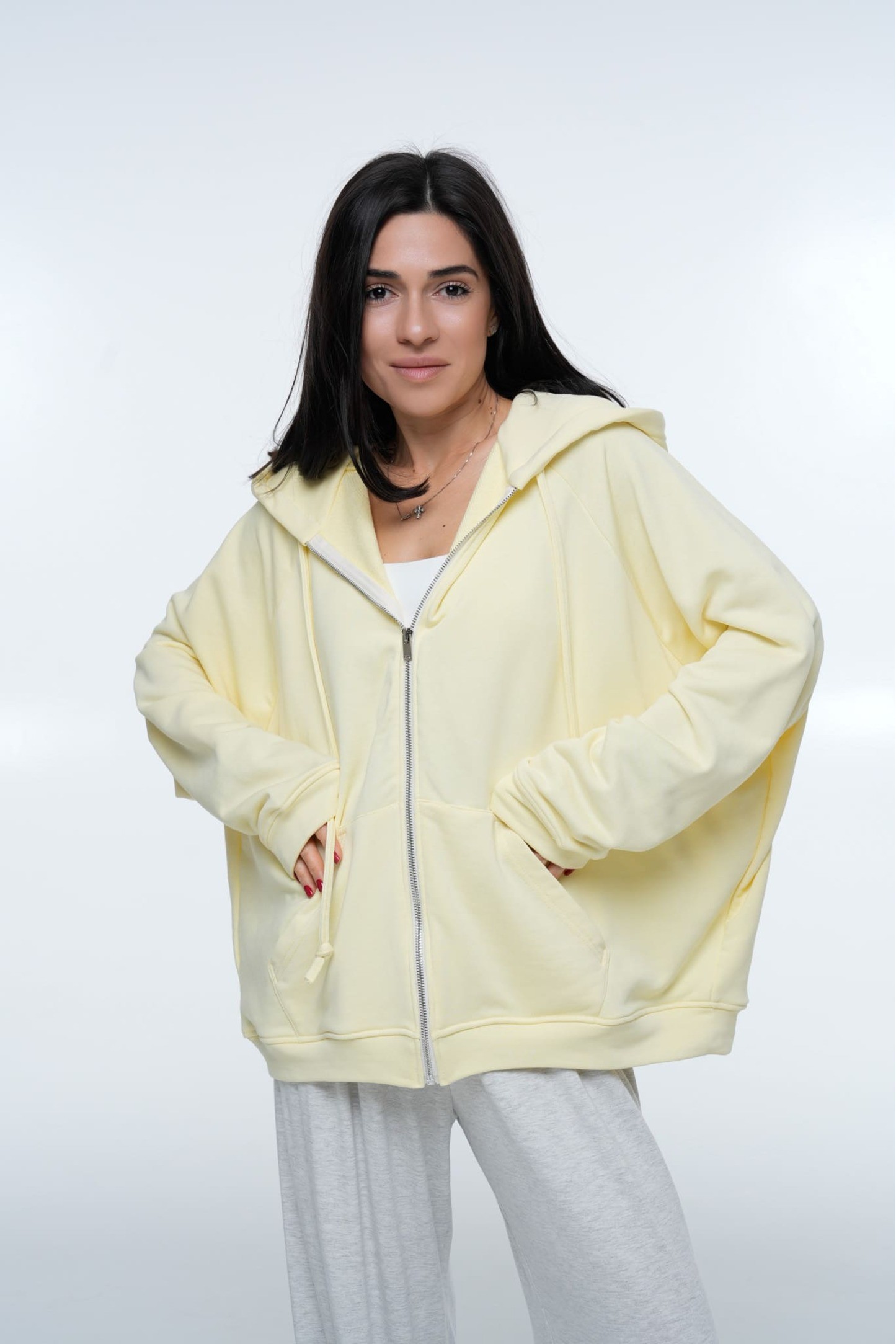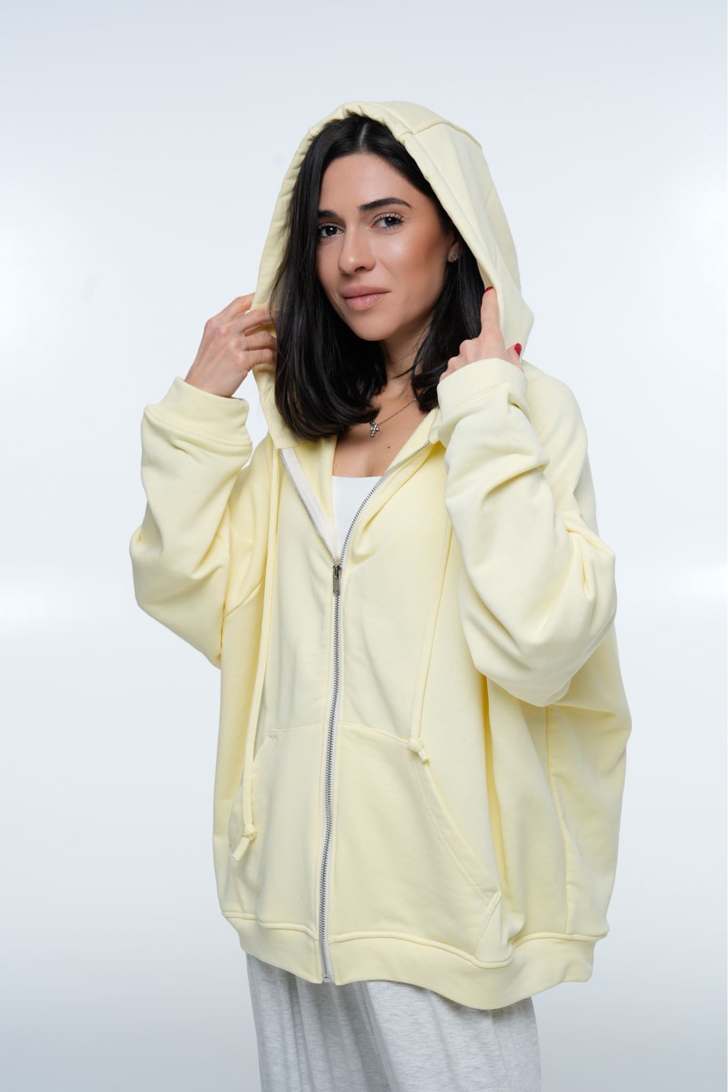 Худі виконане з якісної тринитки петлі, що забезпечує комфорт, м’якість та приємну щільність тканини. Модель представлена у ніжному лимонному кольорі, який виглядає свіжо та делікатно. Універсальний розмір One size створений для комфортної посадки на різні типи фігури.
