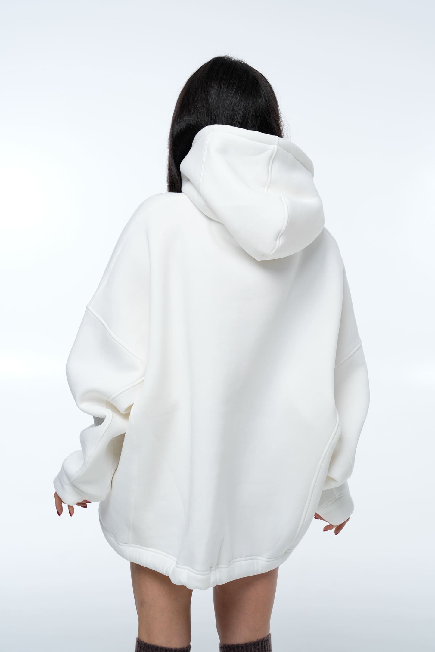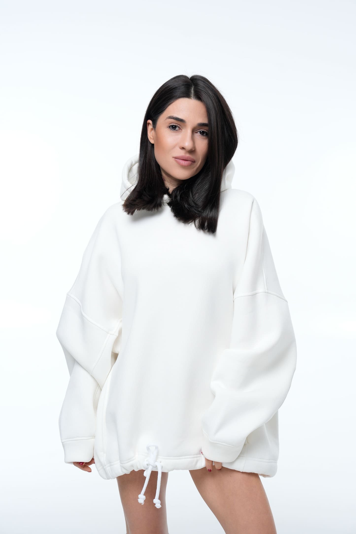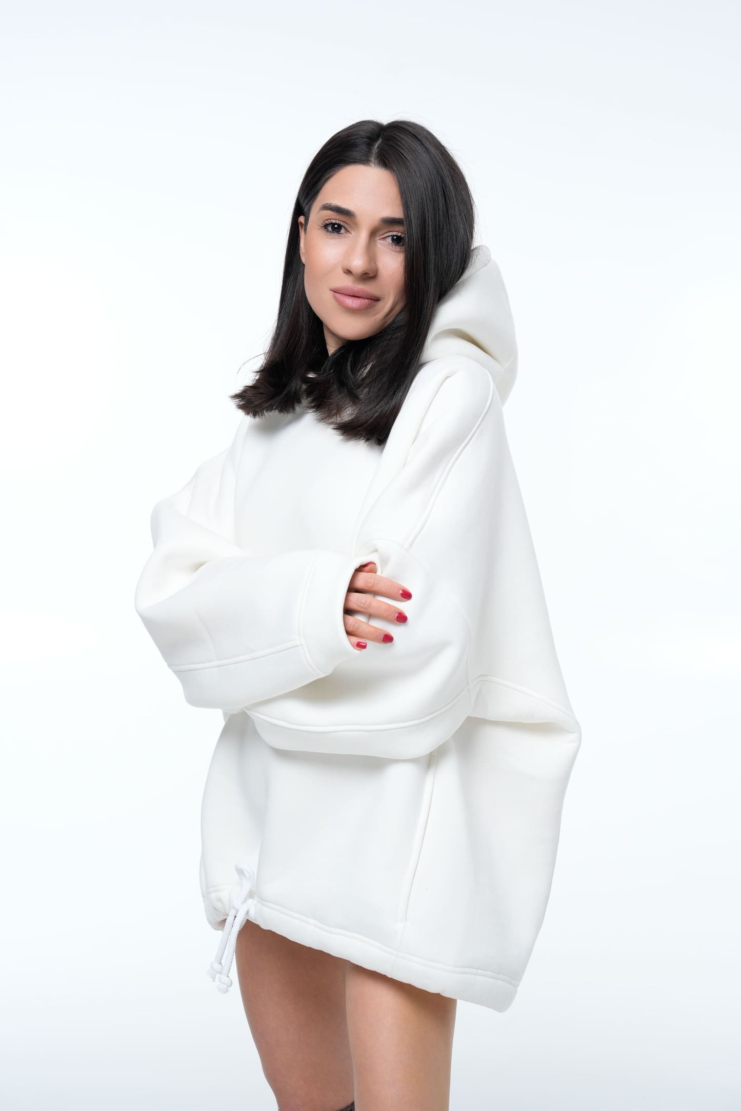 Стильне та ультракомфортне худі оверсайз формату, виконане з м’якого трикотажу на основі бавовни з флісовим утепленням. Модель має виражений об’ємний силует та подовжену лінію плечей, що створює трендовий relaxed-ефект. Молочний колір пасує до будь-якого гардероба та виглядає особливо ніжно й дорого.