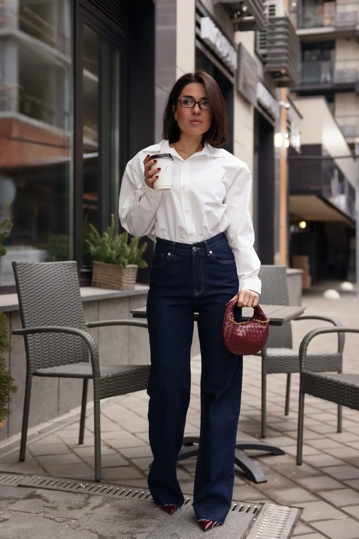 - Біла сорочка + джинси + жакет + універсальне взуття — цей ансамбль підходить як для роботи, так і для прогулянок містом, виглядає сучасно та елегантно.