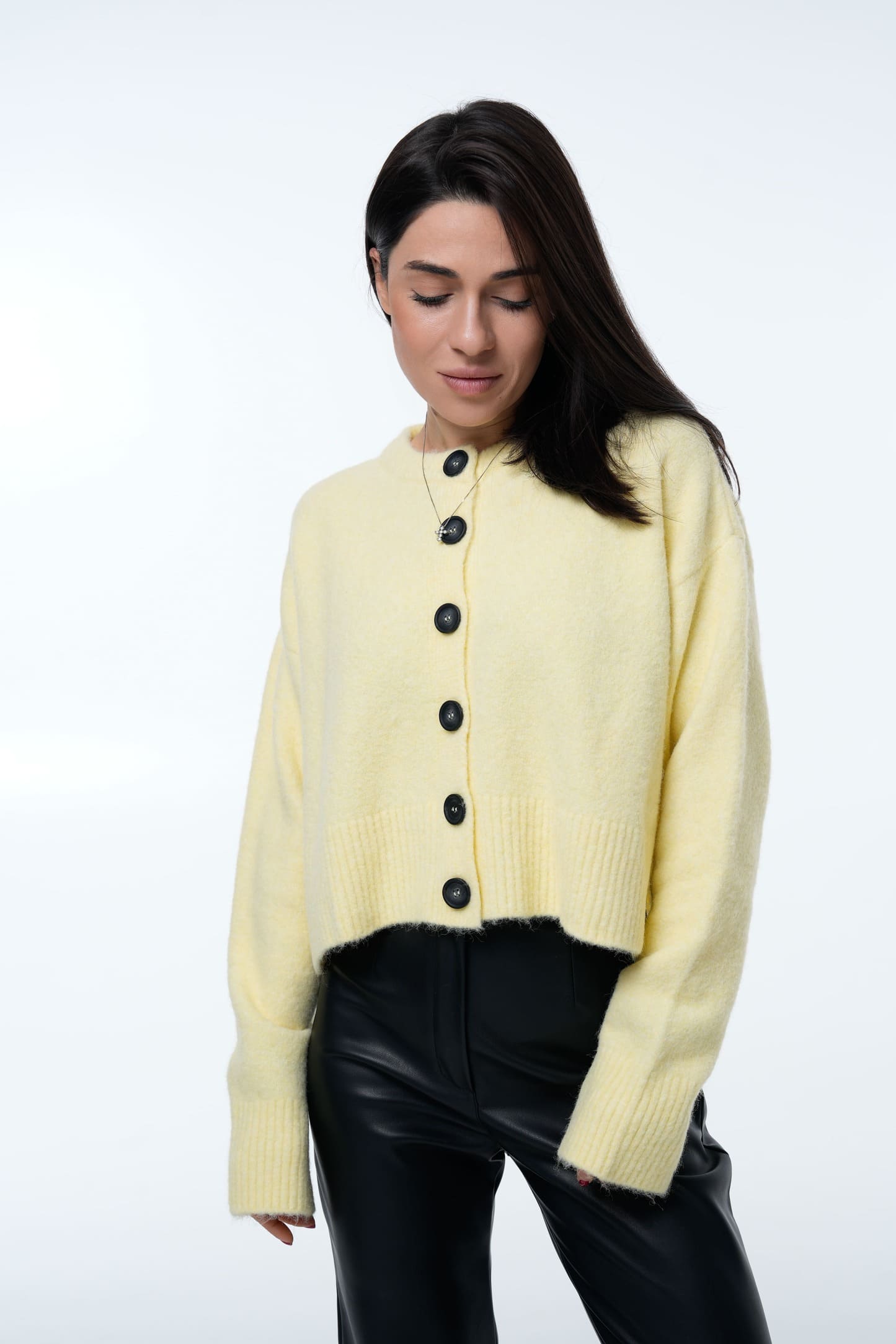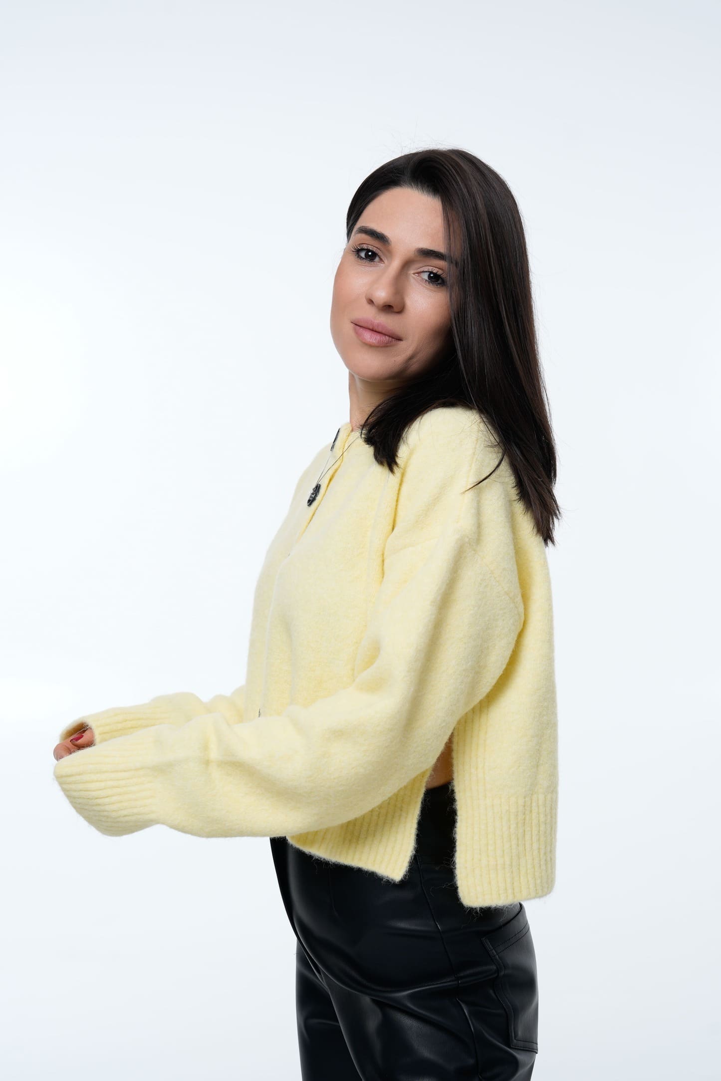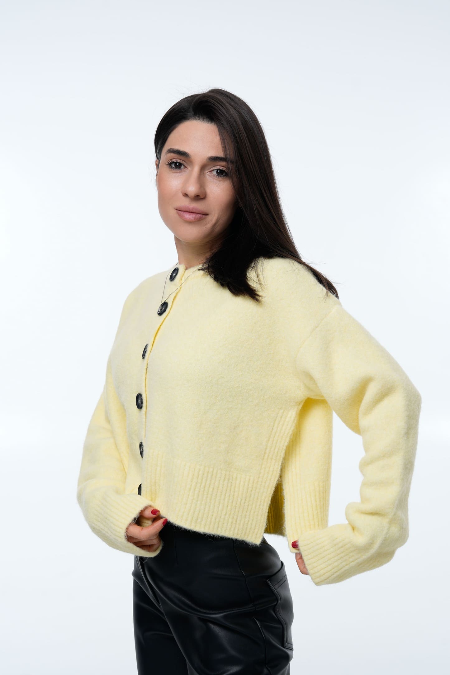 Кардиган Lemon Dream — це стильна, м’яка та надзвичайно комфортна модель у ніжному лимонному кольорі. Виконаний із поєднання теплих і зносостійких волокон, він ідеально підійде для прохолодних днів та різноманітних образів — від повсякденного до більш вишуканого.