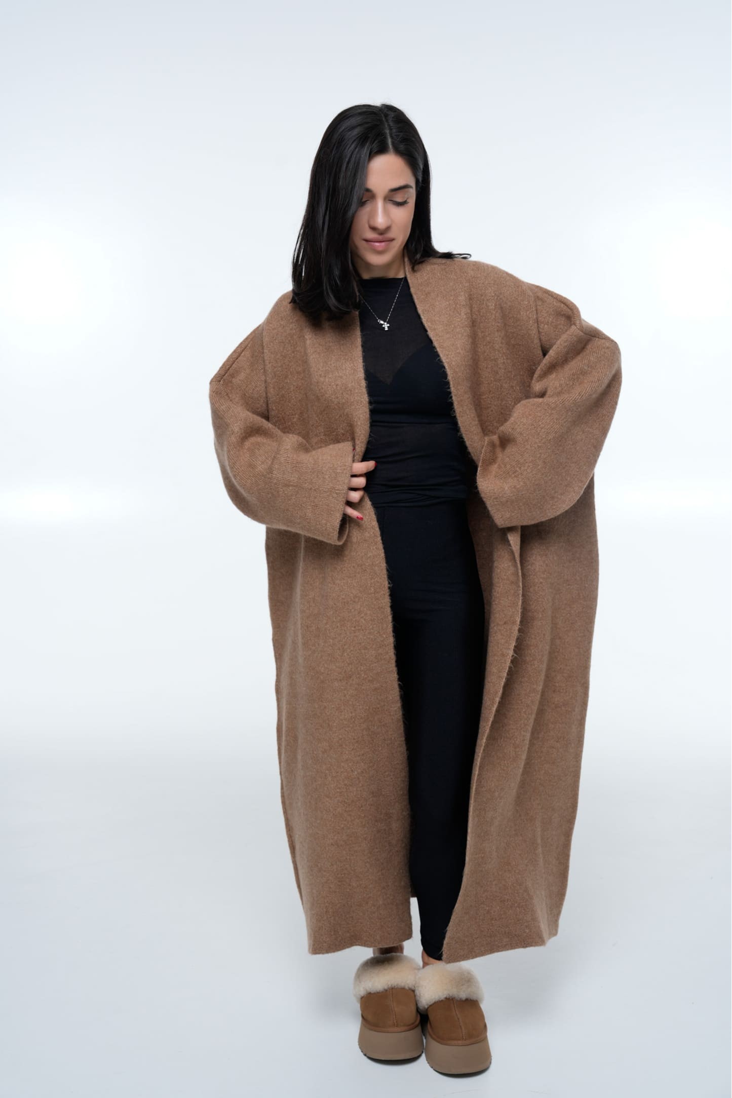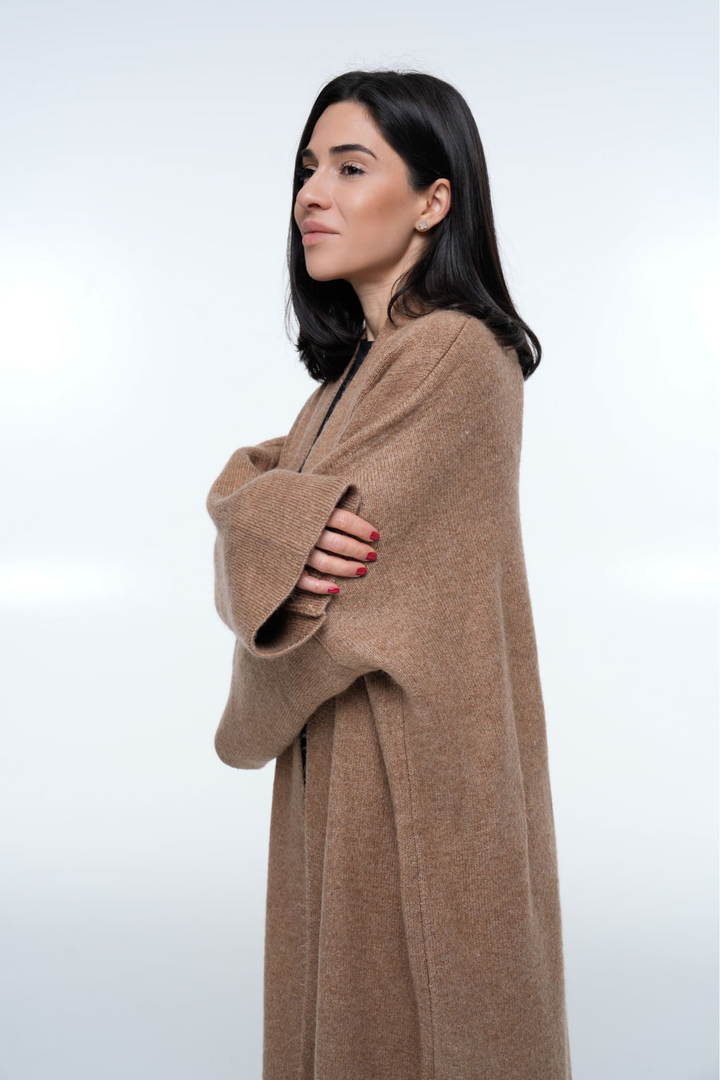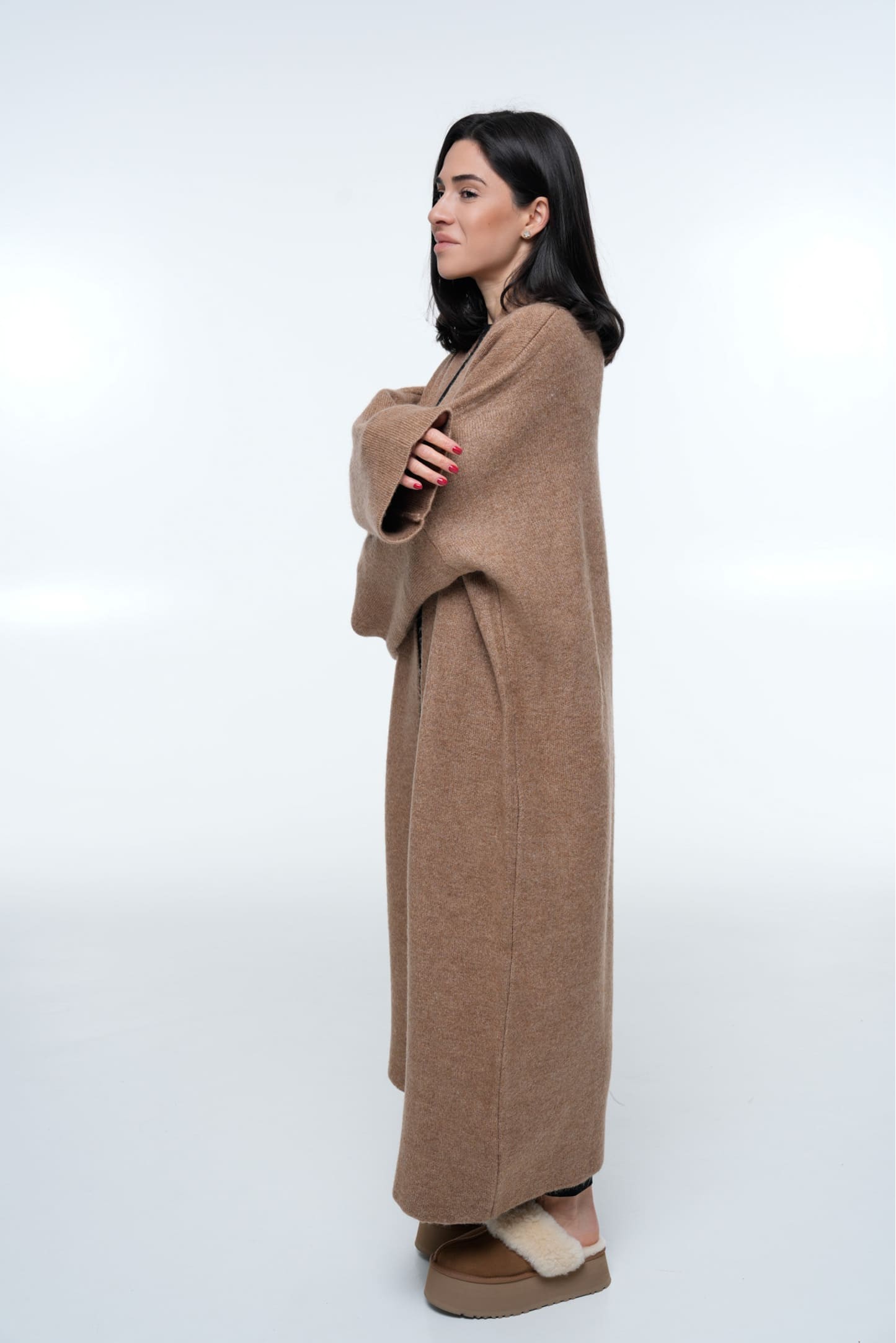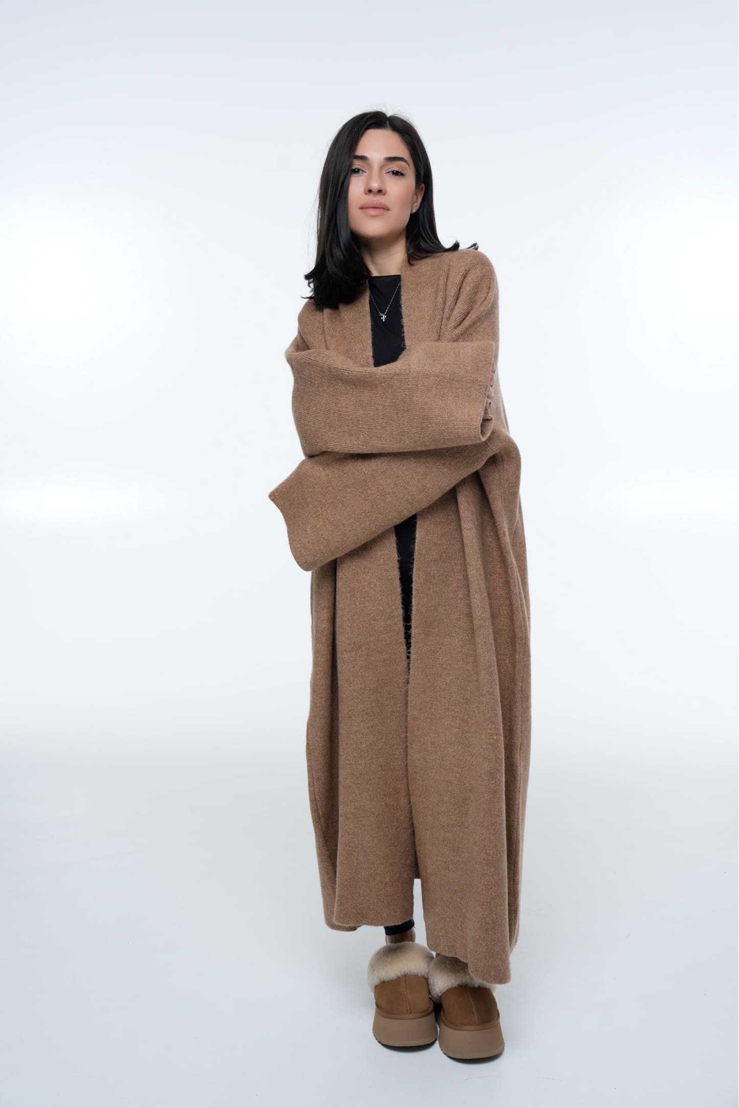 Силует — вільний оверсайз, зі спущеною лінією плеча та широкими рукавами, які формують розслаблений, але дорогий вигляд. Довжина maxi створює ефект накидки-пальта, що додає кардигану універсальності: його можна носити і з базовими луками, і з більш стильними аутфітами.