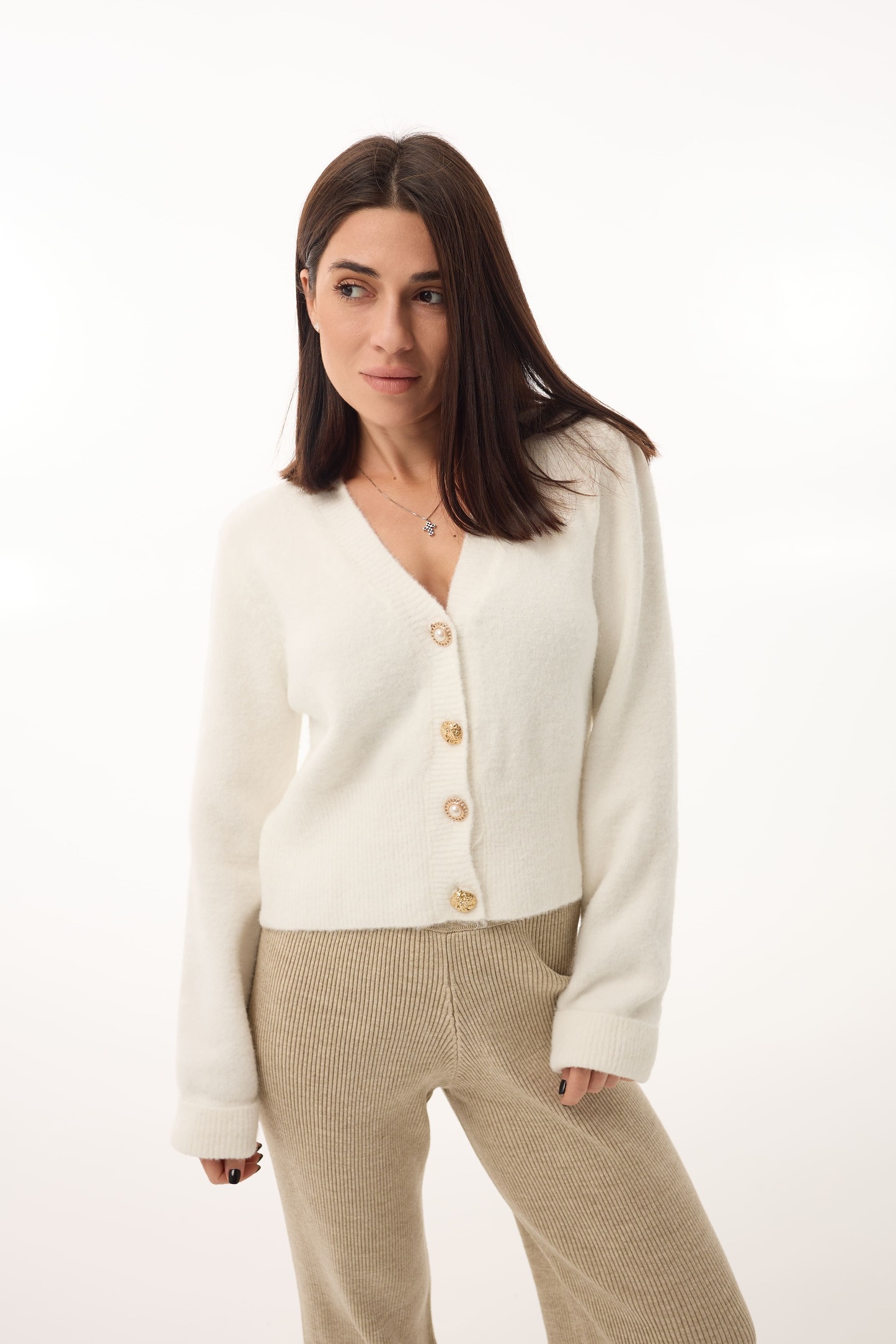 Цей білий кардиган створений для тих, хто цінує лаконічність і вишукані акценти. Завдяки перламутровим гудзикам він легко стає акцентом у повсякденному або вечірньому образі.