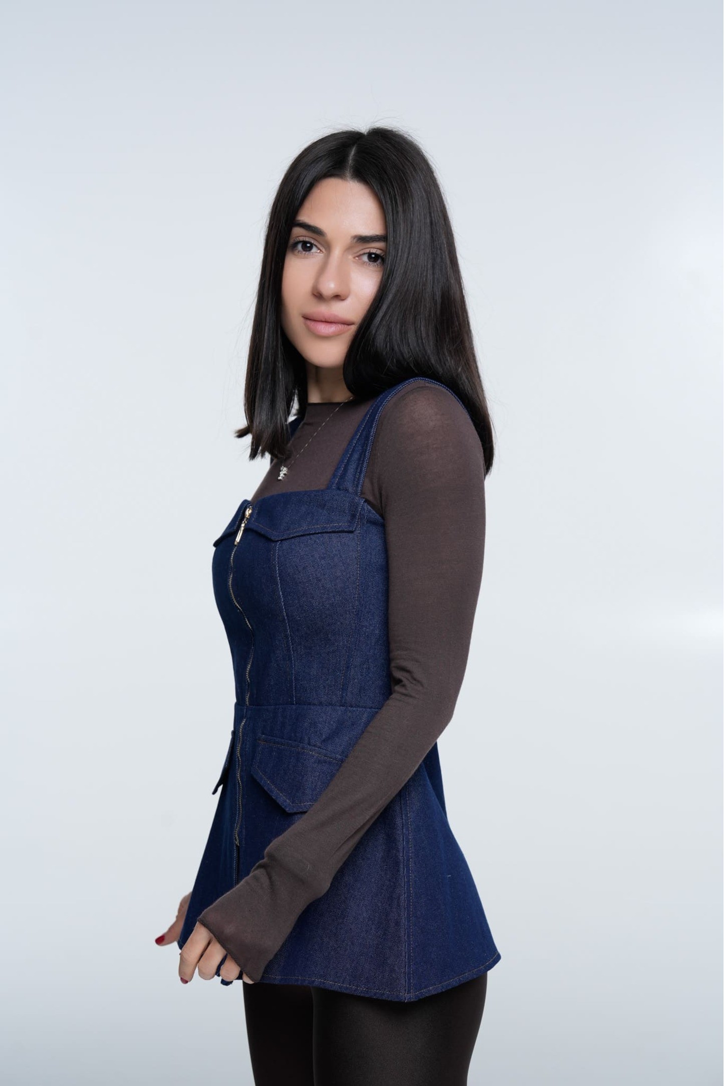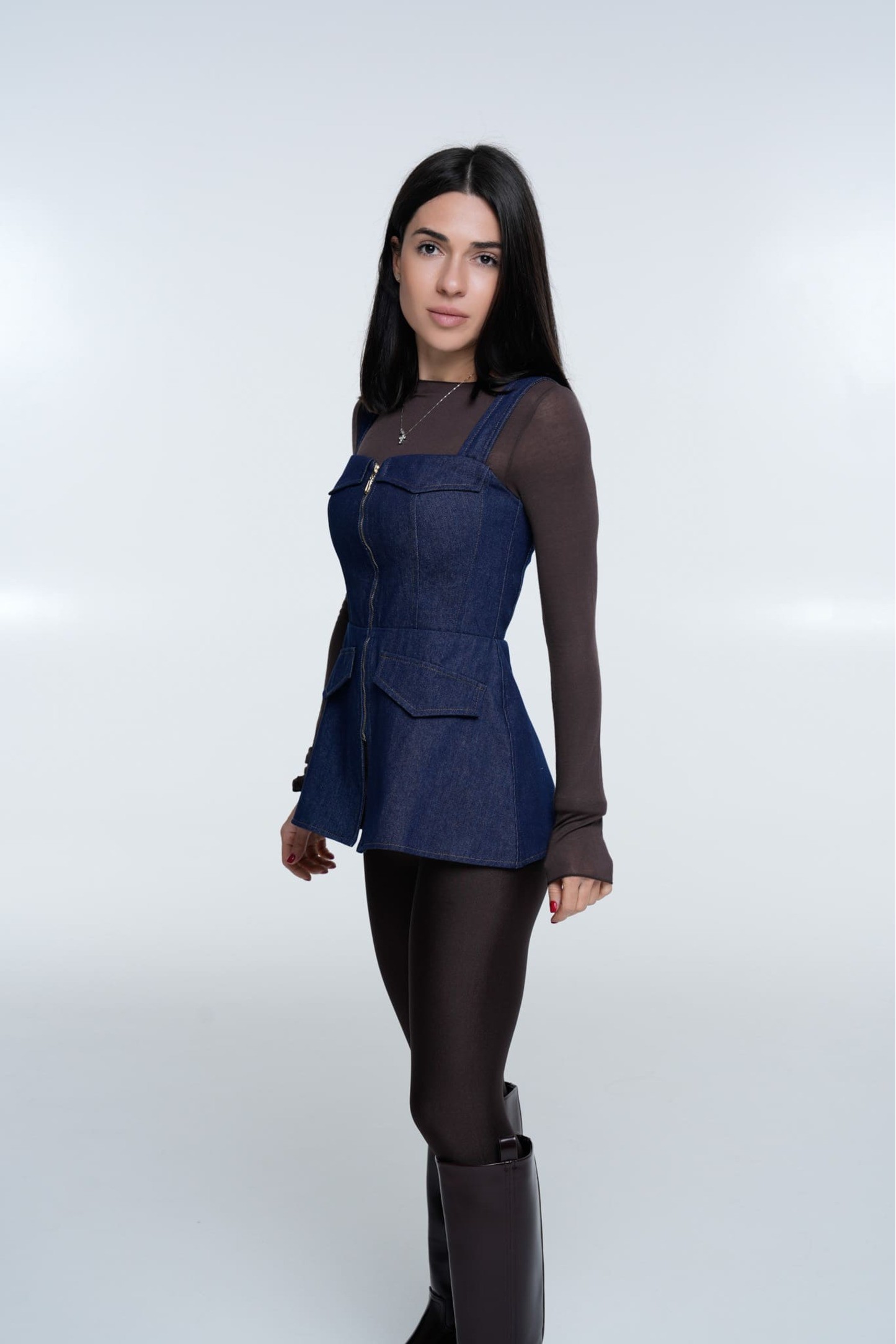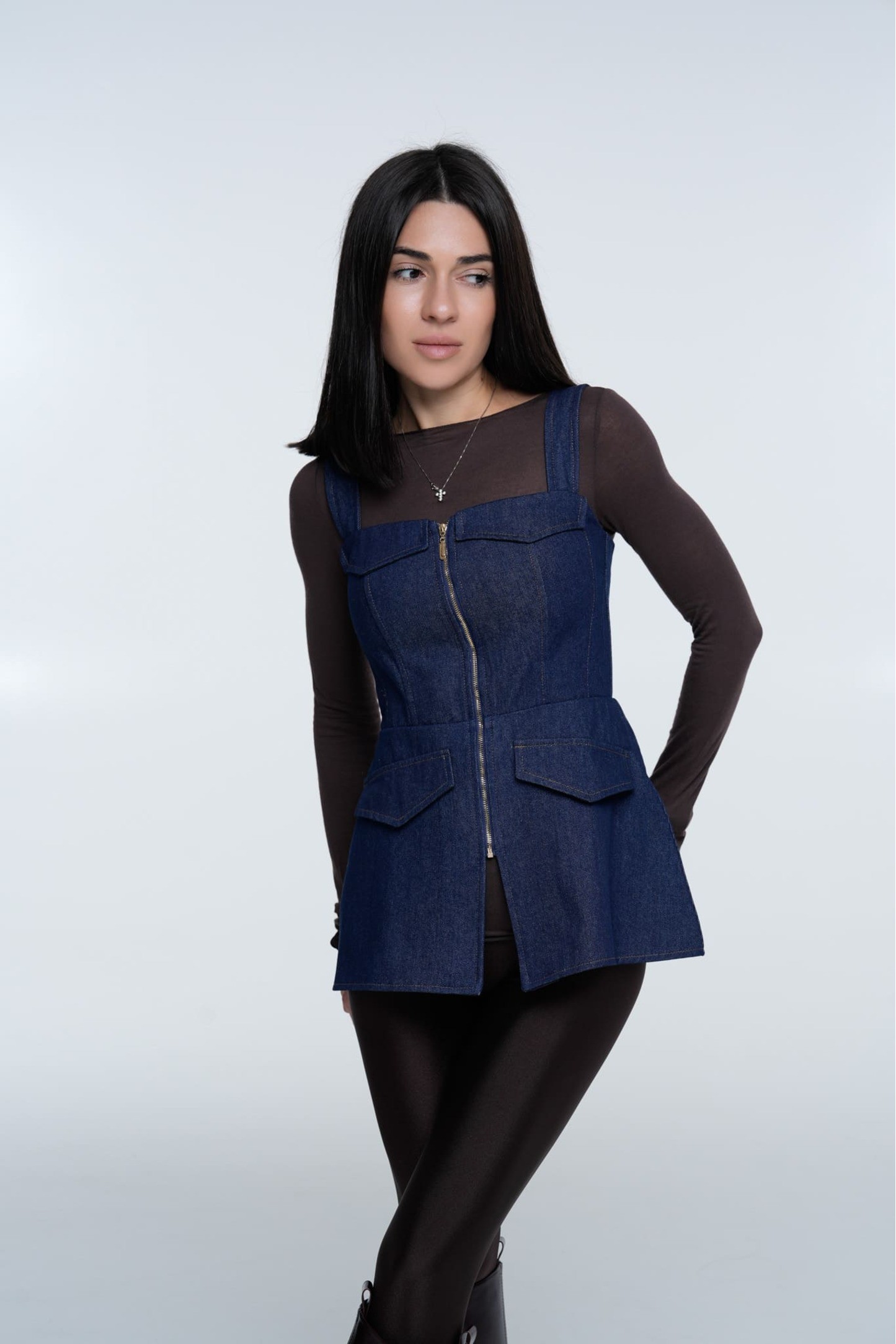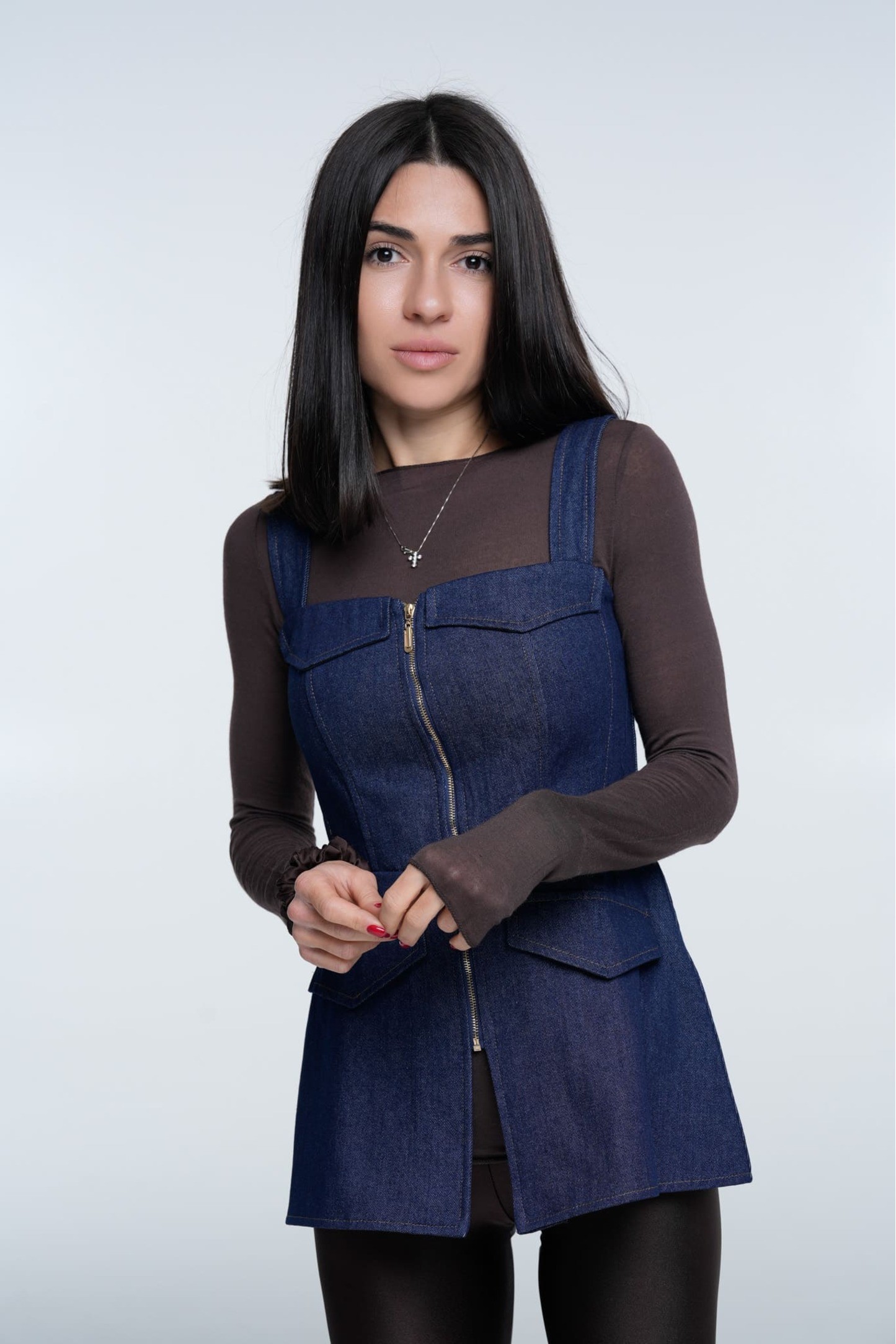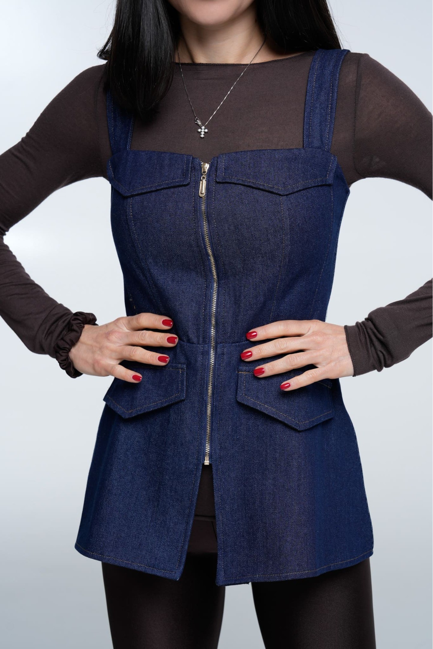 По центру розташована металева блискавка, що додає виробу сучасного акценту та забезпечує комфорт у щоденному носінні. На грудях та нижче талії розміщені декоративні клапани — вони повторюють стилістику класичних кишень, але виконують суто дизайнерську функцію, роблячи образ більш фактурним та стильним.