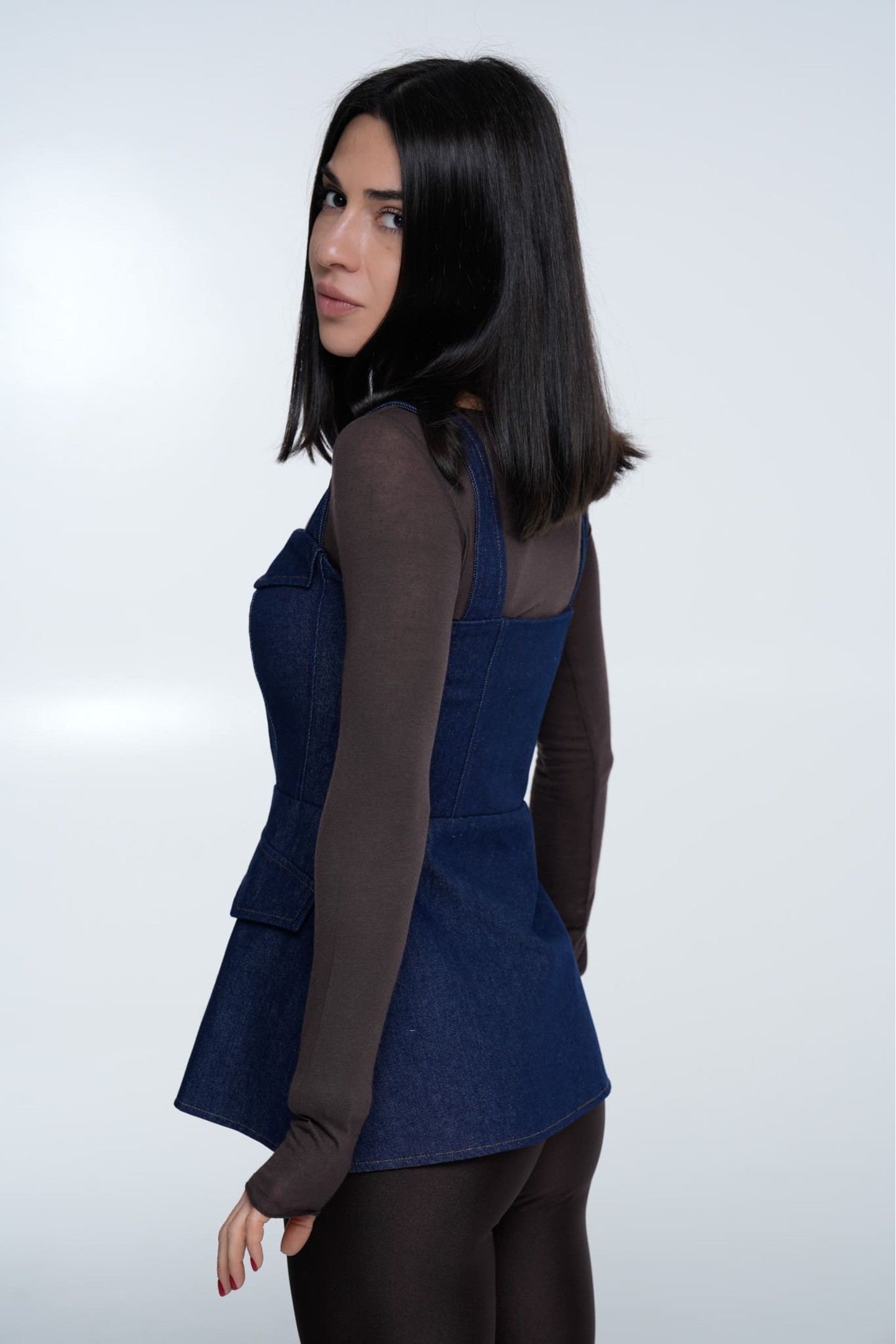 Корсет Denim Structure Deep Blue виконаний із щільного котонового деніму глибокого темно-синього відтінку, який зберігає форму та красиво окреслює силует. Модель створена з акцентом на чітку посадку: відвертний верхній край грудей, фігурні рельєфні лінії та грамотне формування талії забезпечують елегантний структурний вигляд.