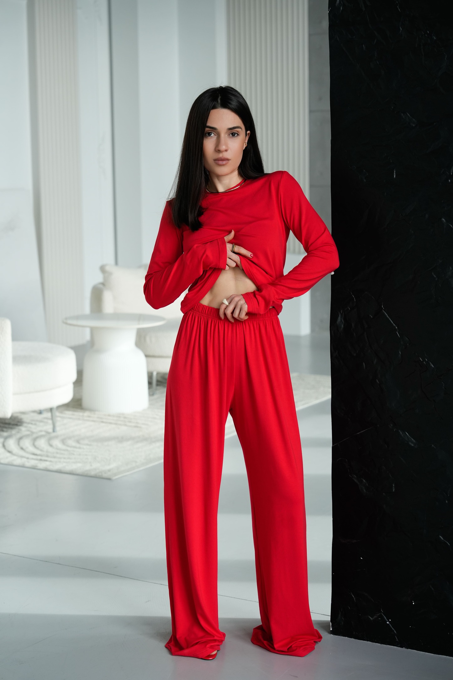 Червоний колір виглядає яскраво та ефектно, стаючи центральним елементом образу. Такий костюм ідеально підходить для тих, хто хоче виділятися, не жертвуючи комфортом, і легко адаптується як для повсякденних виходів, так і для більш виразних стилізацій.