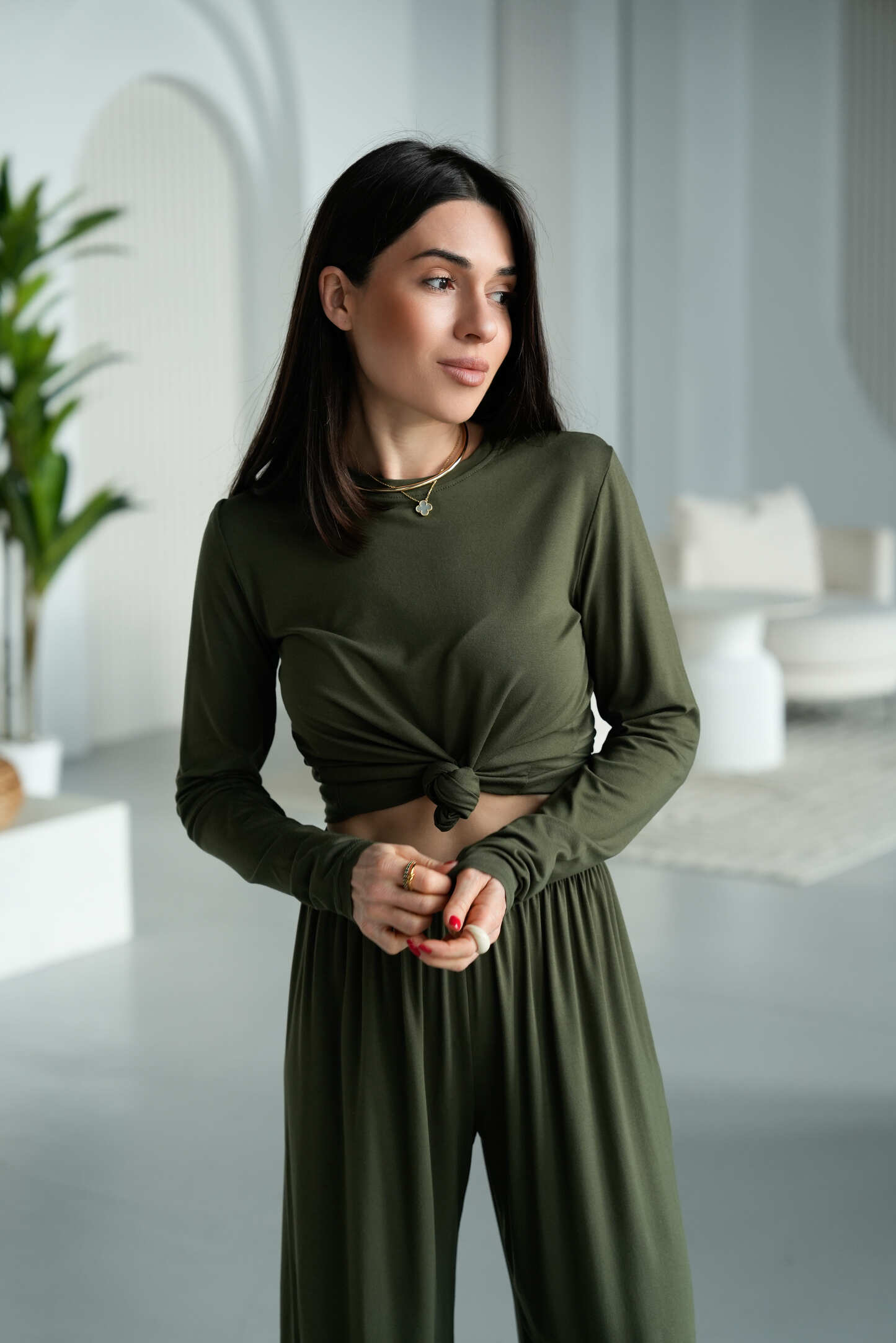 Верх представлений у вигляді лонгсліва з приталеною посадкою, який підкреслює фігуру, не обмежуючи рухів. Деталь із ефектом необроблених країв додає образу сучасного звучання та легкої недбалості. Лонгслів можна стилізувати різними способами: носити рівно або створювати акцентний вузол спереду, підкреслюючи лінію талії.