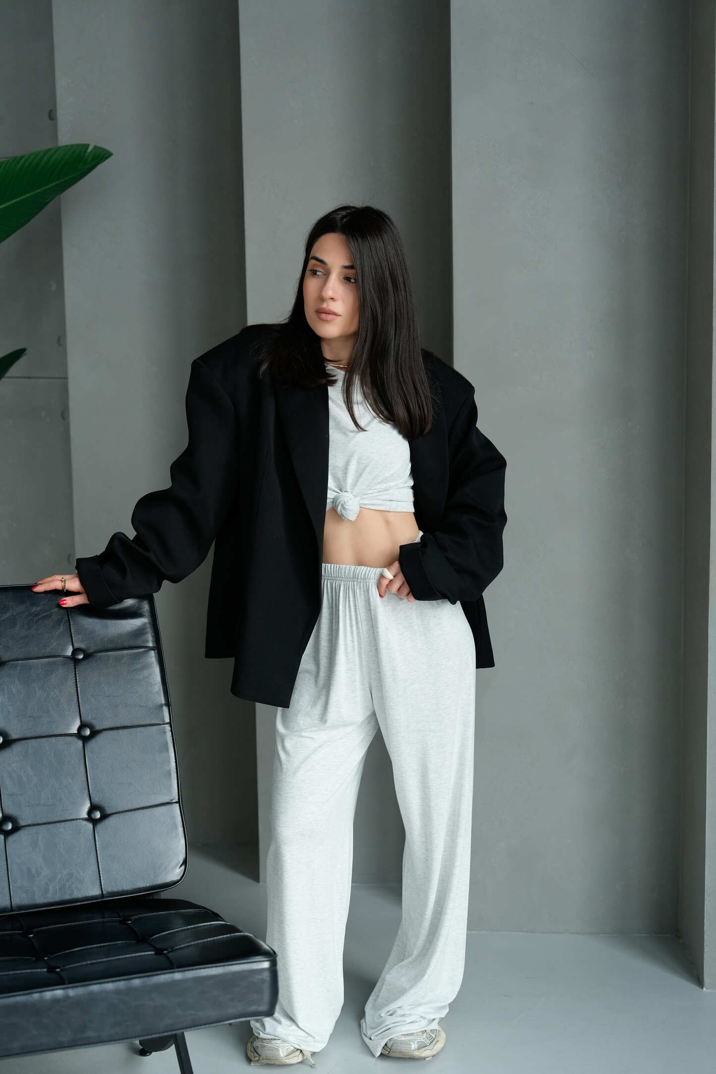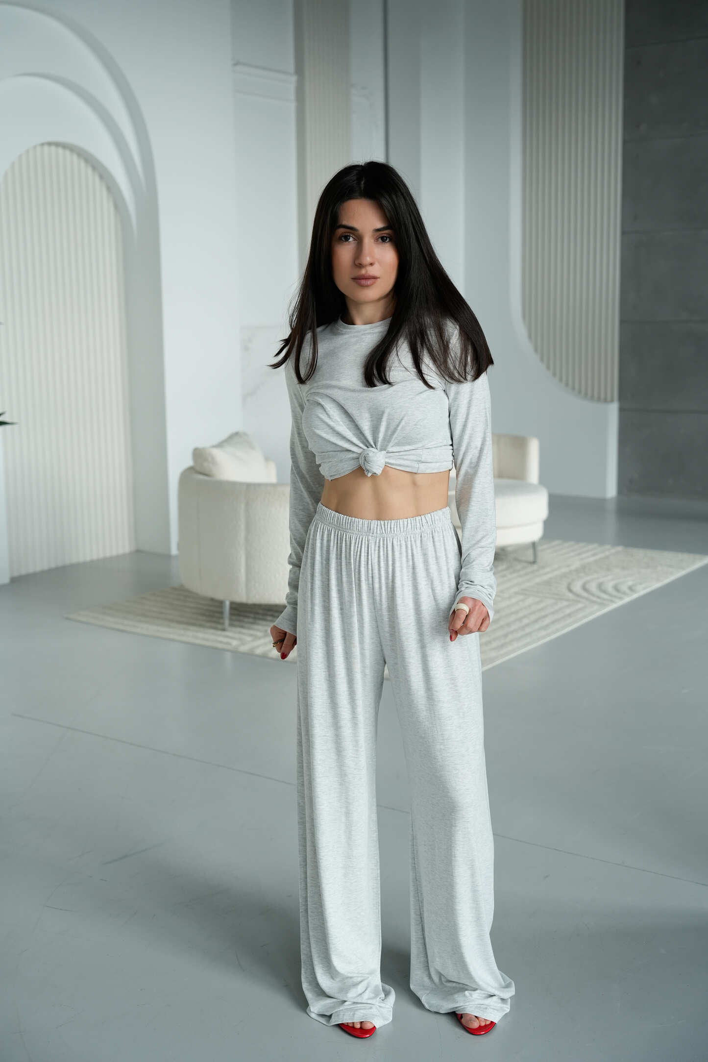 Костюм складається з двох елементів – лонгсліва з довгими рукавами та широких штанів з еластичним поясом. Лаконічний фасон робить комплект універсальним для створення як домашніх, так і вуличних образів.
