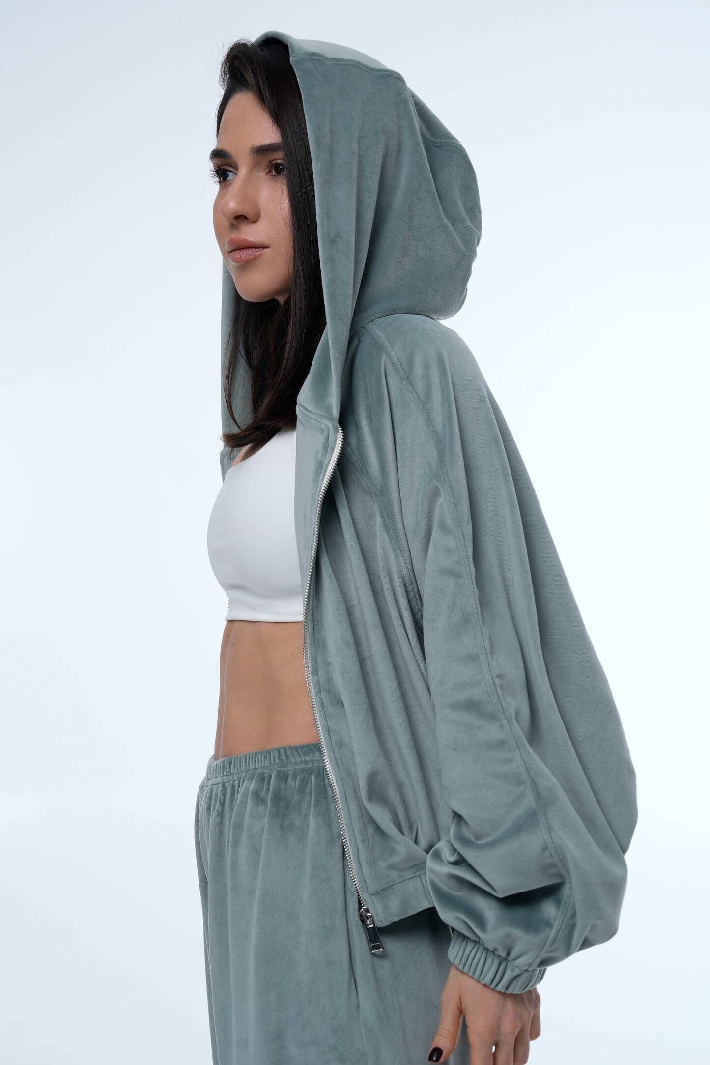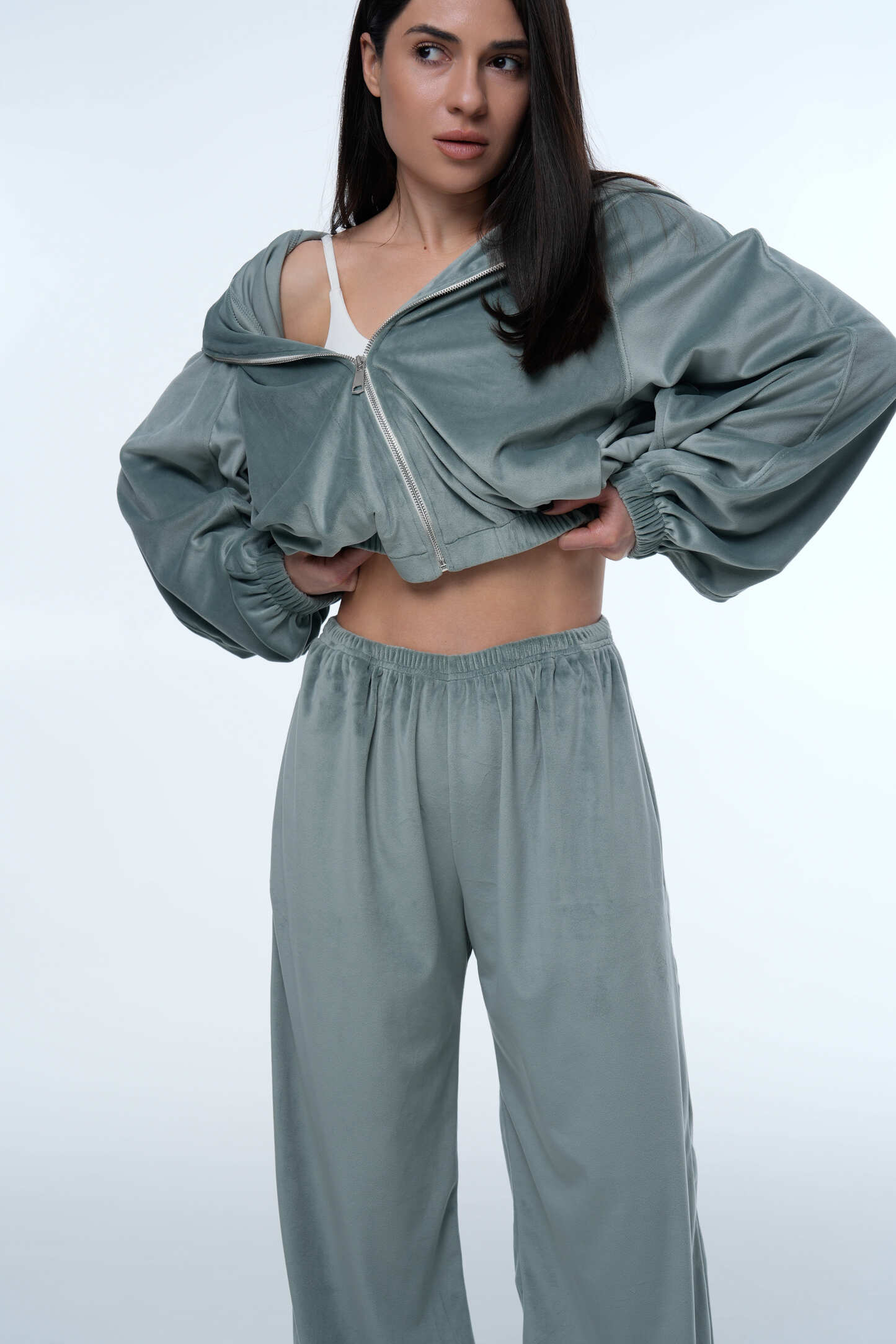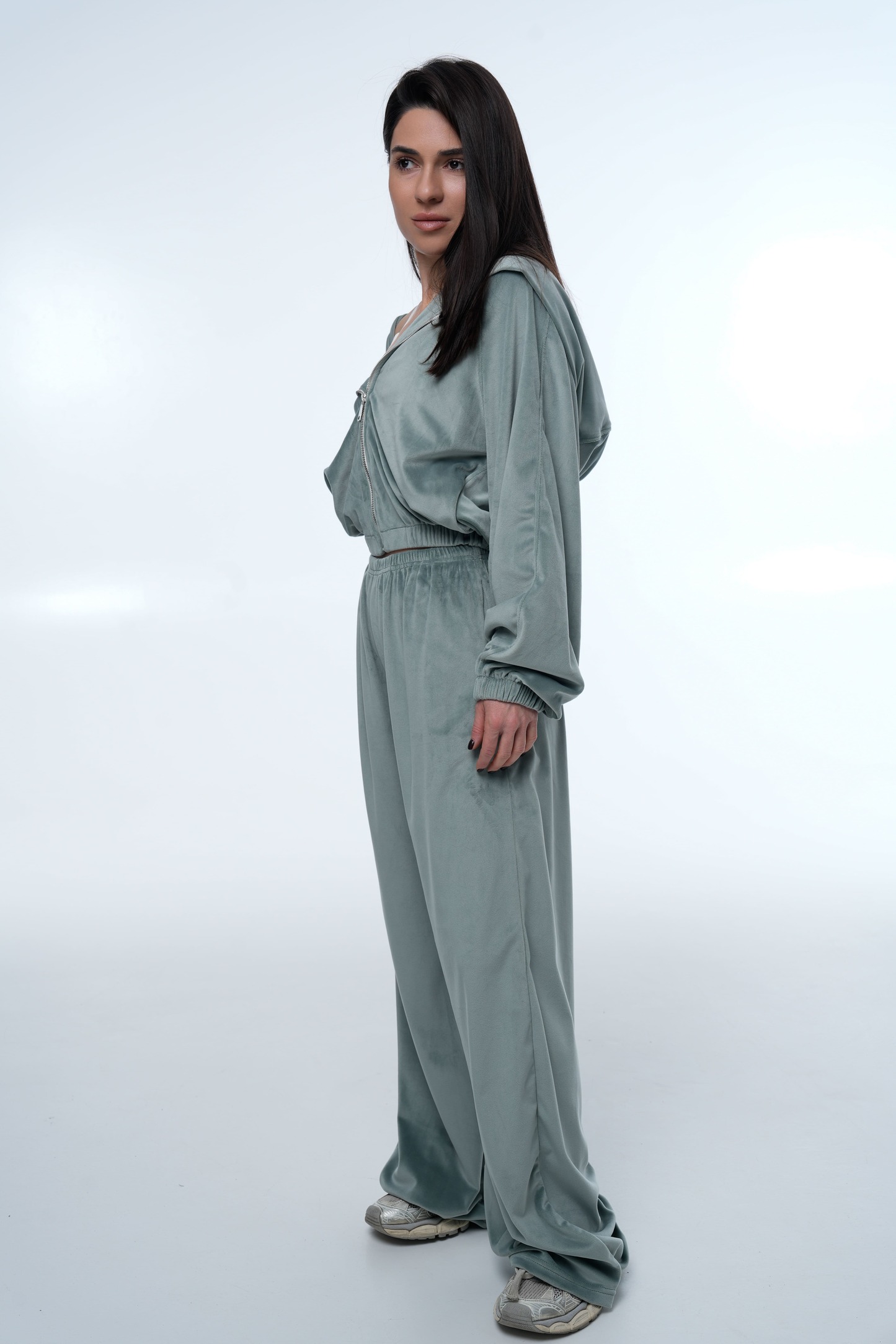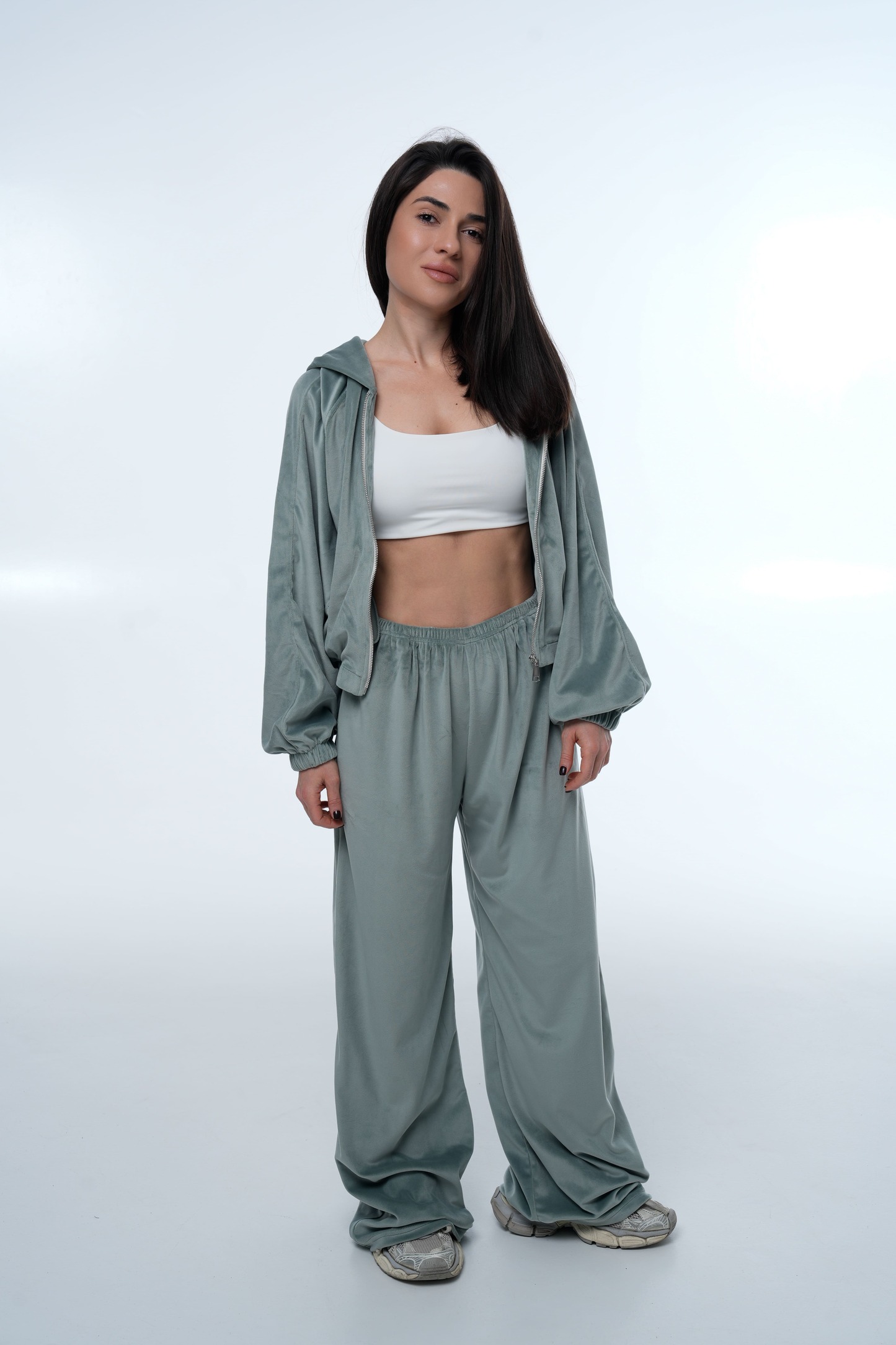 Костюм Soft Glow Menthol — стильний та комфортний комплект із м’якого велюру, який поєднує сучасний крій, легкість та елегантну лаконічність. Завдяки ніжному ментоловому відтінку костюм виглядає свіжо та трендово, а м’яка велюрова текстура надає образу особливого шарму. Такий комплект ідеально підходить для повсякденних образів, подорожей, відпочинку або стильних casual луків.