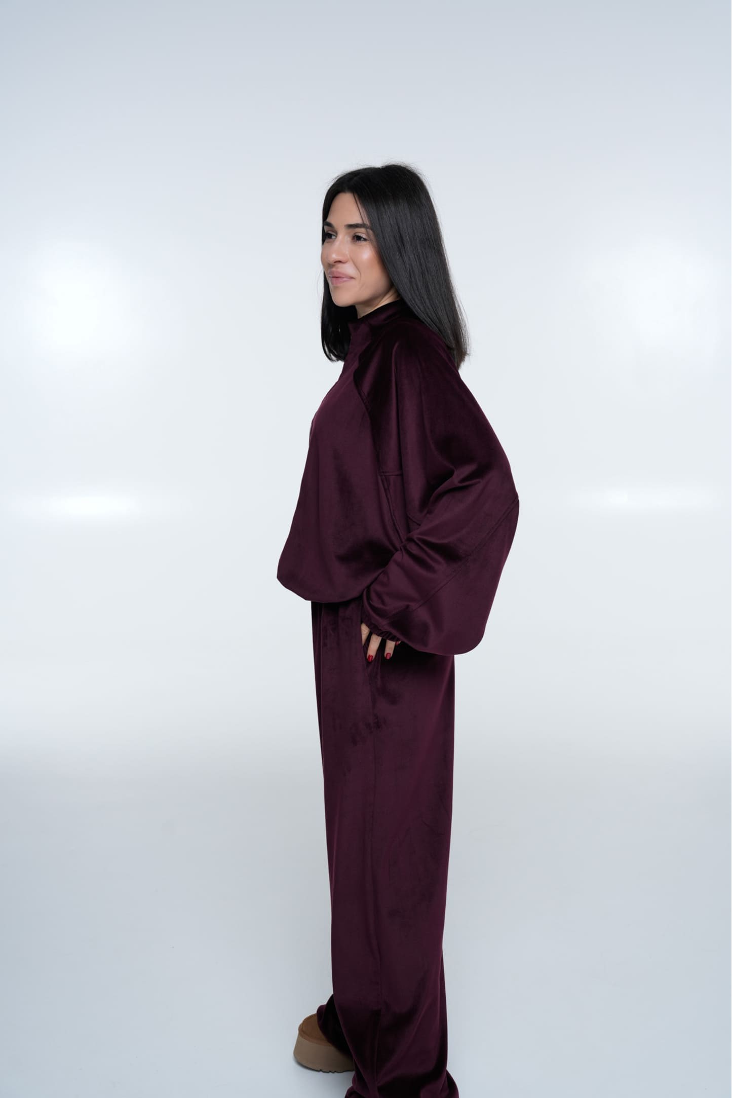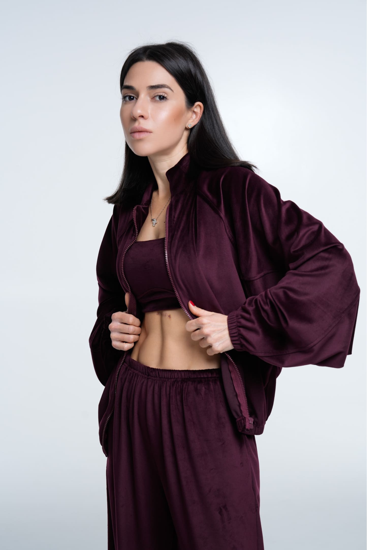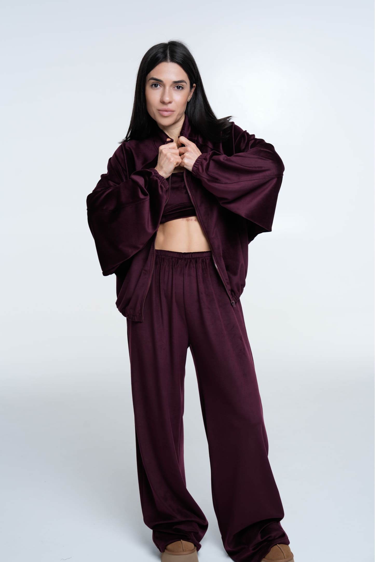 Soft Glow Вино — це костюм для тих, хто цінує витонченість у кожній деталі. Його глибокий тон і м’який блиск велюру створюють образ, що поєднує комфорт і преміальну естетику.
