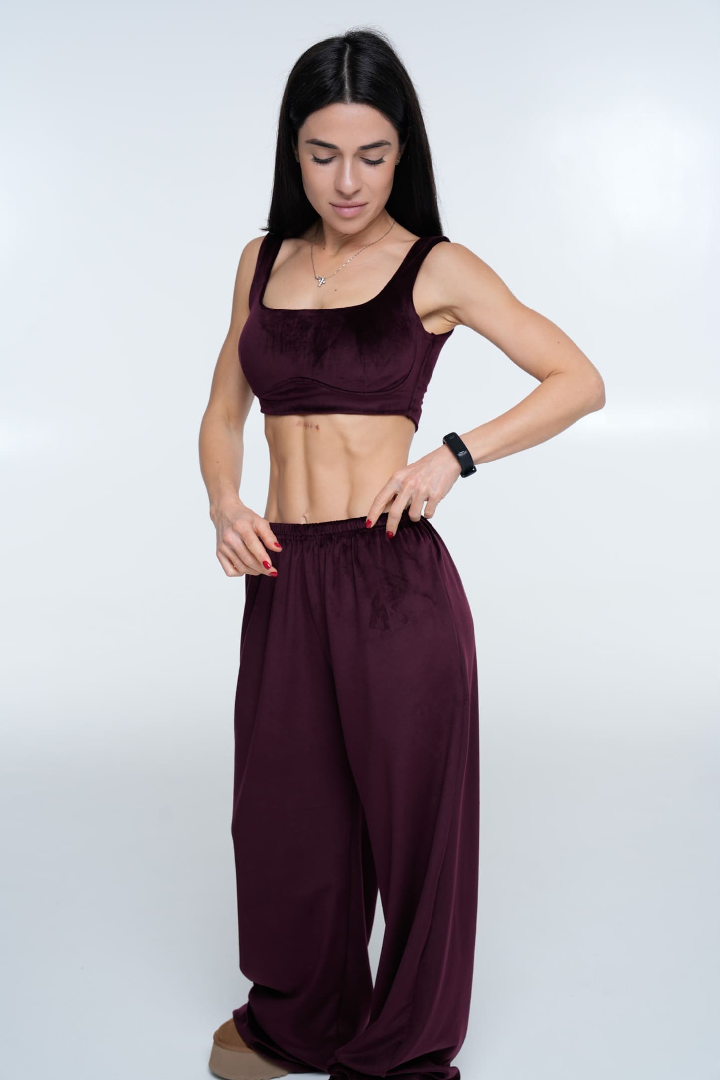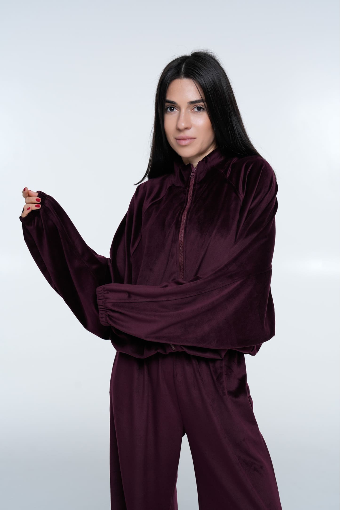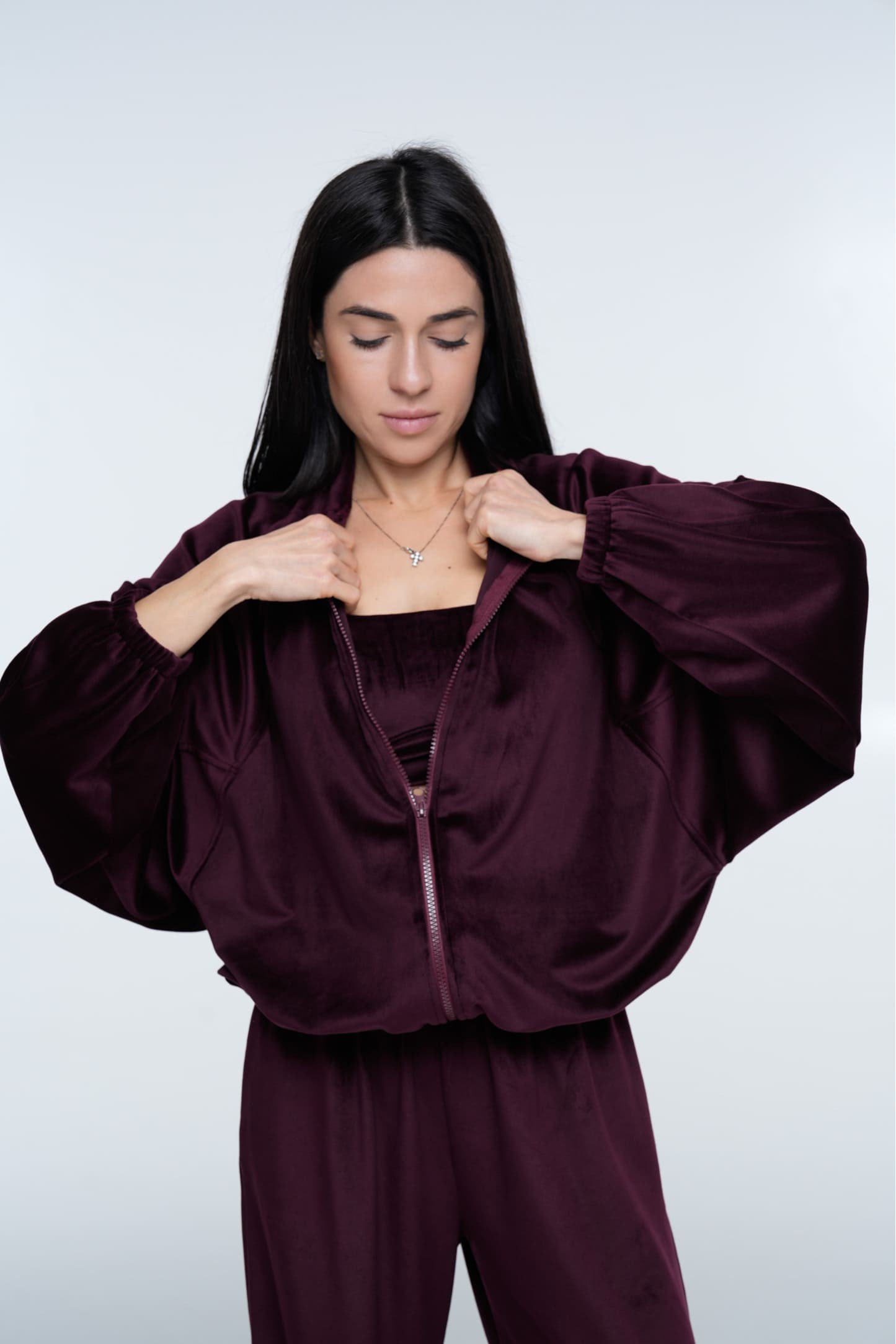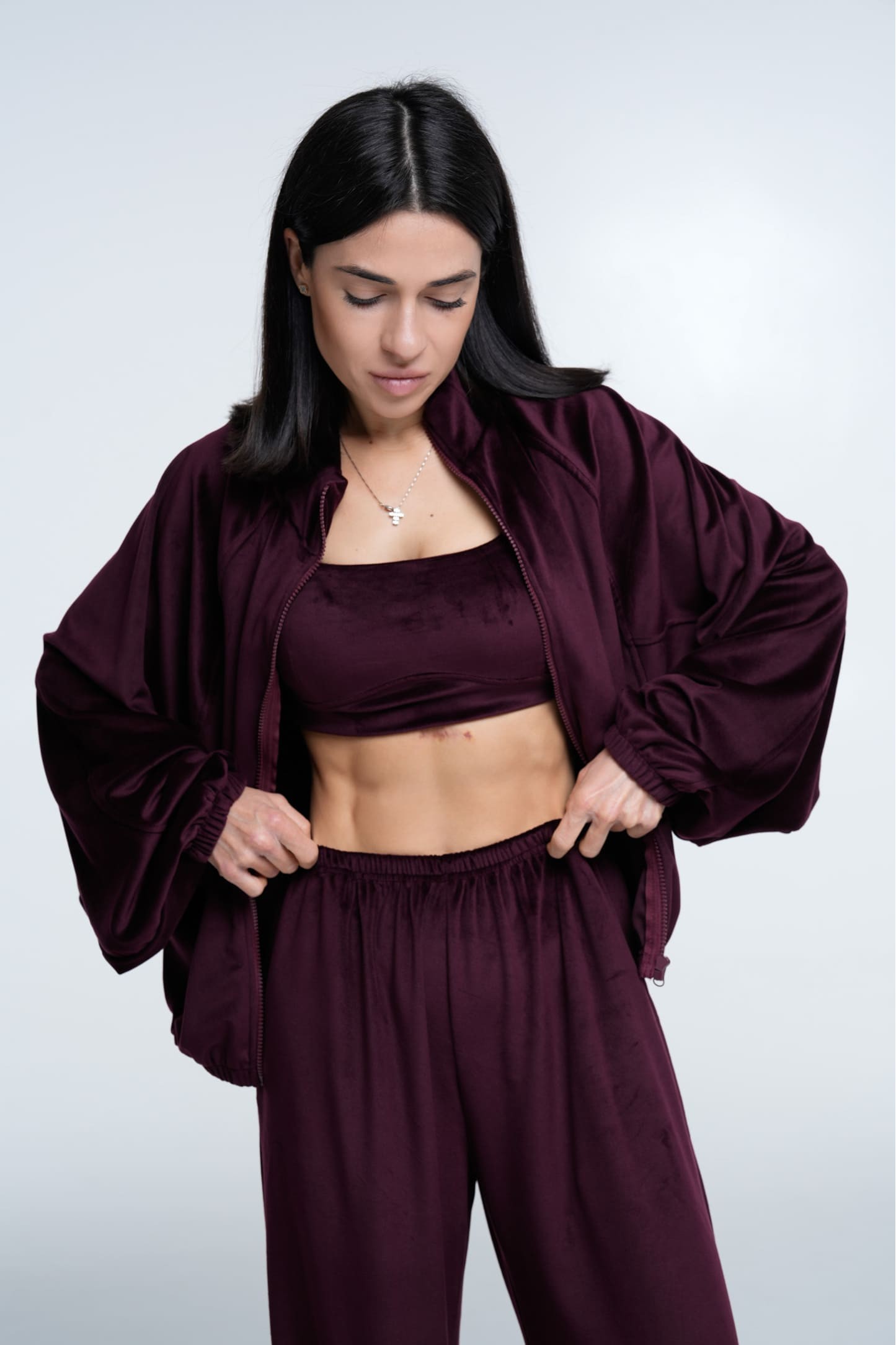 Soft Glow Вино — це костюм для тих, хто цінує витонченість у кожній деталі. Його глибокий тон і м’який блиск велюру створюють образ, що поєднує комфорт і преміальну естетику.