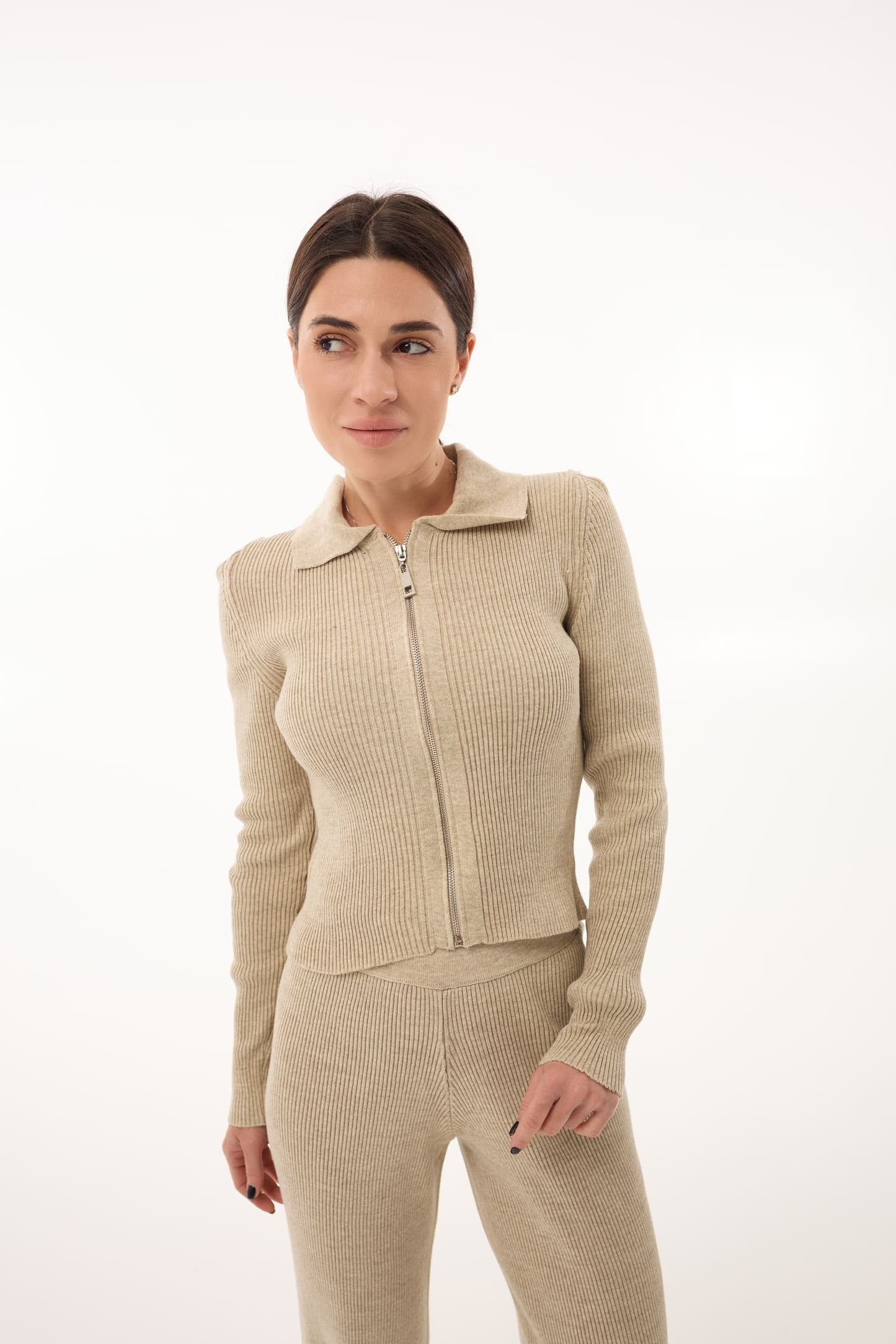 Верх: кофта з відкладним коміром, застібається на металеву блискавку, що додає образу акуратності та витонченості.