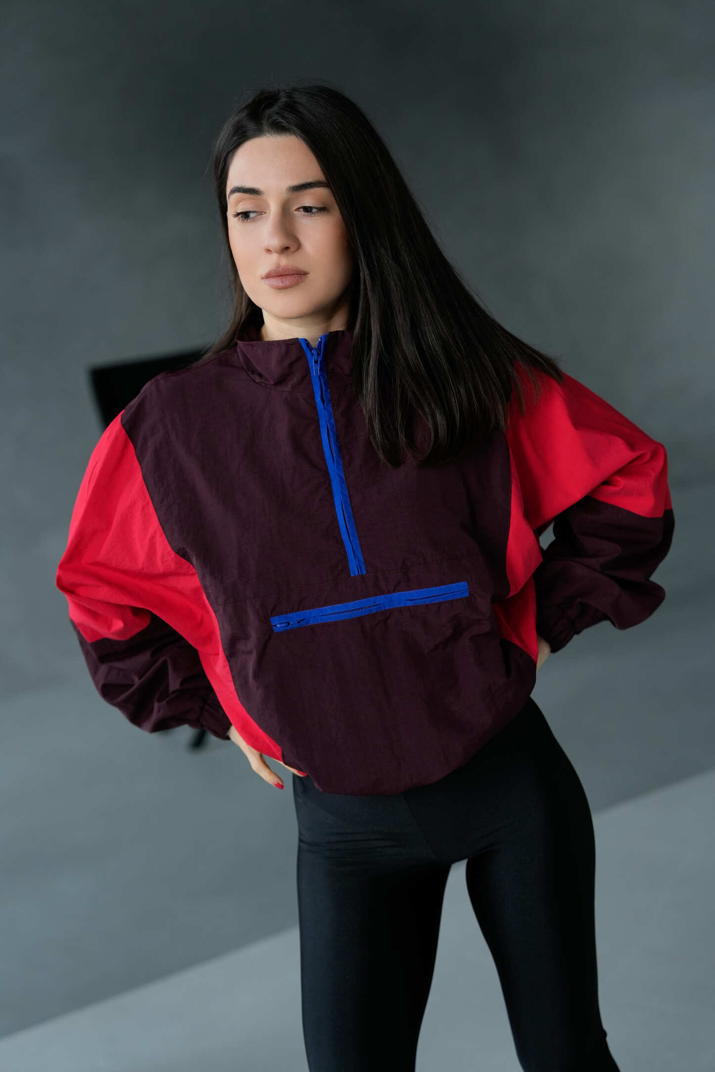 Головний акцент — поєднання глибокого вишневого відтінку з яскравими червоними вставками на рукавах і контрастною блискавкою, що створює ефект багатошаровості та додає моделі виразності. Така колірна комбінація виглядає нестандартно та привертає увагу, зберігаючи баланс між sport і fashion.