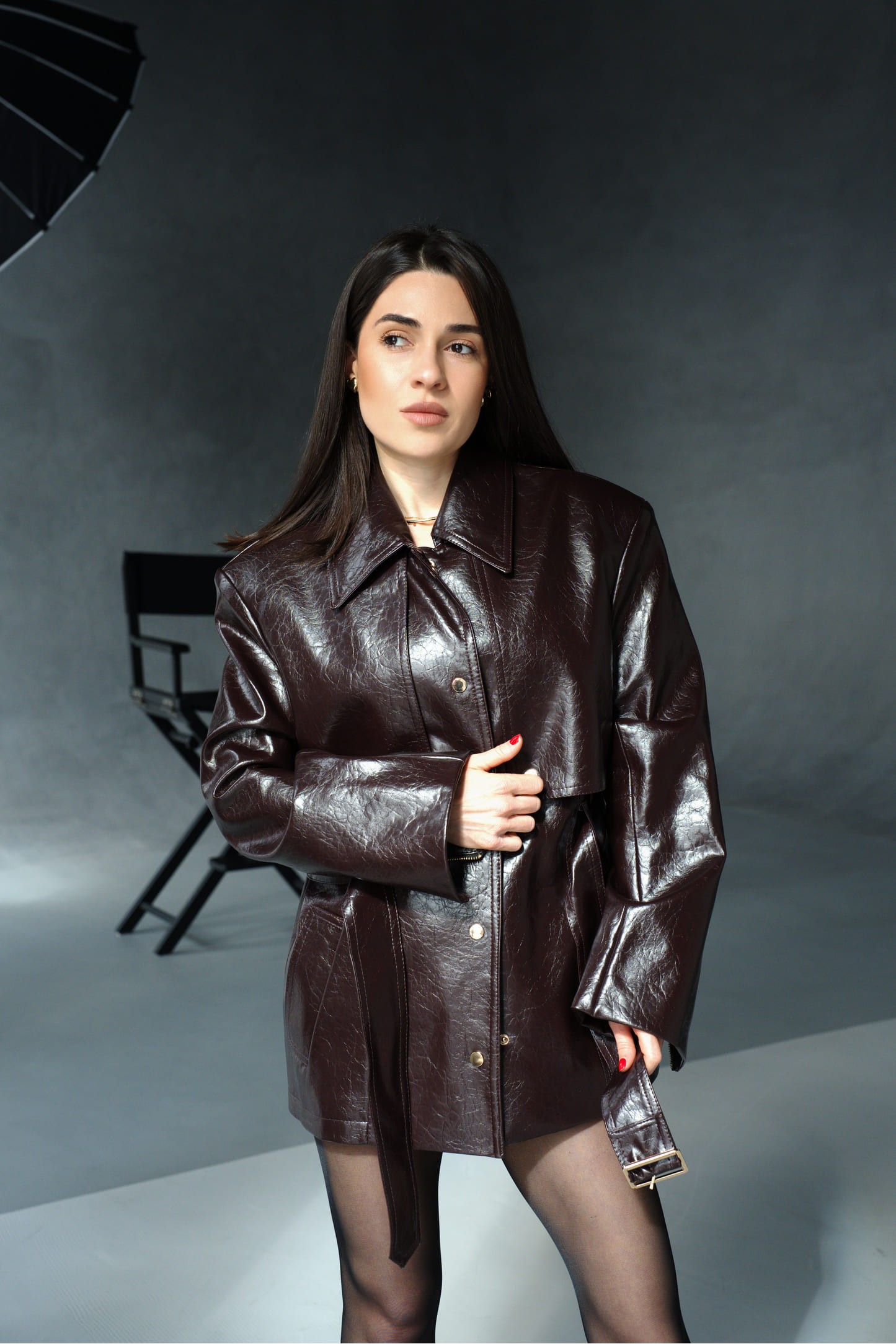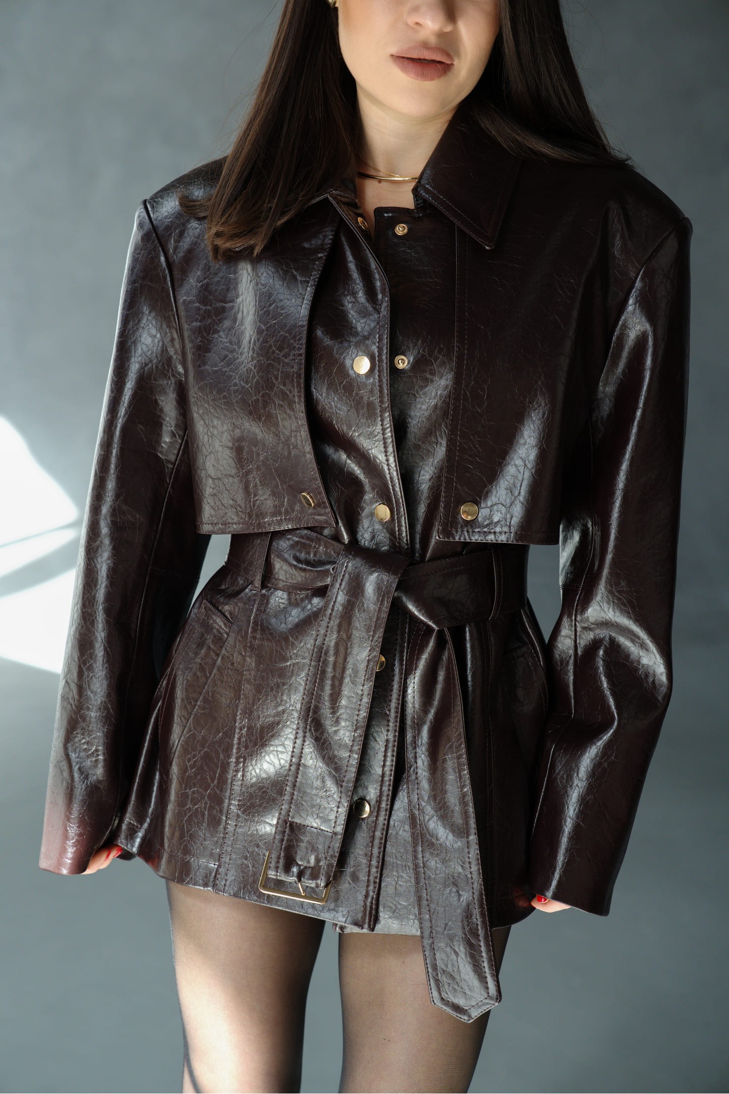 Модель виконана з еко-шкіри з характерною делікатною текстурою та легким глянцем, який красиво проявляє відтінок при різному освітленні — від темного шоколаду до глибокого бордового. Матеріал тримає форму, створюючи чіткий силует із акцентом на плечі та талію, а віскозна підкладка забезпечує комфорт протягом дня.