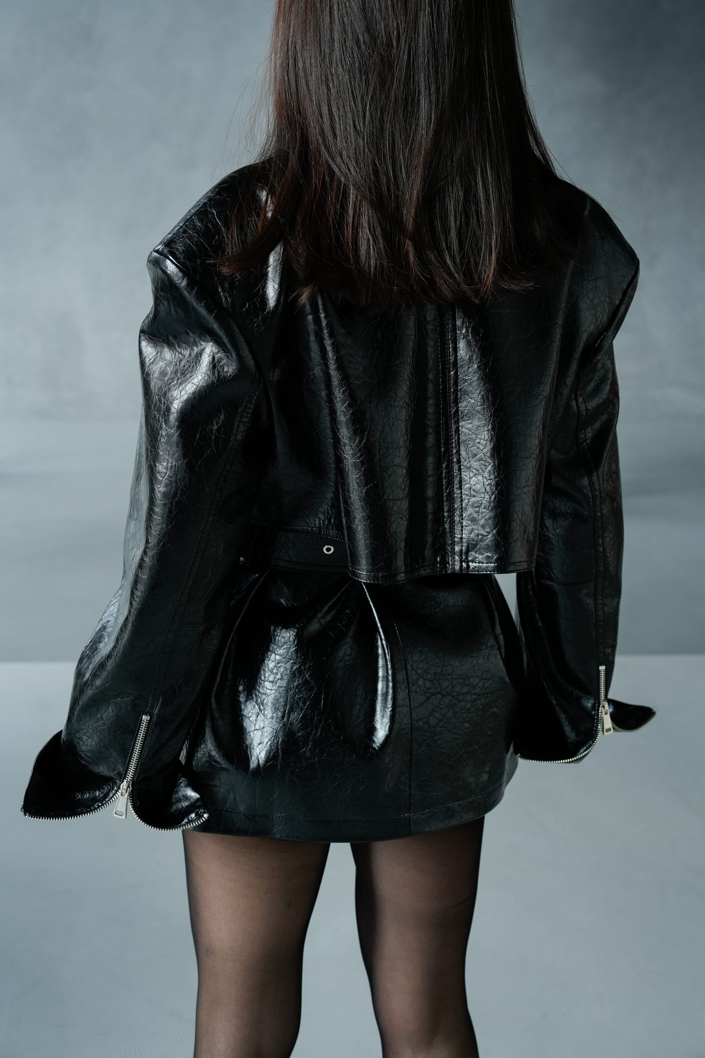 Куртка Dark Aura у чорному кольорі — це виразний акцент у гардеробі, що поєднує силу силуету та глибину фактури. Лаконічна, але з характером, вона створює ефектний образ завдяки глянцевій еко-шкірі та продуманому крою, який підкреслює талію і формує чітку лінію плечей.