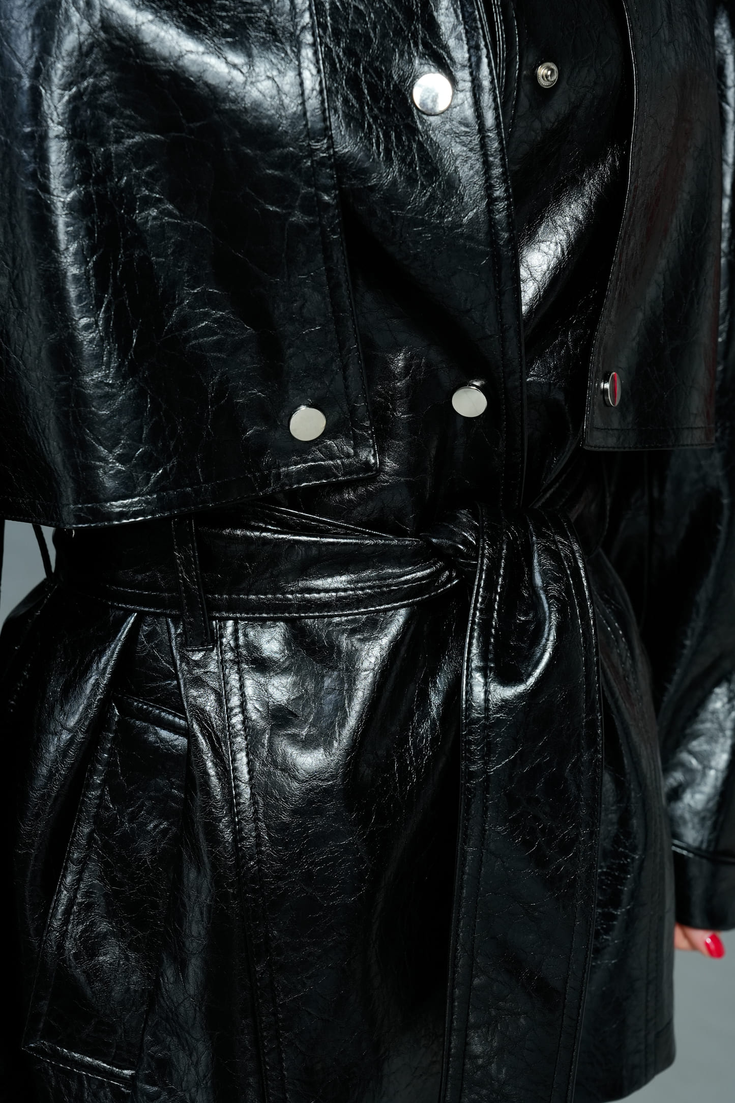 Куртка має конструктивно продуманий дизайн: верхня частина до грудей фіксується на кнопках, створюючи ефект багатошаровості, а нижня частина доповнена поясом, який підкреслює талію. Пояс знімний, із металевою пряжкою, фіксується через петельки, що дозволяє варіювати посадку — від більш розслабленої до акцентно приталеної.
