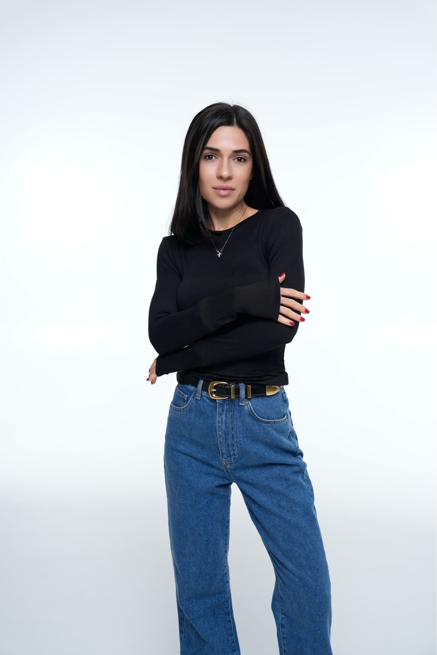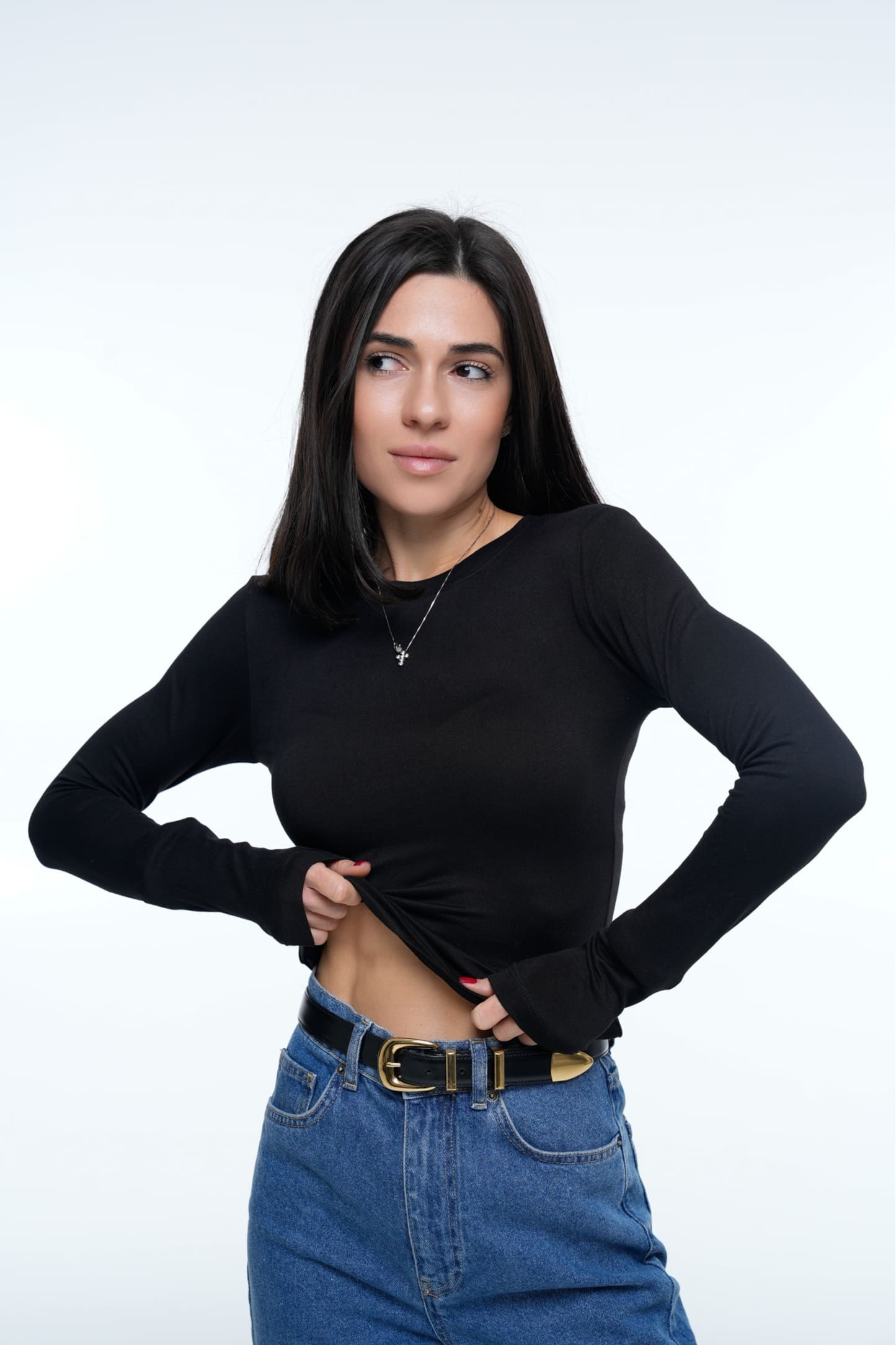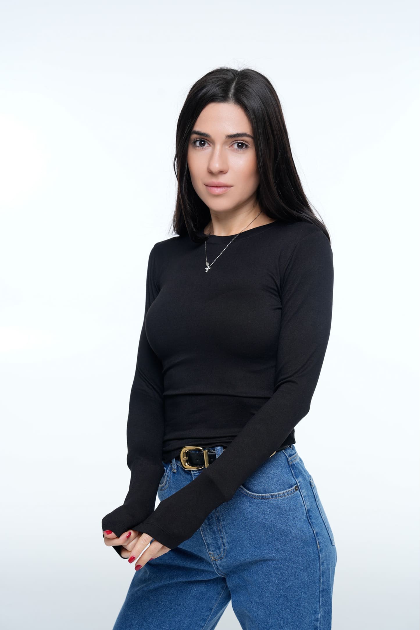Лонгслів Pure Smooth Black виконаний із м’якої, приємної до тіла трикотажної тканини, що поєднує віскозу, поліестер та еластан. Матеріал гладкий, еластичний і щільно лягає по фігурі, підкреслюючи силует без дискомфорту. Модель має класичний круглий виріз, довгі облягаючі рукави з подовженою манжетою, що акуратно формує лінію кисті (видно на фото).