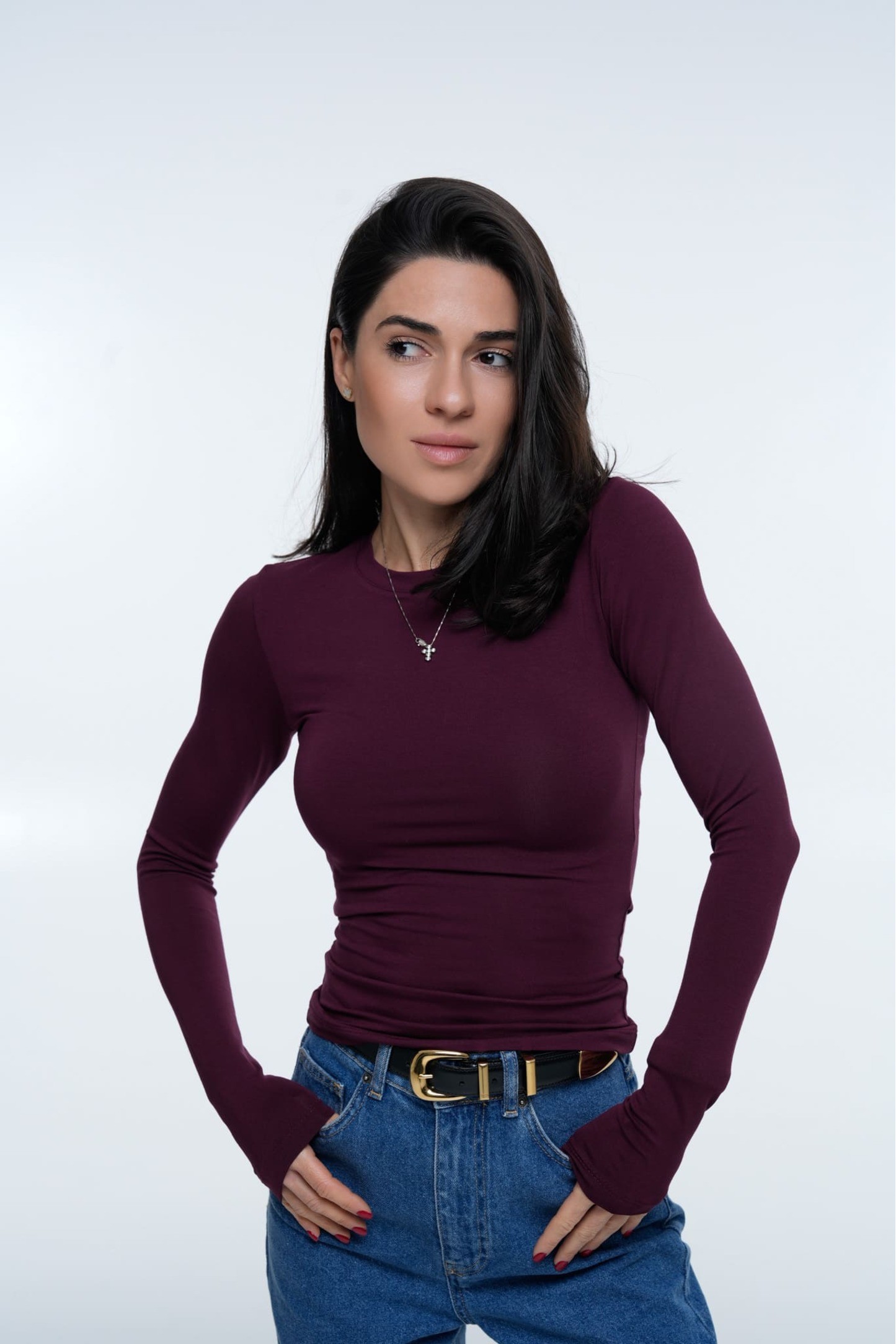 Колір — глибокий вишневий (Cherry), насичений та універсальний, підходить як для самостійного носіння, так і для поєднання в багатошарових луках. Горловина округла, акуратно оброблена. Модель щільно облягає тіло, підкреслюючи форми, але не сковує рухів.