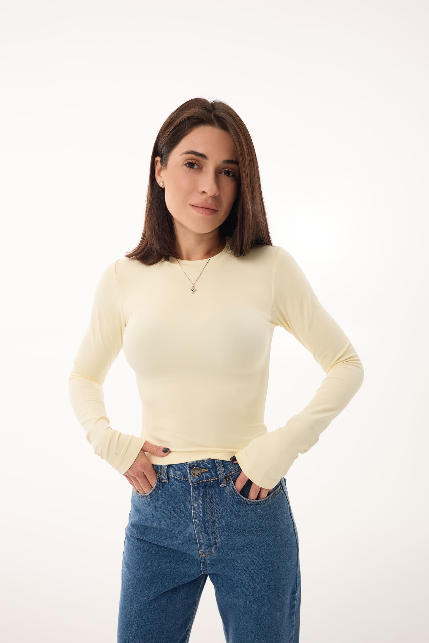 Стильний лонгслів у відтінку ivory cream — це витончений базовий елемент гардероба, що гармонійно поєднує комфорт і сучасний дизайн. Виготовлений із м’якої еластичної тканини, він ідеально облягає силует, створюючи витончену лінію та підкреслюючи жіночність.