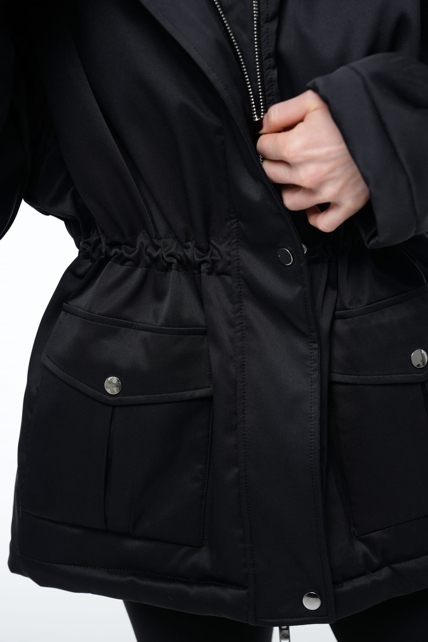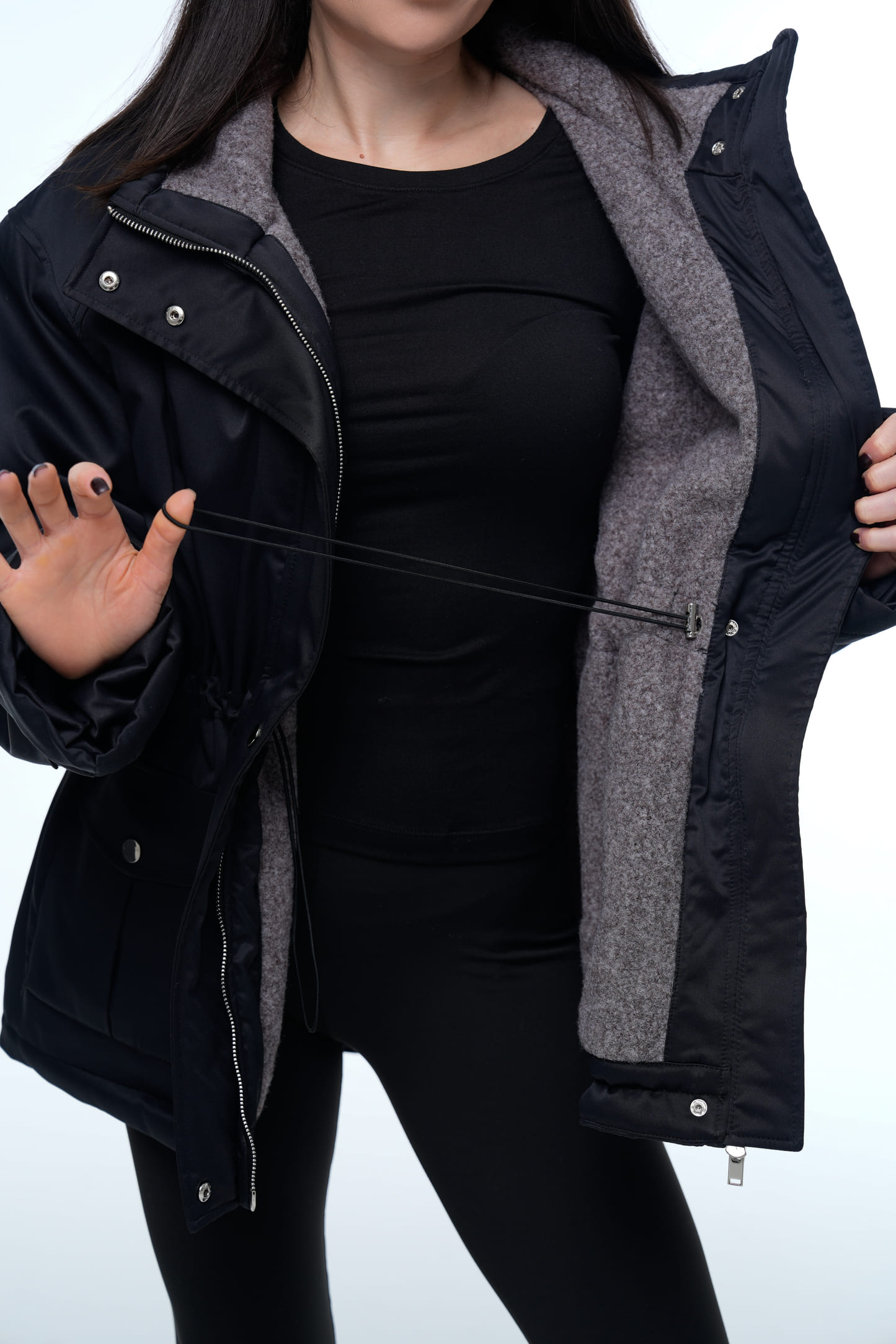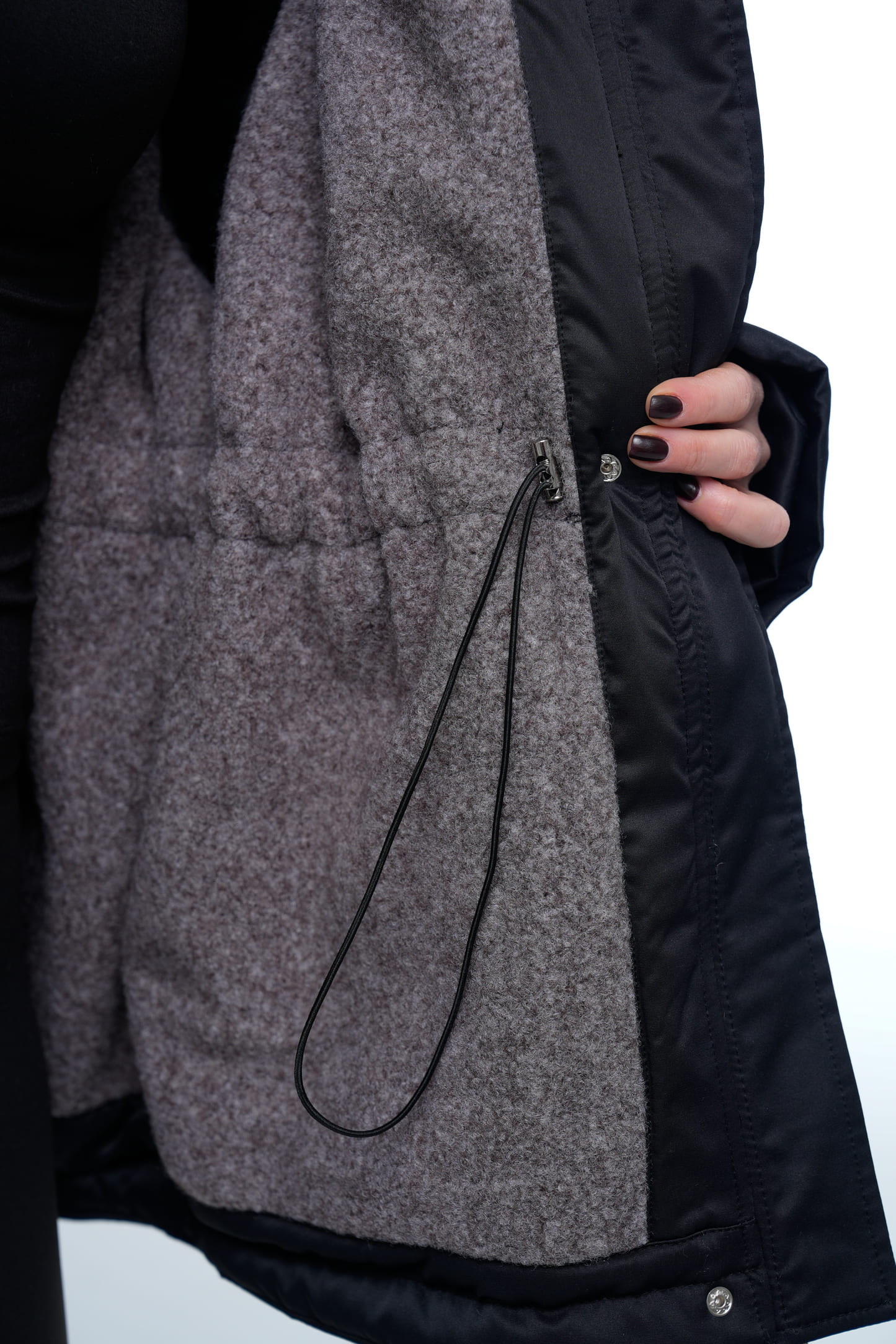 Конструкція парки передбачає високий комір-стійку, який додатково захищає шию від холоду. Завдяки внутрішній кулісці на талії можна регулювати посадку — від більш вільного силуету до акценту на лінії талії. Подовжена задня частина виробу забезпечує додатковий комфорт та захист від вітру.