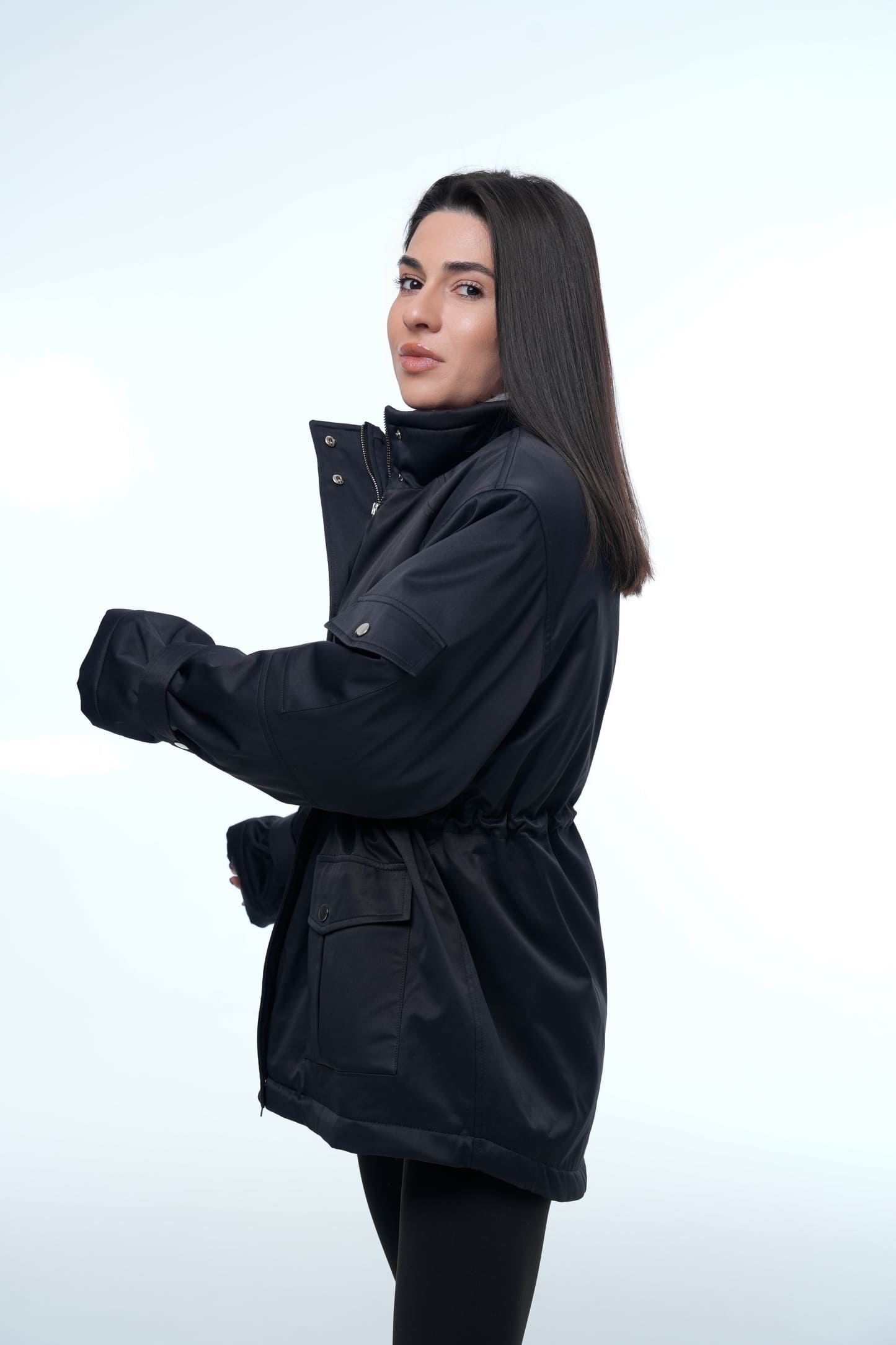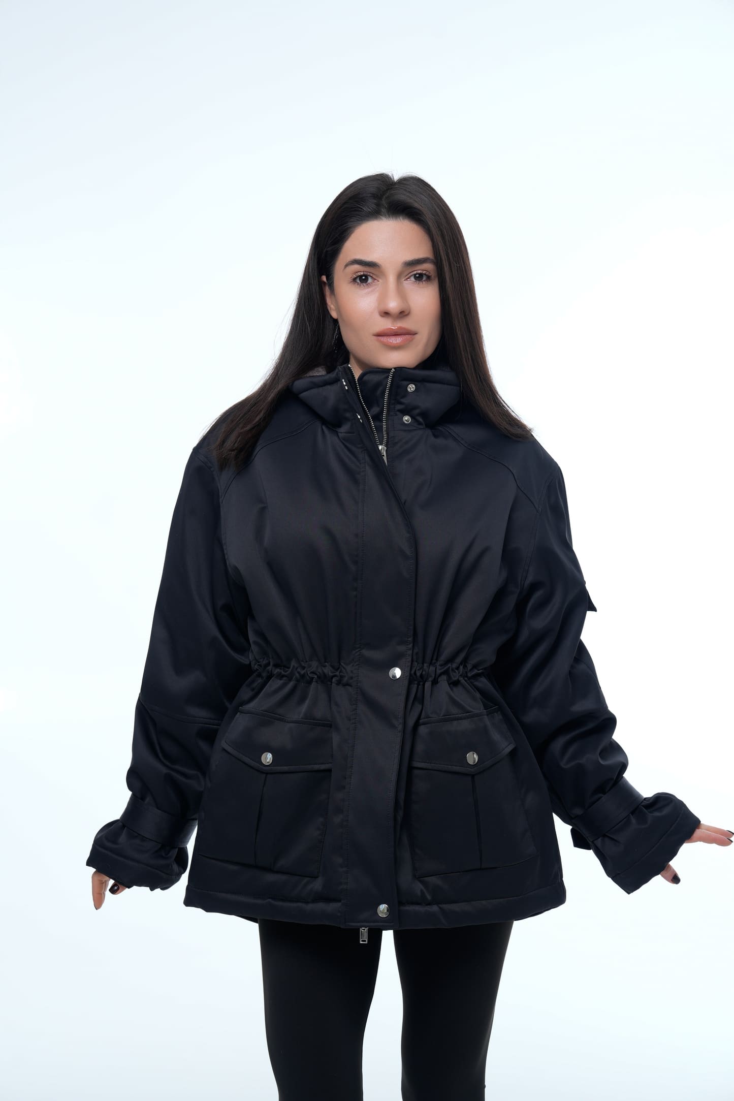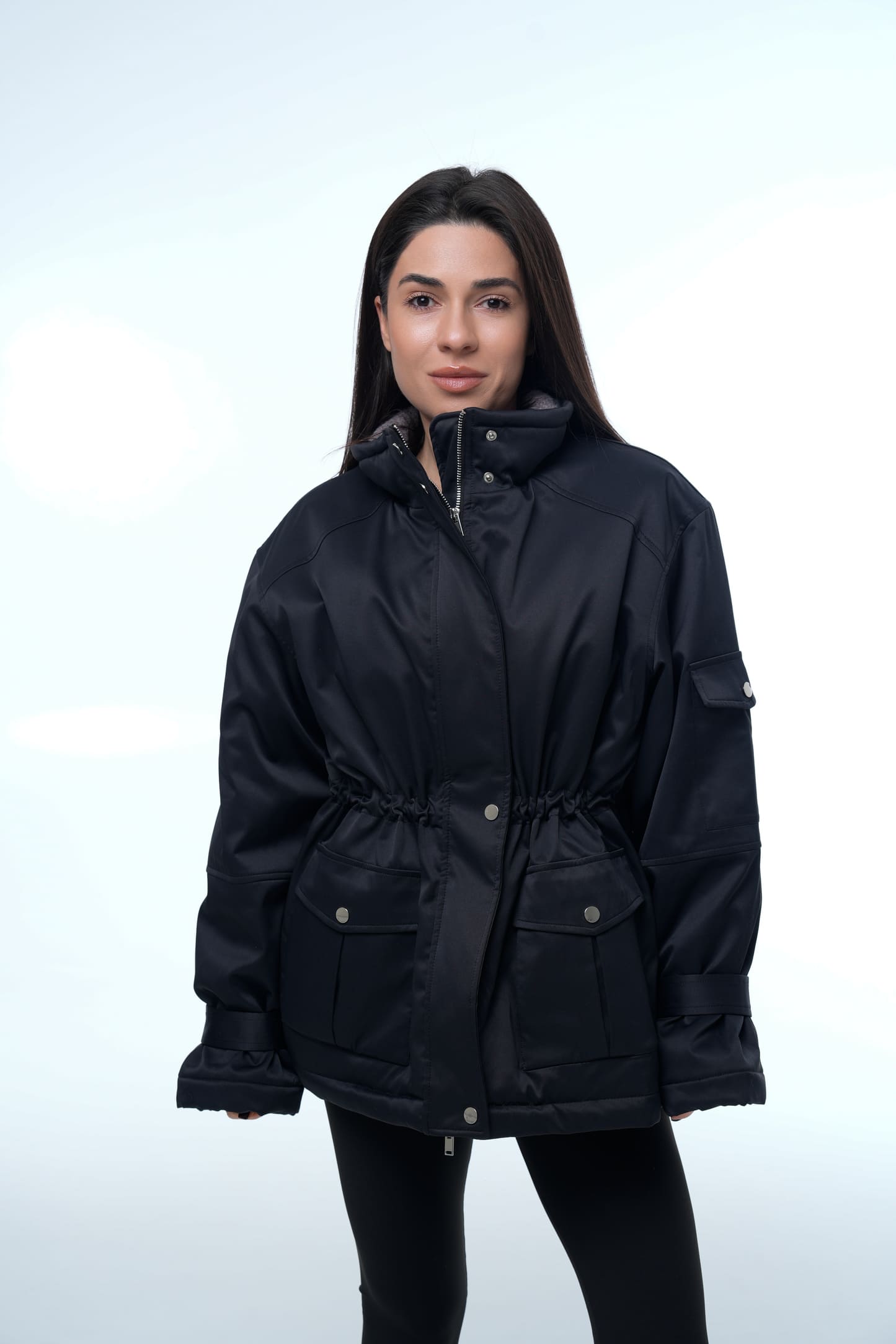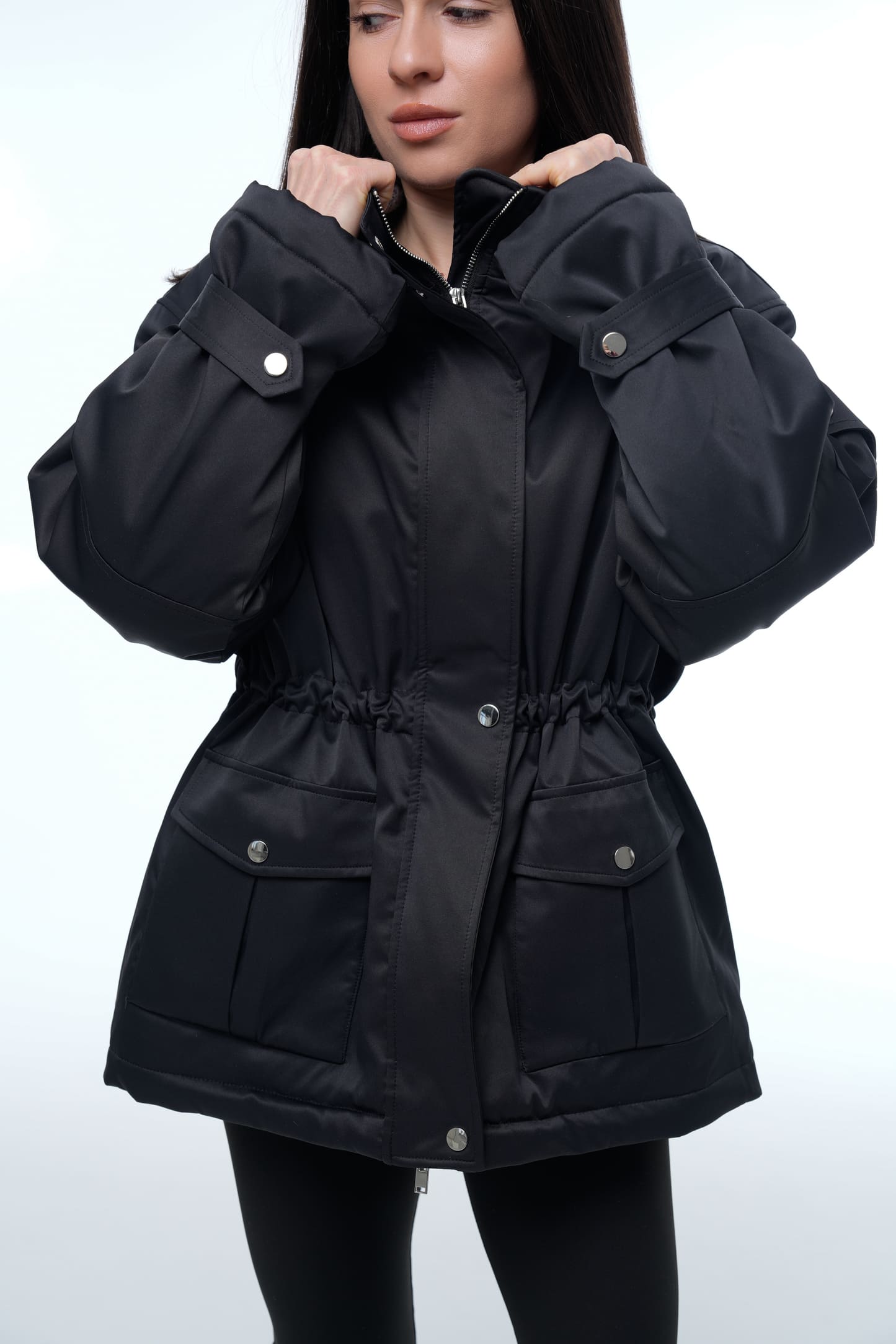 Конструкція парки передбачає високий комір-стійку, який додатково захищає шию від холоду. Завдяки внутрішній кулісці на талії можна регулювати посадку — від більш вільного силуету до акценту на лінії талії. Подовжена задня частина виробу забезпечує додатковий комфорт та захист від вітру.