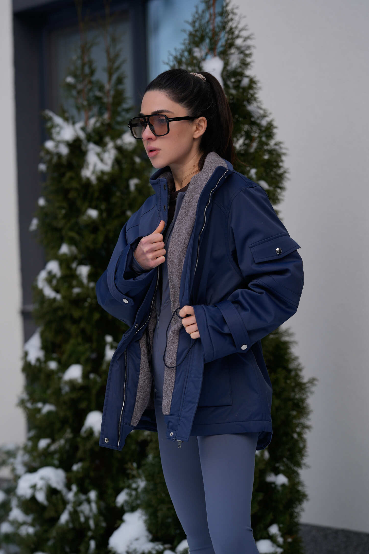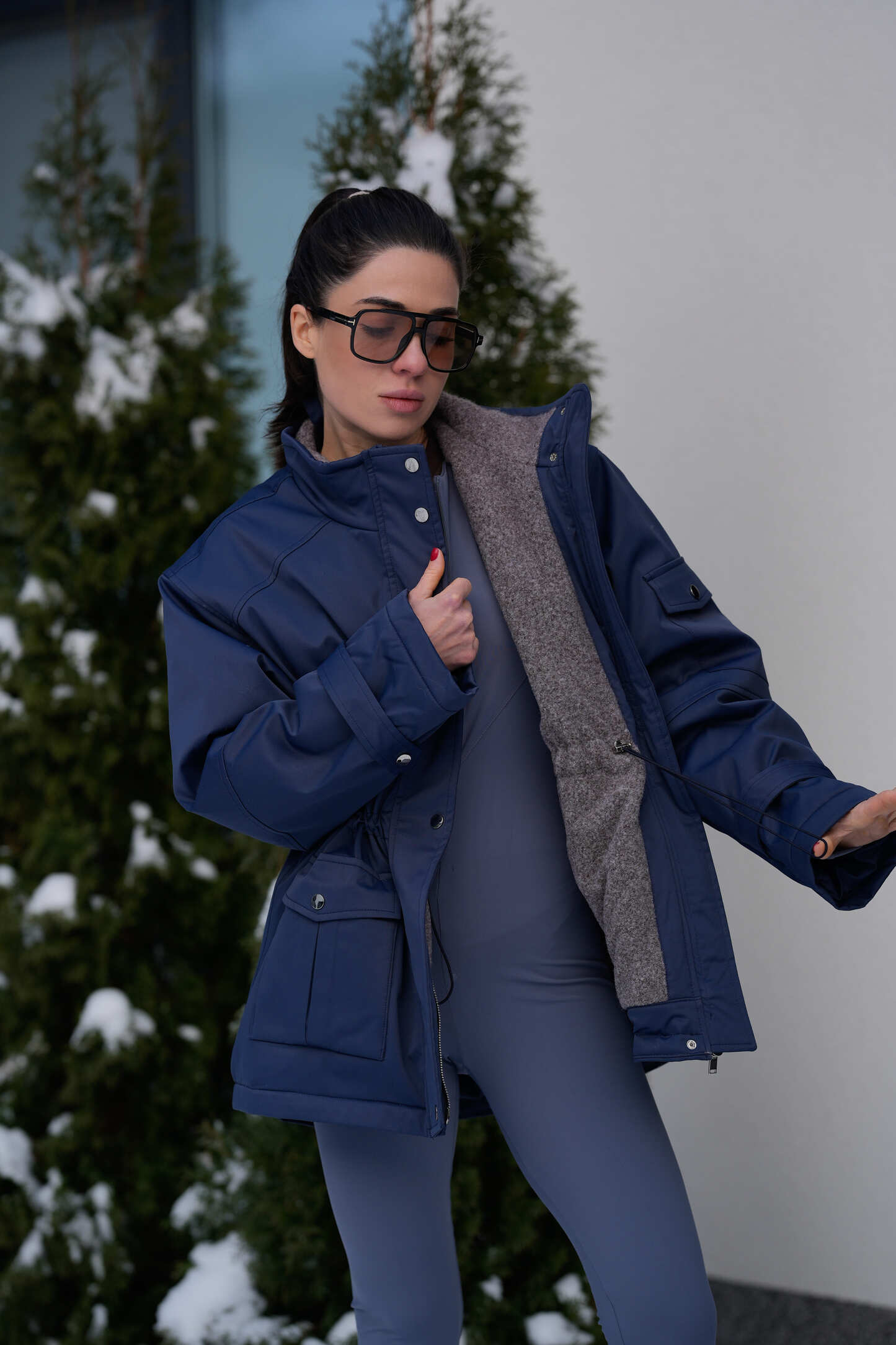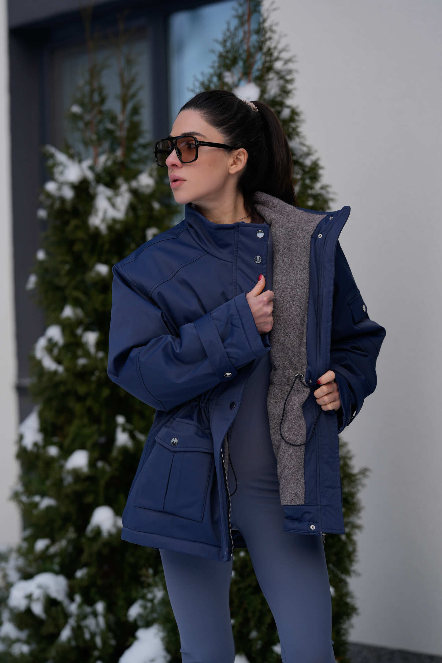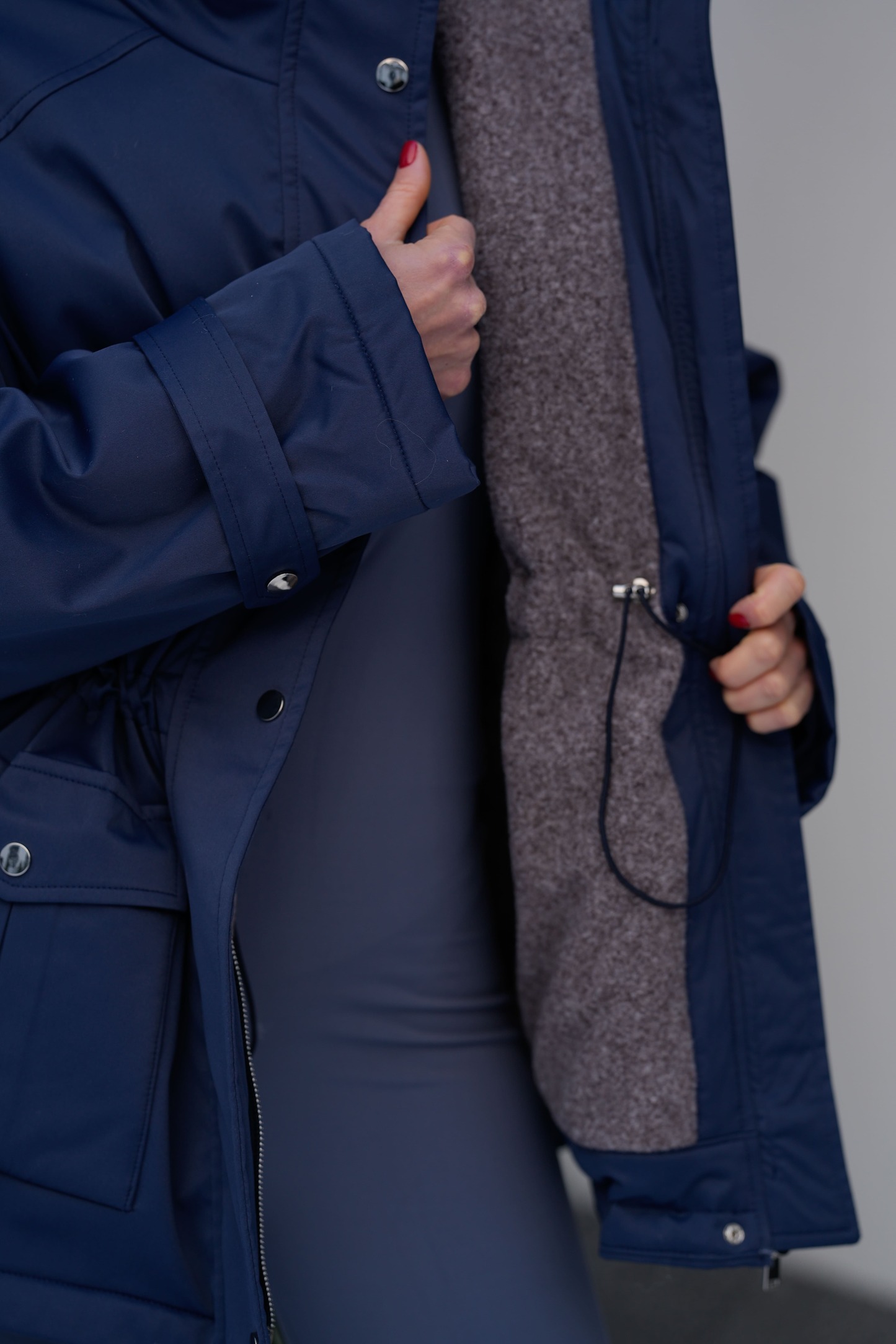 Парка має комбіновану застібку на два металеві замки та чотири металеві кнопки, що надійно захищає від вітру й холоду. Спереду розташовані дві функціональні кишені з утепленням, які застібаються на кнопку. Усередині передбачена куліска на талії, що дозволяє регулювати посадку та підкреслювати силует.