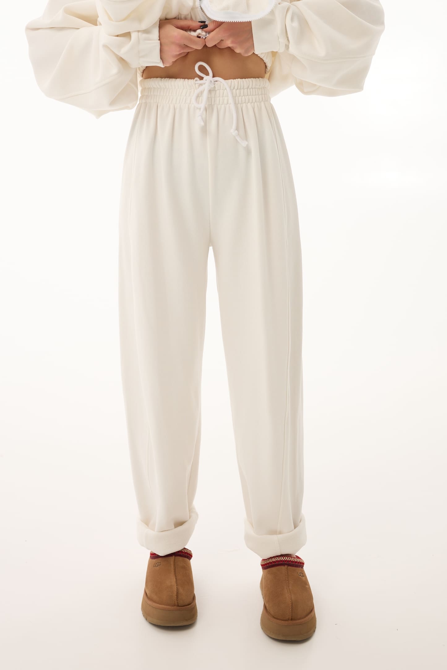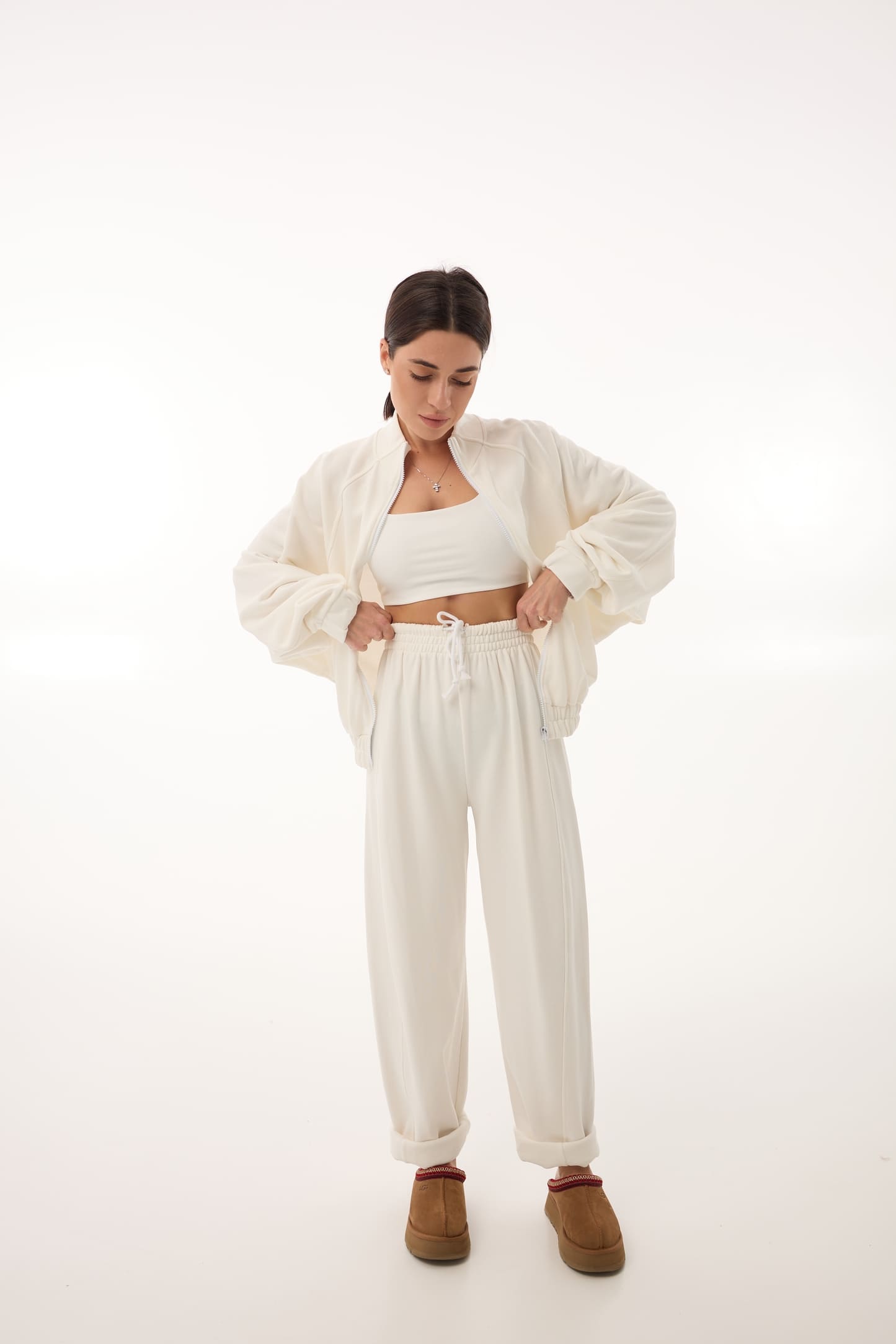 Білий відтінок створює відчуття чистоти й легкості, легко поєднується з базовими топами, футболками чи світшотами. Це ідеальний вибір як для повсякденних луків, так і для стильних спортивних сетів.