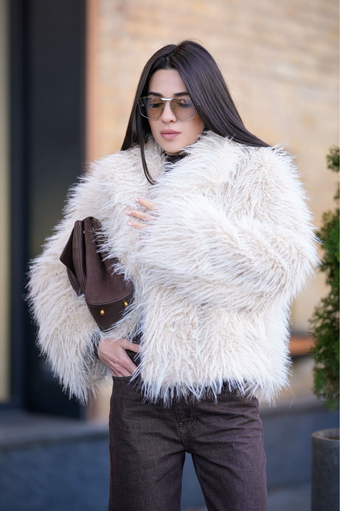 Шуба має застібку на три приховані кнопки, які майже непомітні під ворсом, зберігаючи лаконічний дизайн. Спереду розташовані дві функціональні кишені, що зручно зігрівають руки та не вибиваються з загальної естетики. Воротник-стійка додає моделі структури, захищає шию від вітру та гармонійно поєднується з об'ємними рукавами.