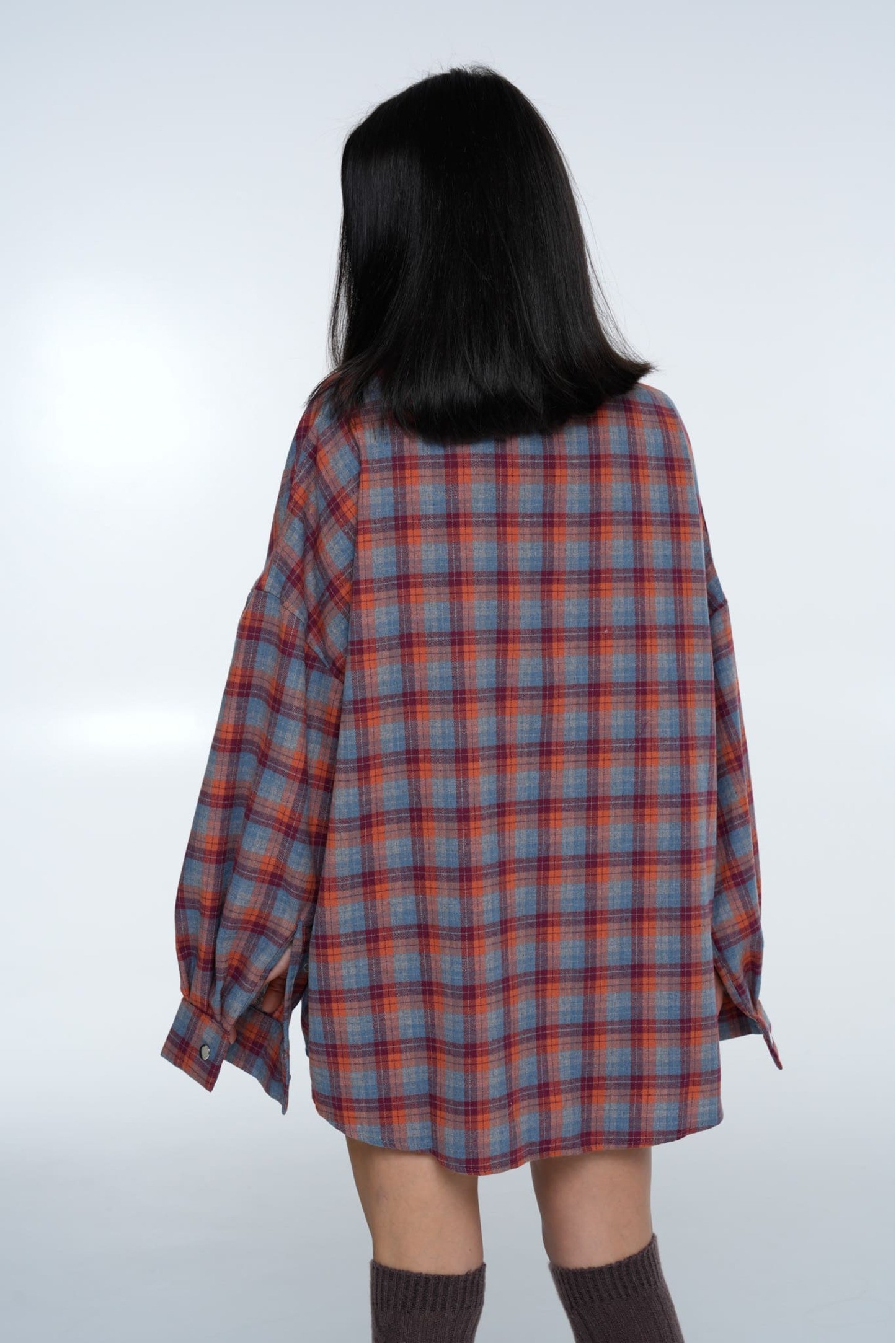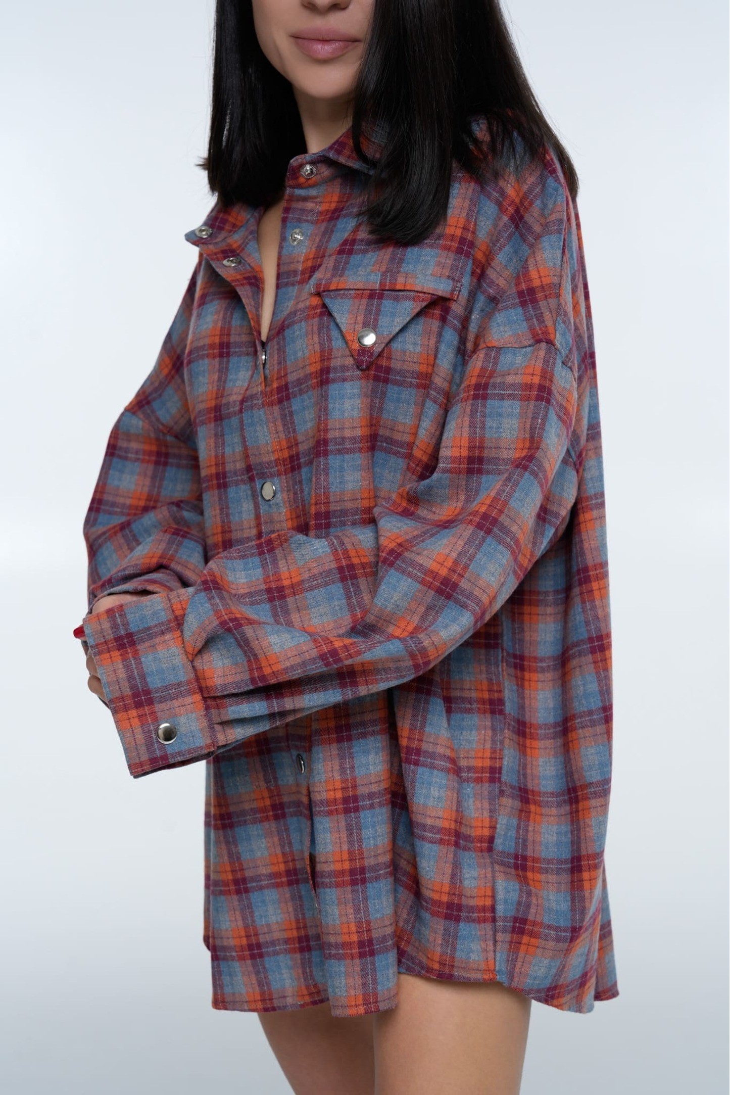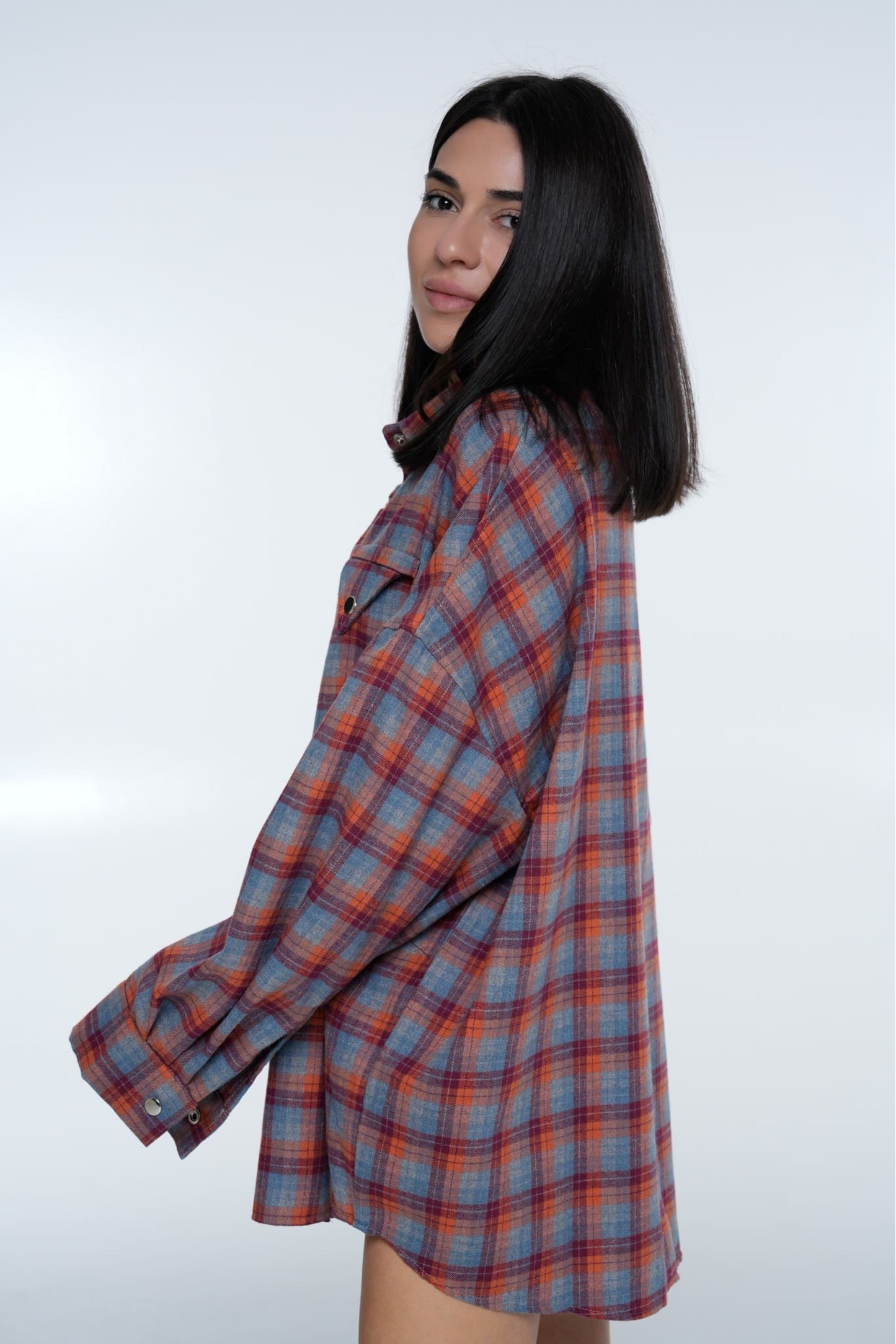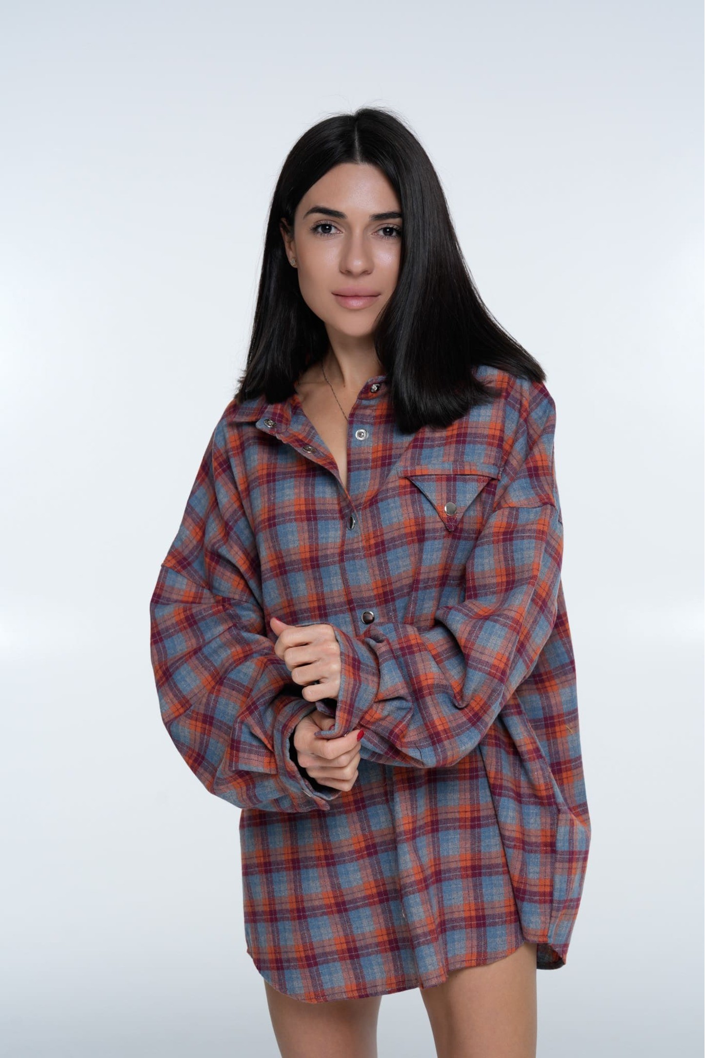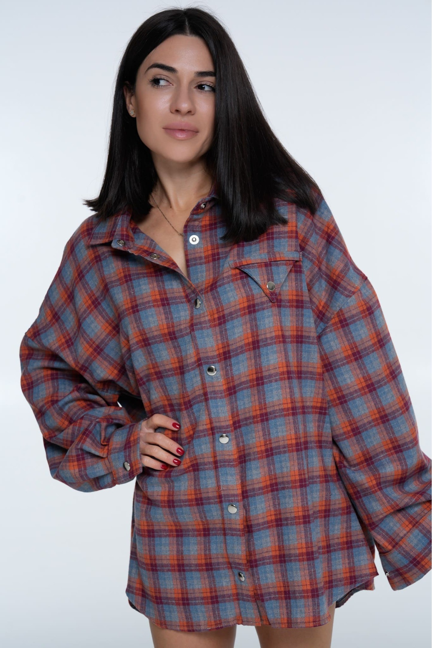 Сорочка Triangle Plaid Blue Rust виконана з м’якої фланелі в ефектному поєднанні холодного синьо-сірого тону з насиченими рудими та бордовими відтінками клітинки. Цей контраст створює яскравий, але водночас стильний і збалансований образ, який легко підкреслює індивідуальність.