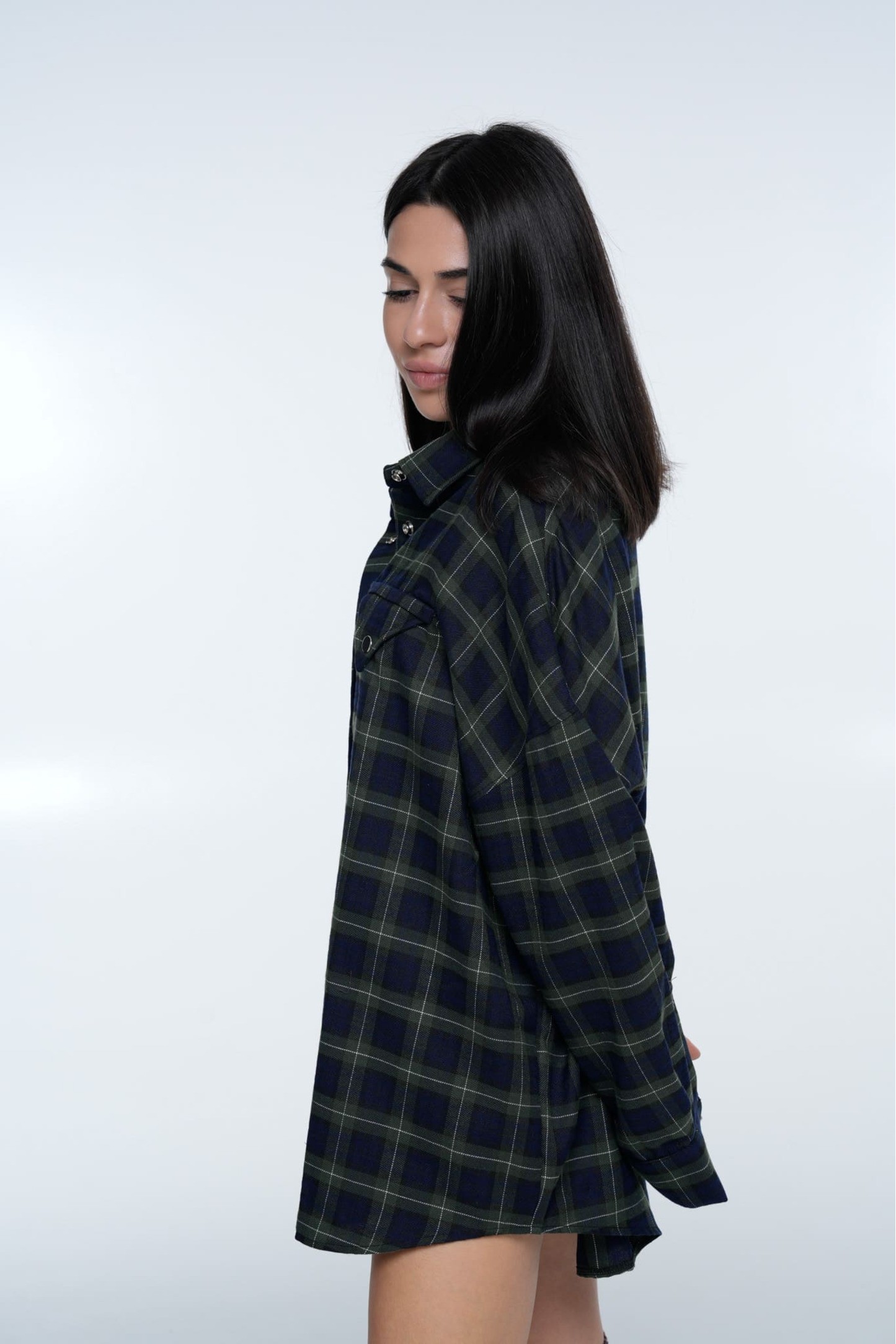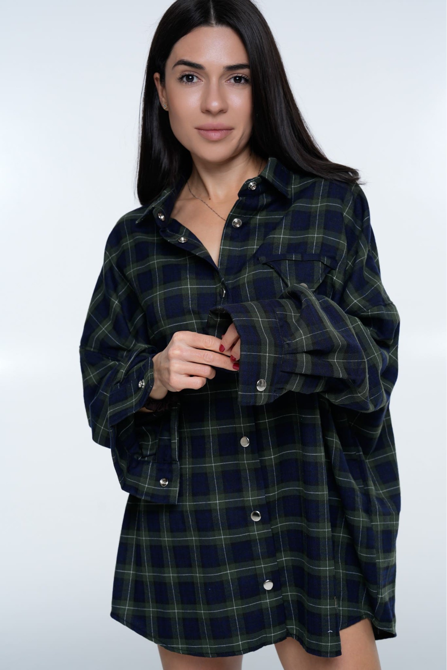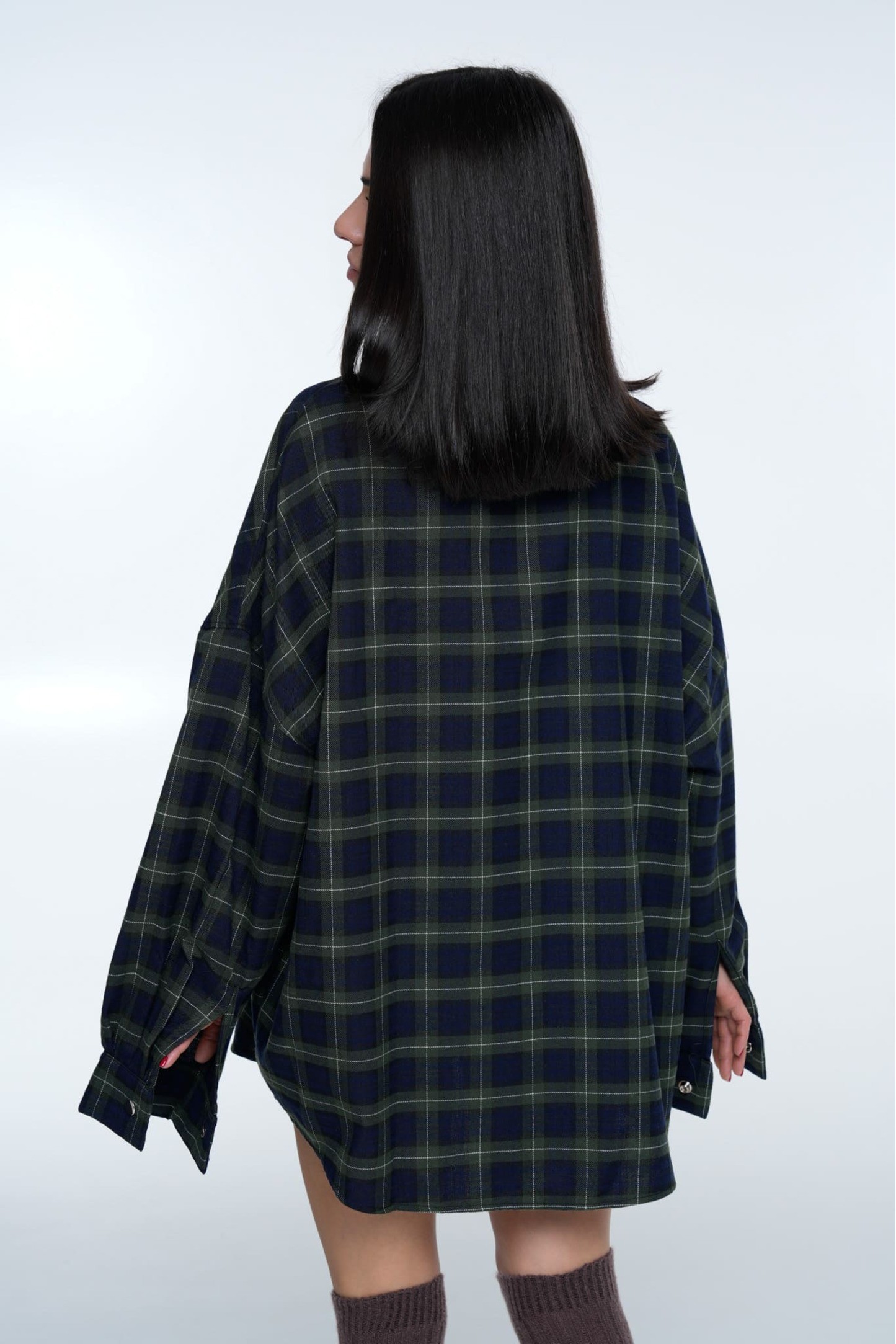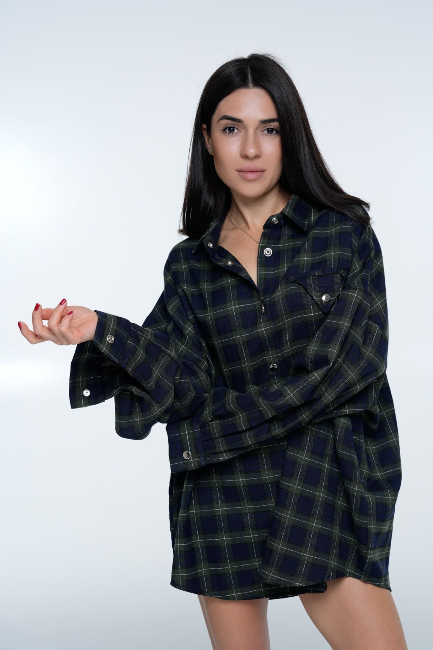 Тканина — щільна фланель із м’яким ворсом, що приємно гріє. Колір — комбінація оливкового та темно-синього, універсальна й гармонійна для будь-якого сезону.