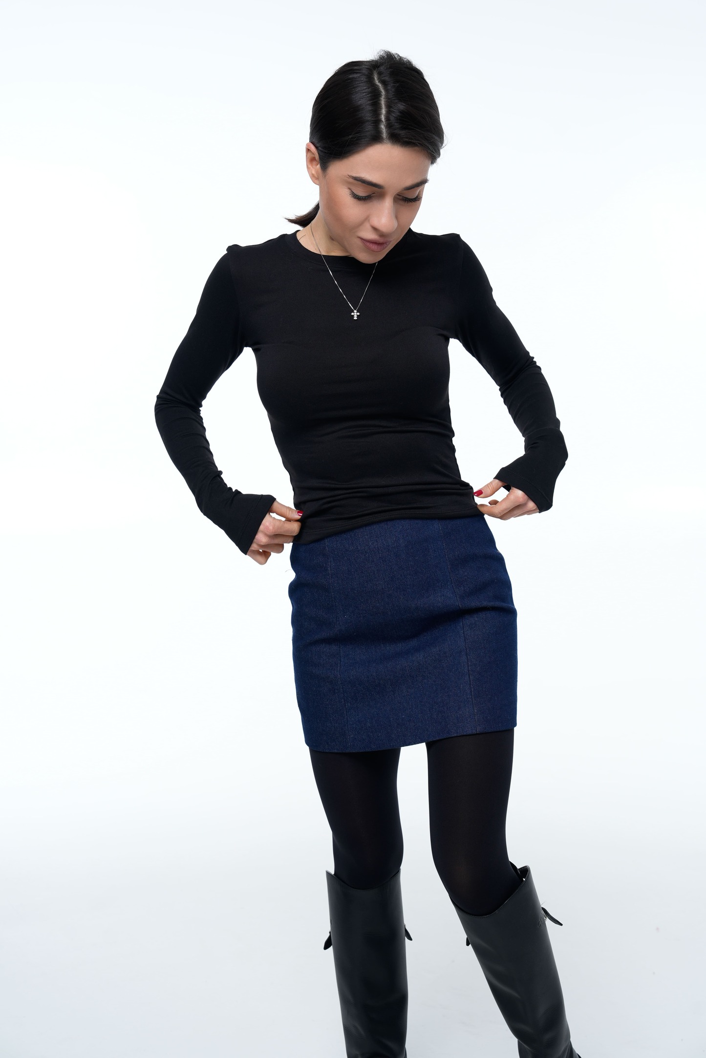 Спідниця Denim Shape Синя створена для тих, хто цінує мінімалізм і ідеальну посадку. Щільний денім тримає форму та підкреслює лінії тіла, зберігаючи комфорт протягом дня. Гладка еластична підкладка забезпечує м’яке прилягання та не дозволяє виробу підніматися.