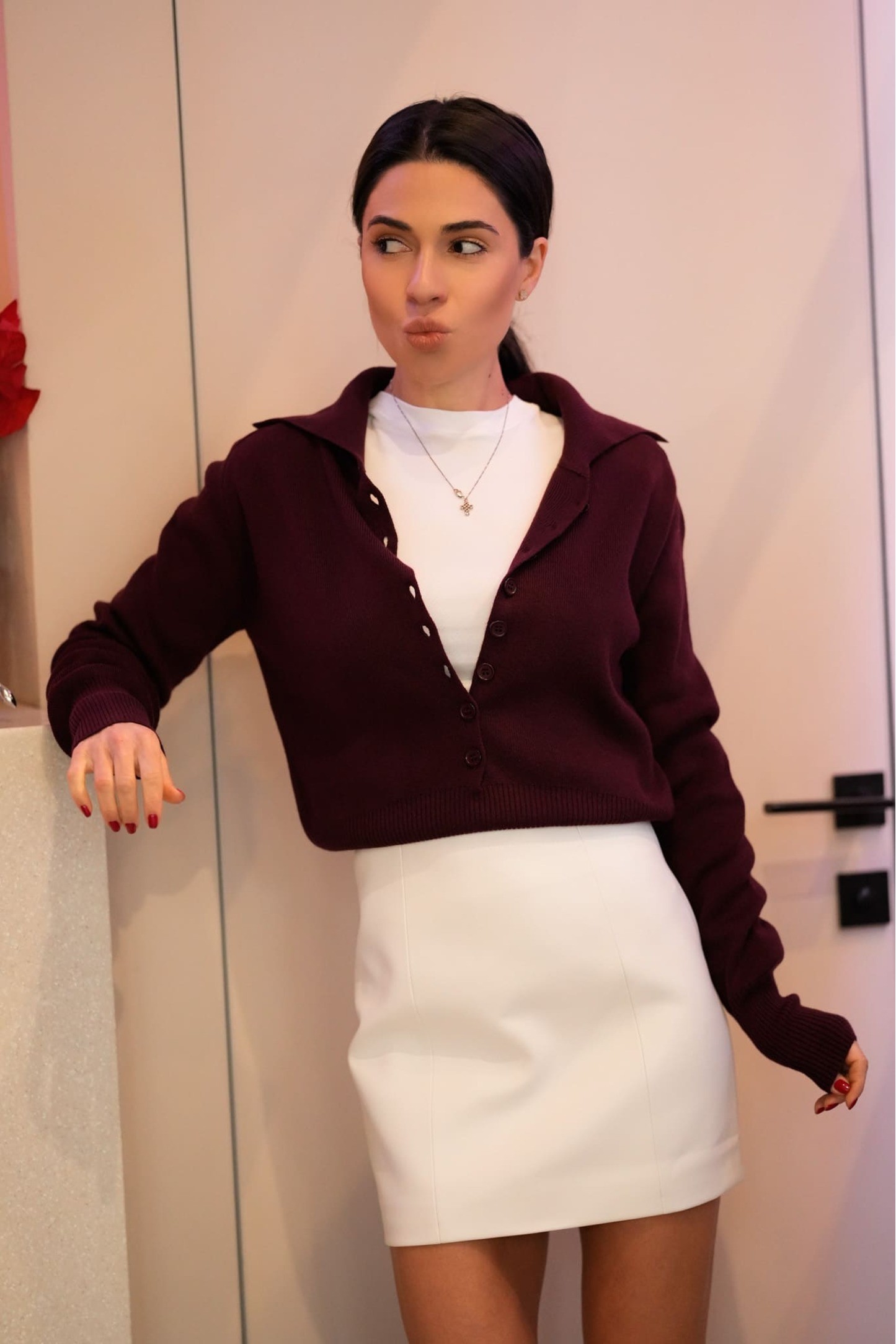 Светр Collar Mood Wine — стильна та сучасна модель із насиченим винним відтінком, яка поєднує елегантність та комфорт. В’язане полотно щільне, м’яке на дотик і добре тримає форму. Модель має акуратний відкладний комір, що додає образу вишуканості.