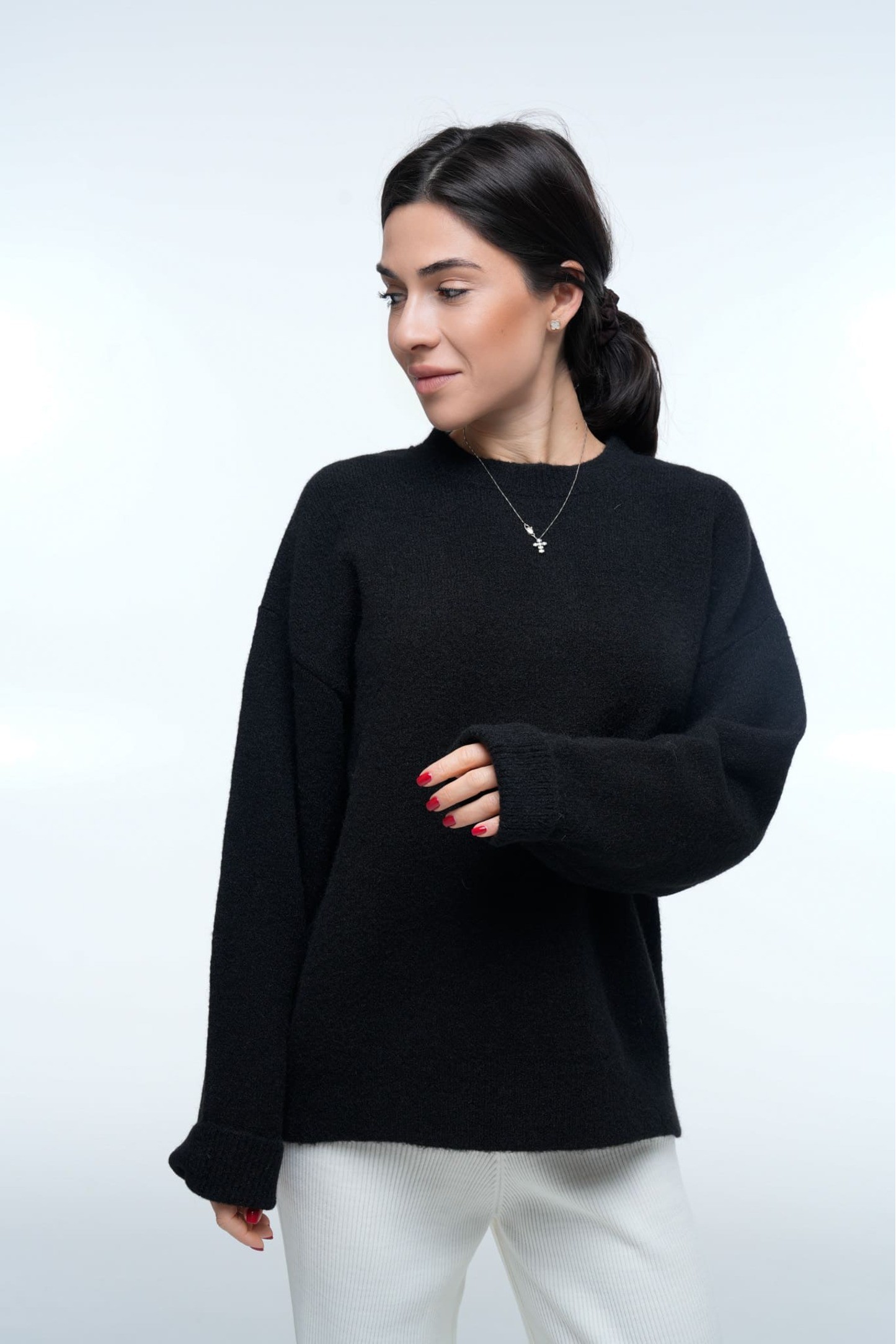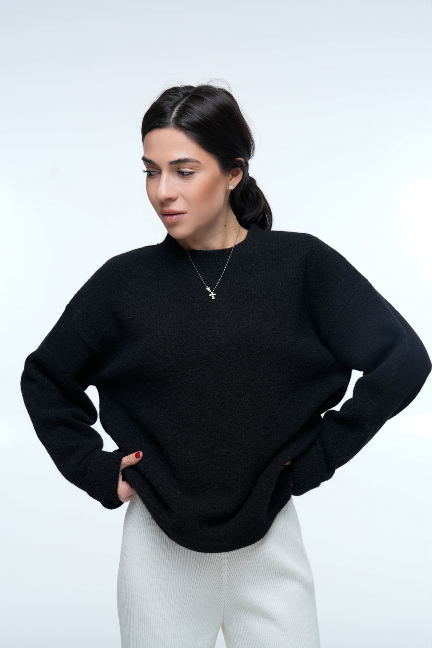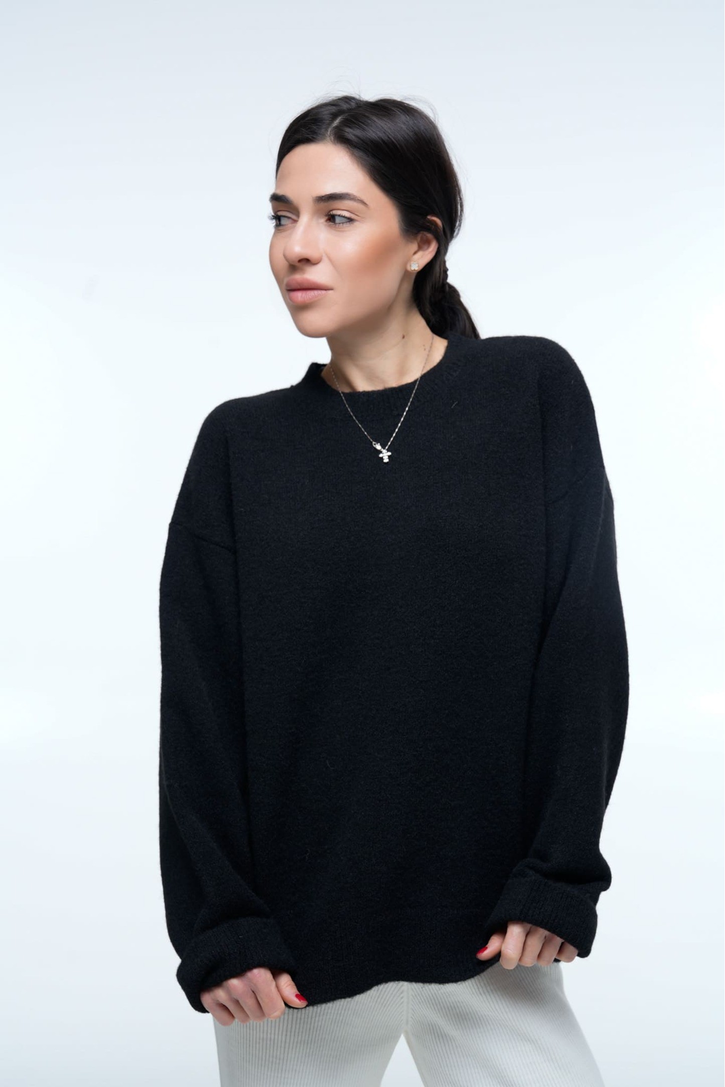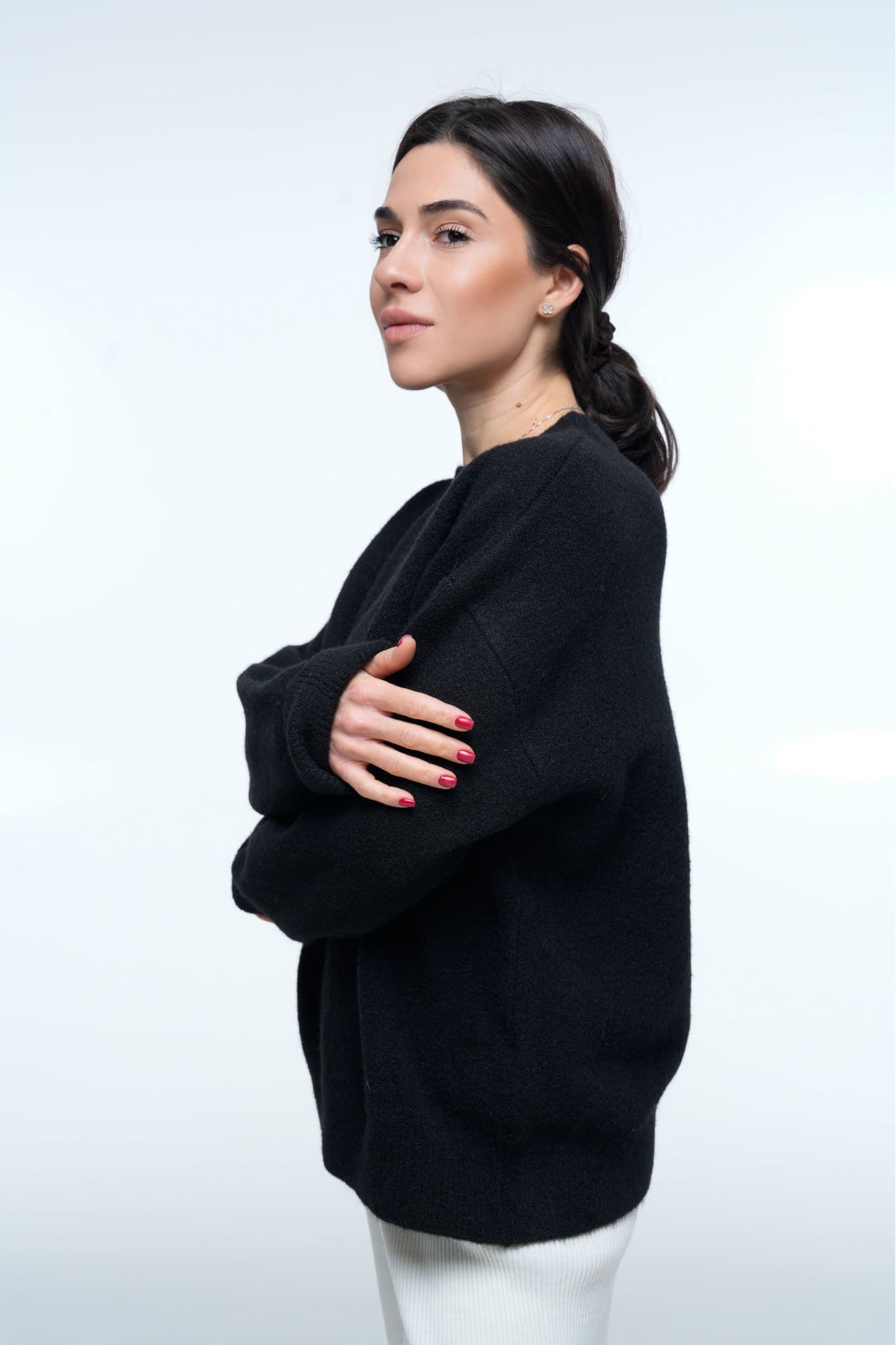 Светр Cozy Aura Чорний — універсальна базова модель у стильному oversize-силуеті. Має м’яку текстуру з легким пухнастим ефектом, що добре видно на фото. Завдяки вмісту шерсті забезпечує комфортне тепло, а еластан надає легку еластичність та зручну посадку.