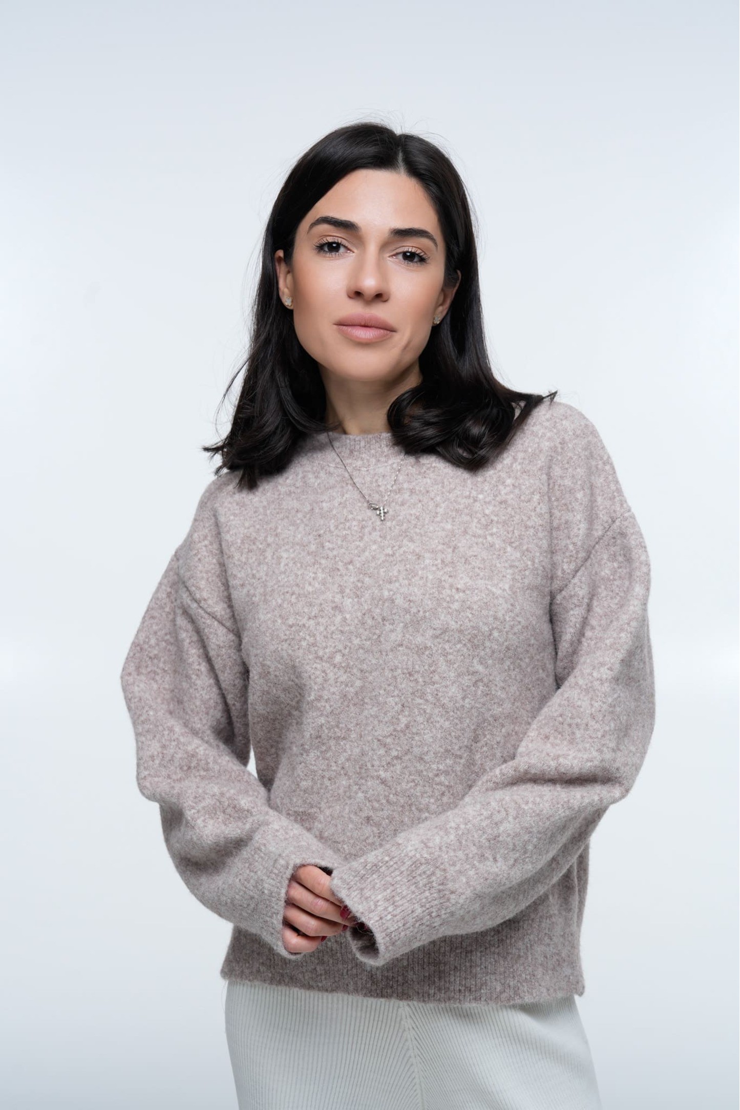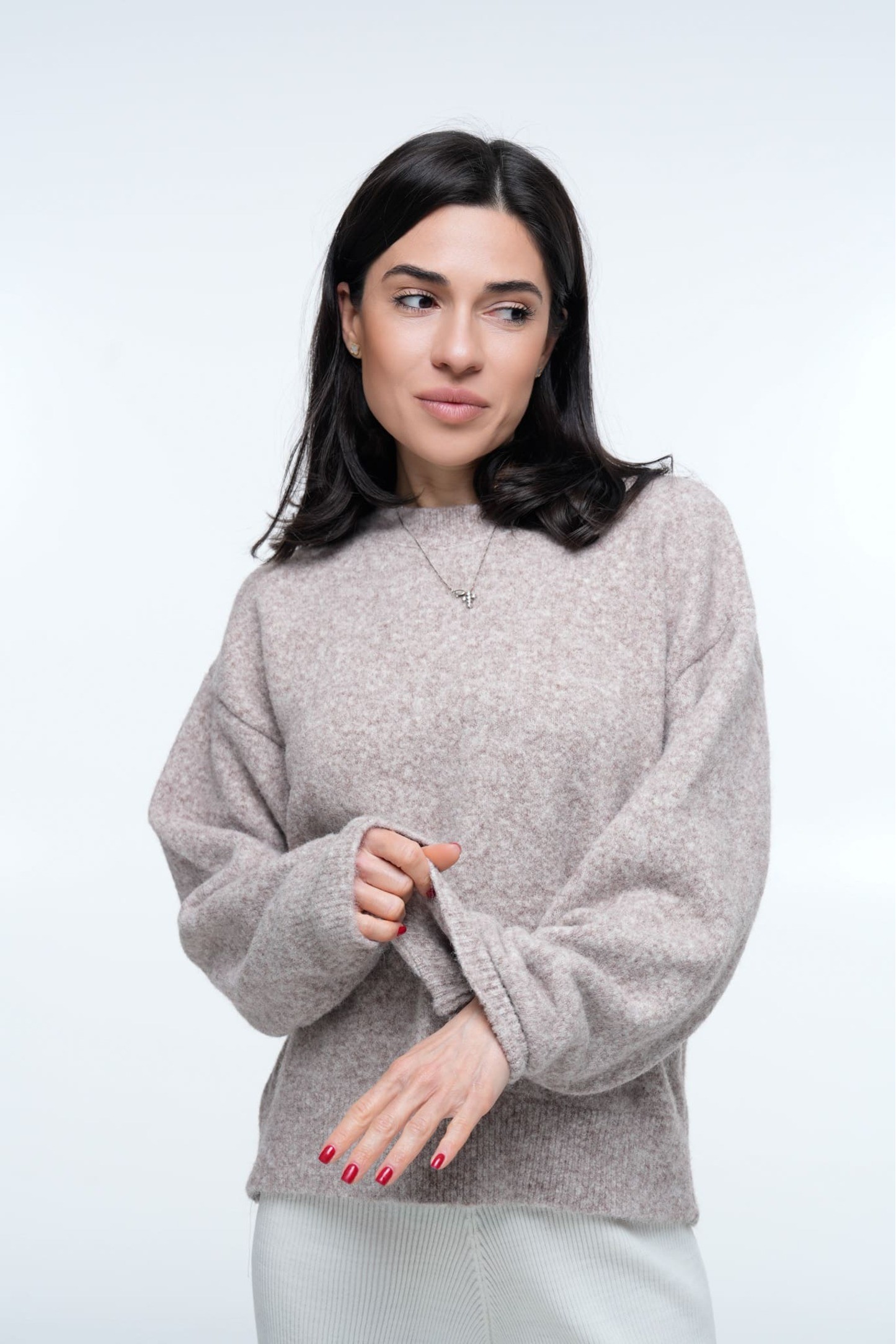 Светр Cozy Aura Sand Melange — м’яка, тепла та стильна модель у благородному піщано-меланжевому відтінку. Тканина має пухку, ворсисту текстуру, яка створює ефект кашемірової м’якості та дарує максимальний комфорт у прохолодну пору. Натуральні волокна у складі додають теплоти, а синтетичні — зберігають форму й запобігають деформації.