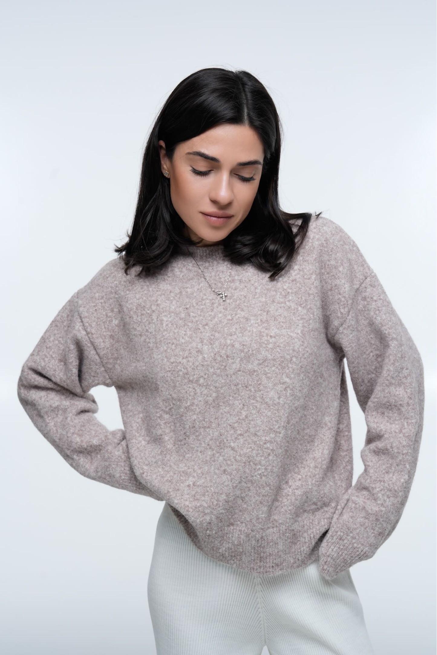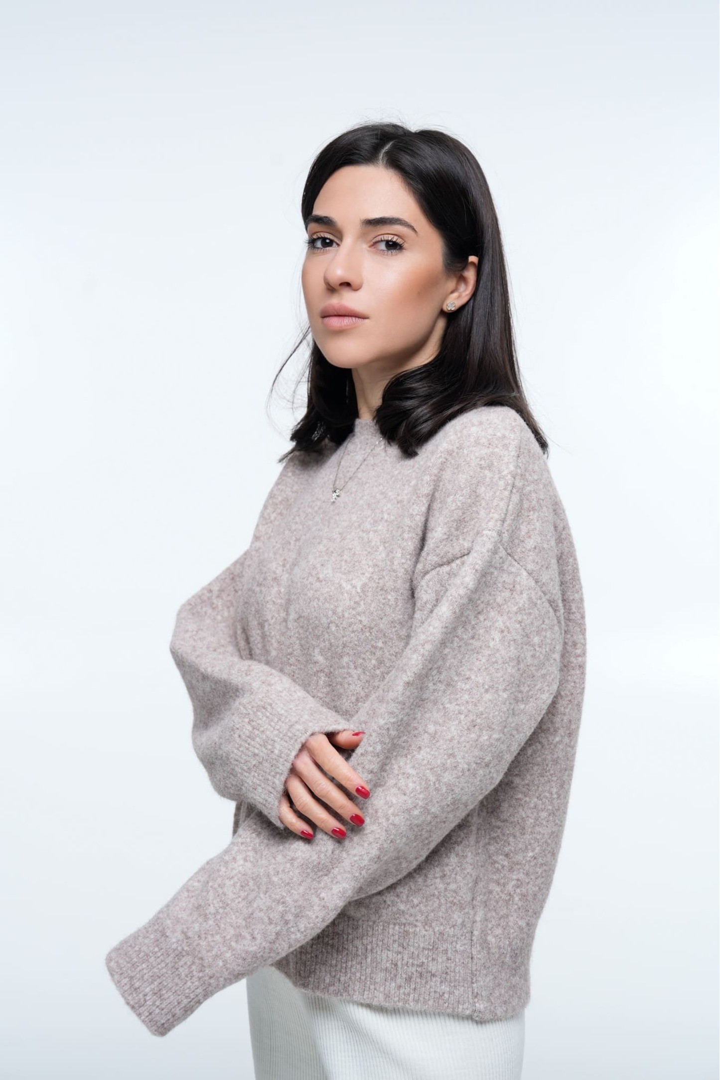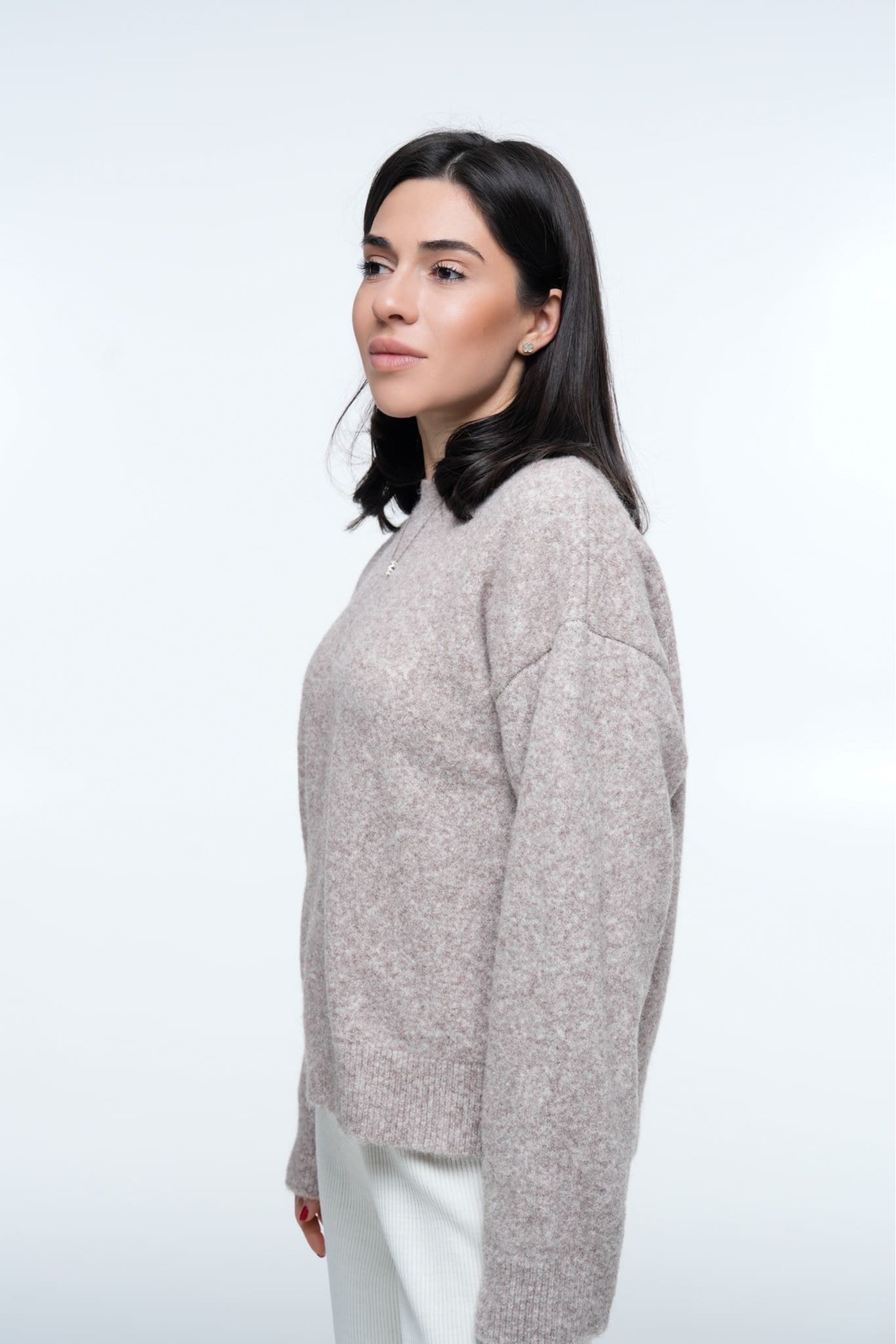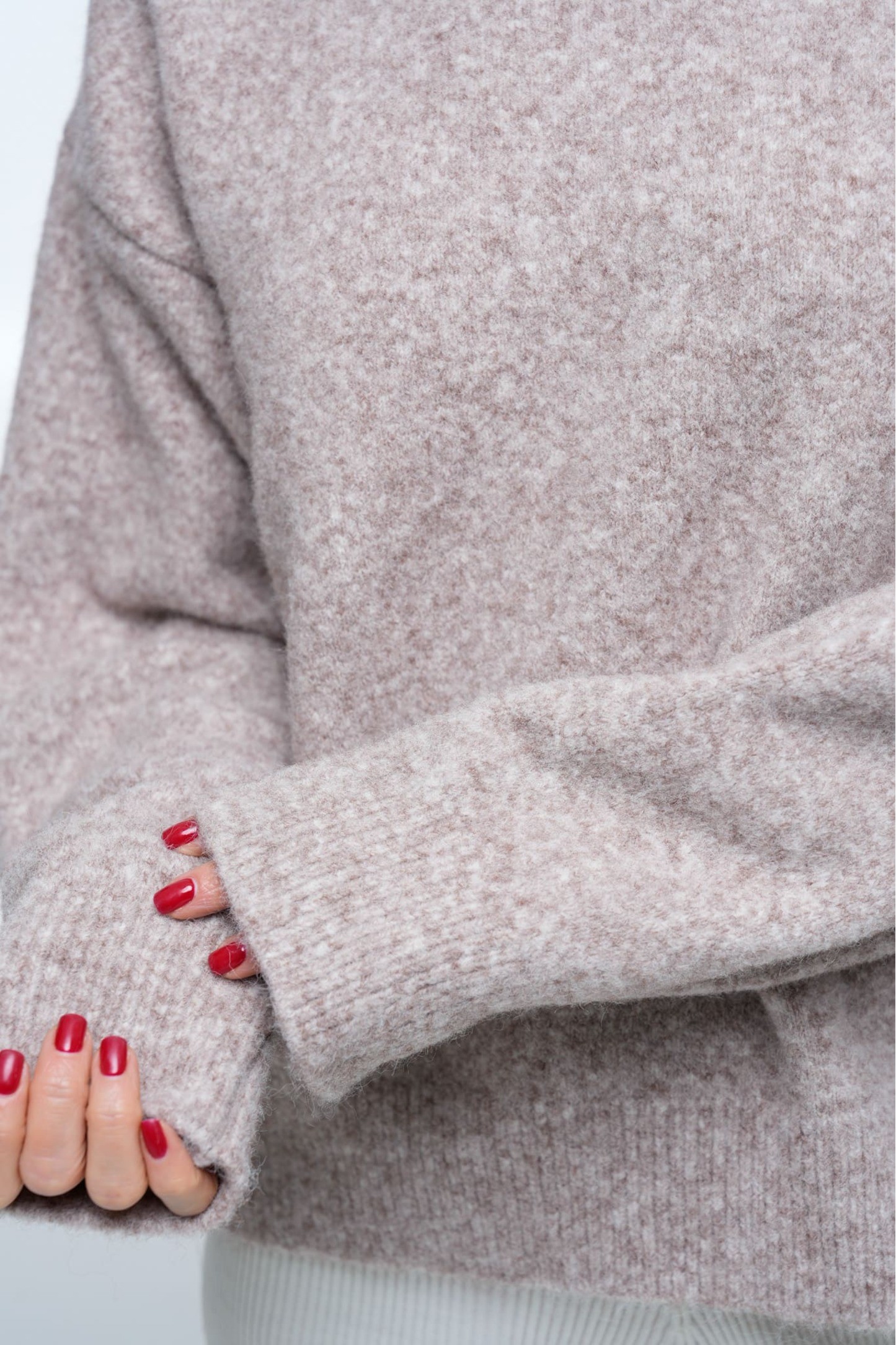 Меланжевий піщано-бежевий колір виглядає преміально й чудово поєднується з білими, молочними, сірими та шоколадними низами. Светр універсальний за стилем — підійде і для щоденних образів, і для ніжних, затишних луків.