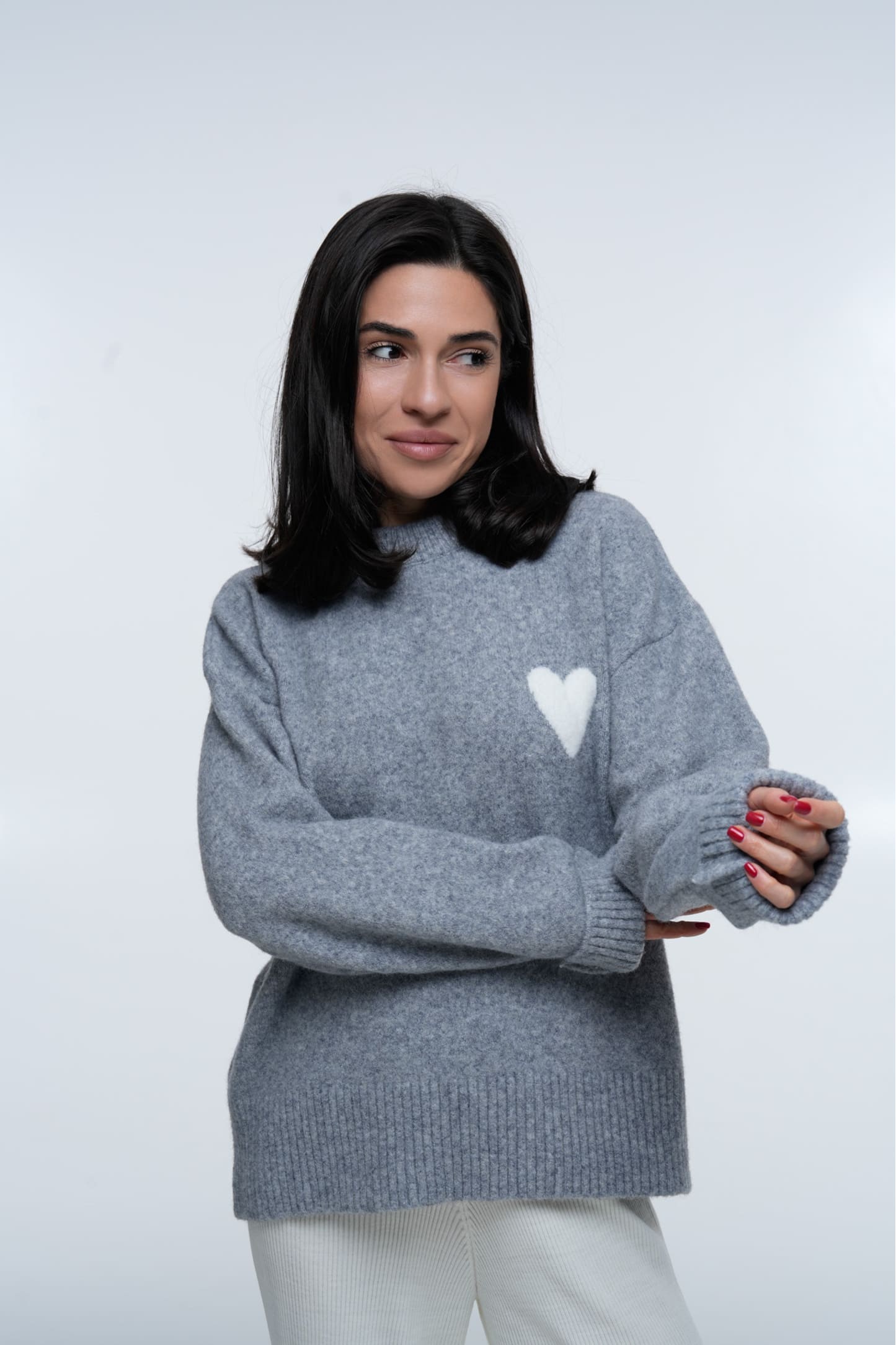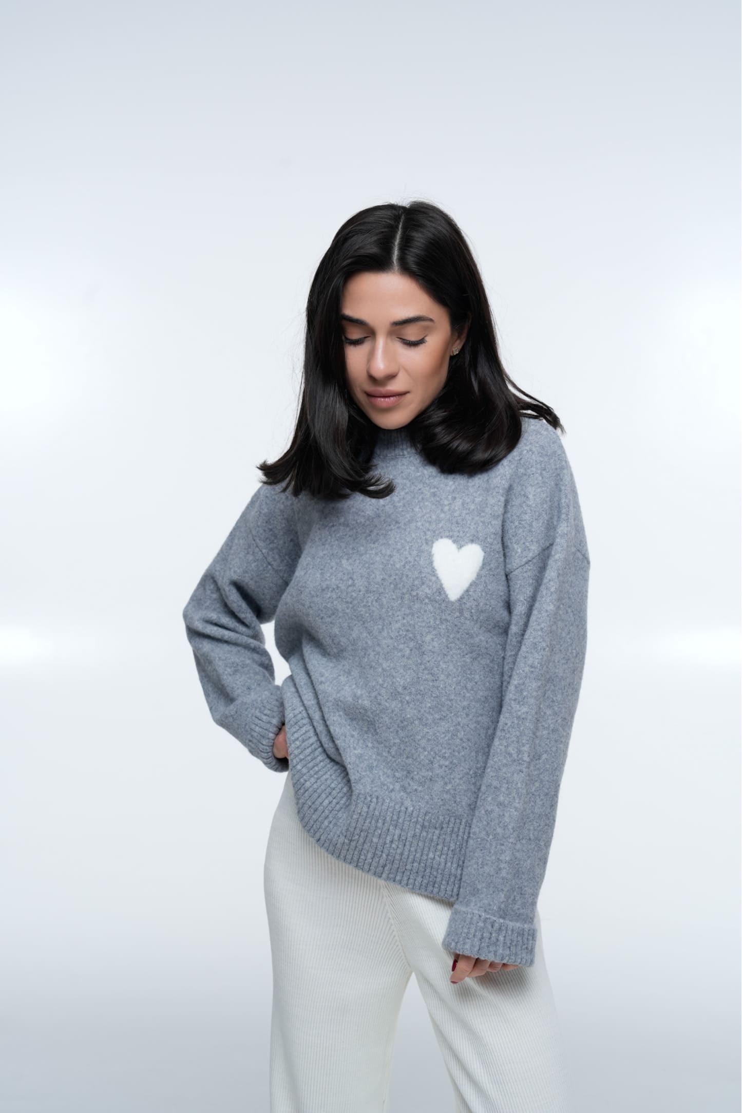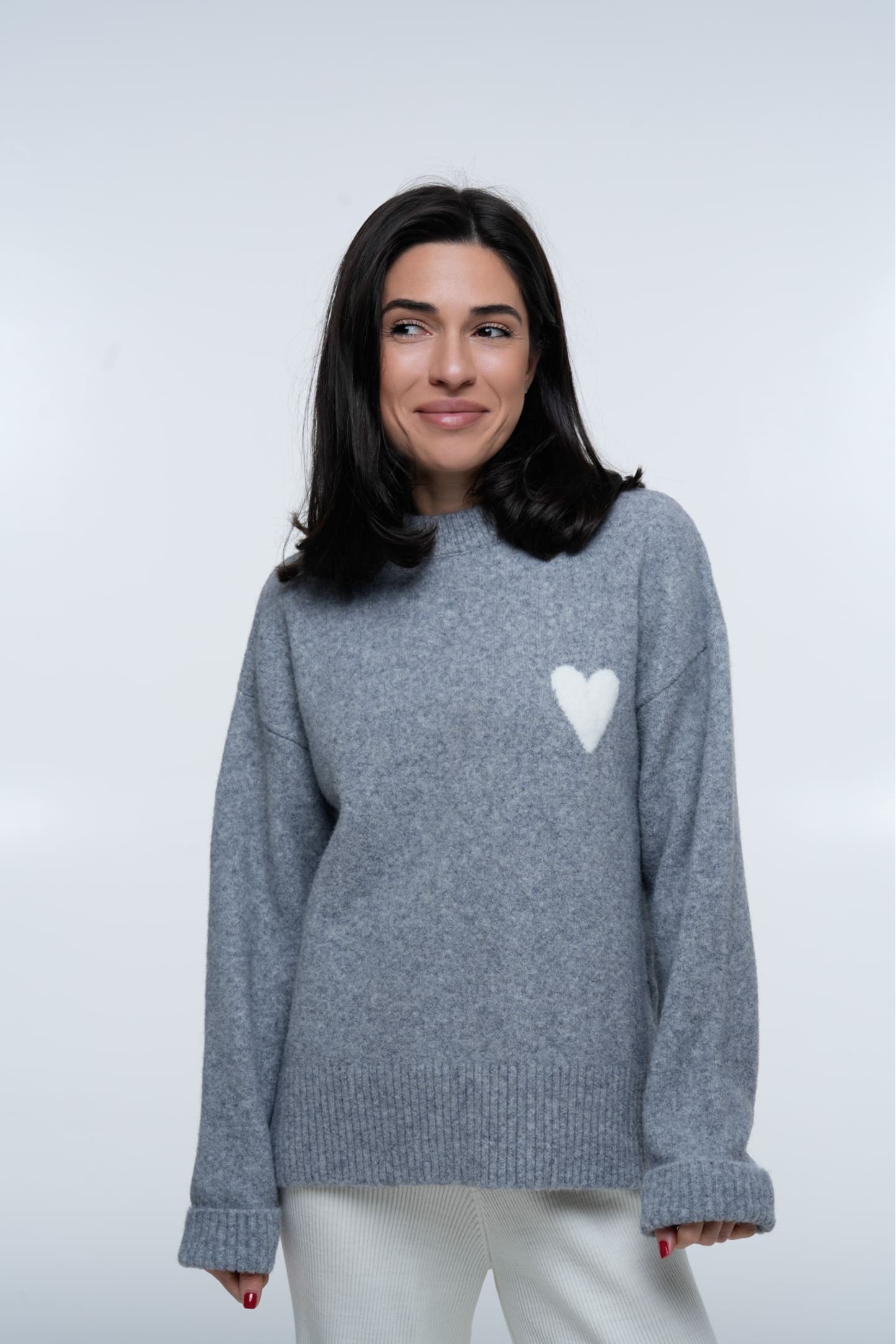 Светр Heart Cozy Grey — тепла та стильна модель у м’якому сірому кольорі, виконана з приємної на дотик дрібноворсової пряжі. Має вільний силует і опущену лінію плеча, що забезпечує комфортну посадку та створює затишний об’єм без зайвих складок. Зліва розташований акуратний акцент — біле пухнасте серце, яке додає виробу ніжності та впізнаваності.