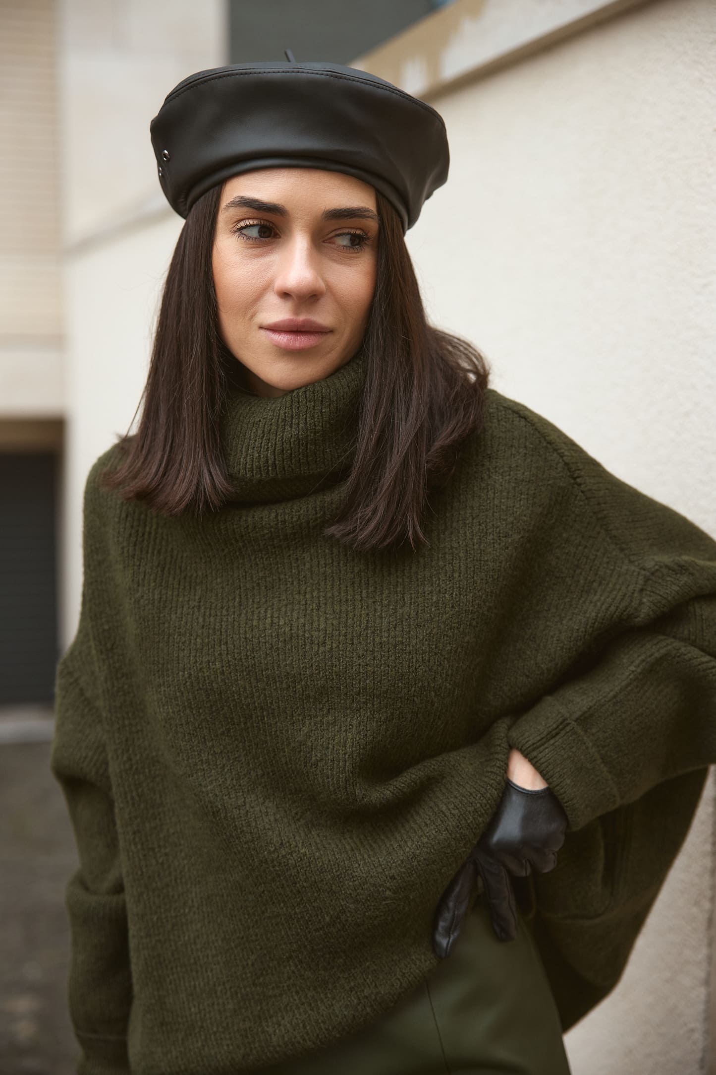 Високий об’ємний комір-гольф, який не прилягає щільно до шиї, забезпечуючи комфорт і сучасний вигляд.