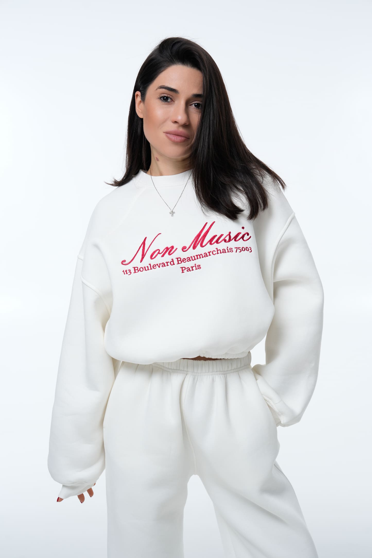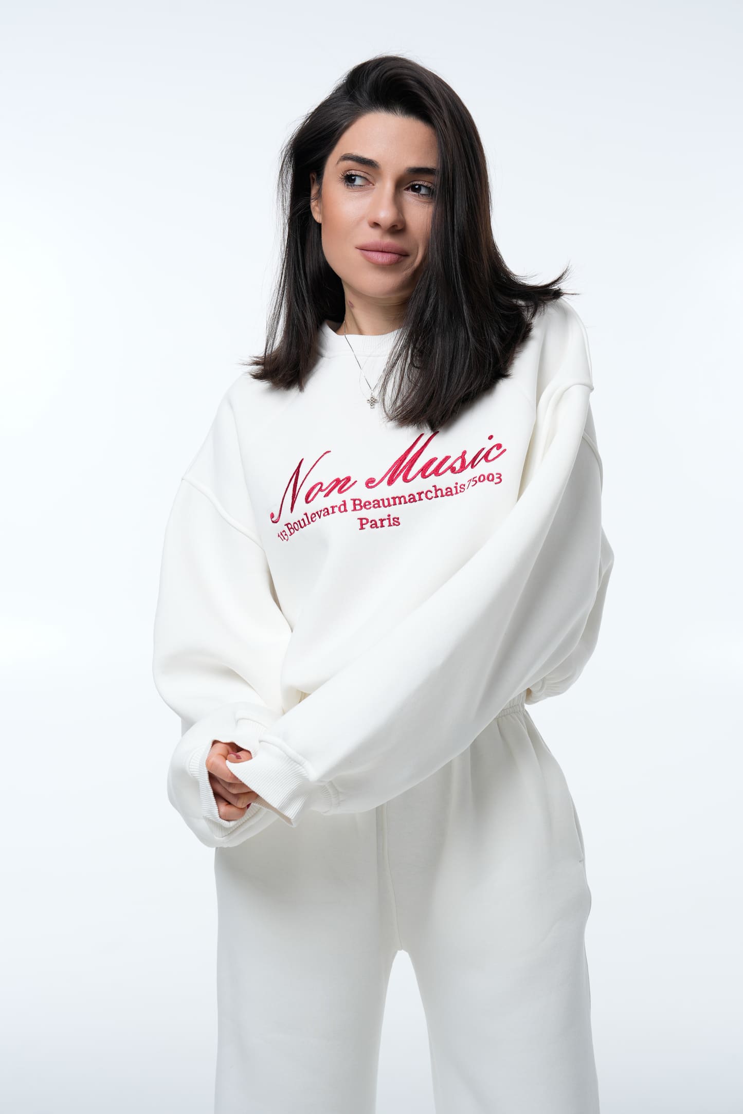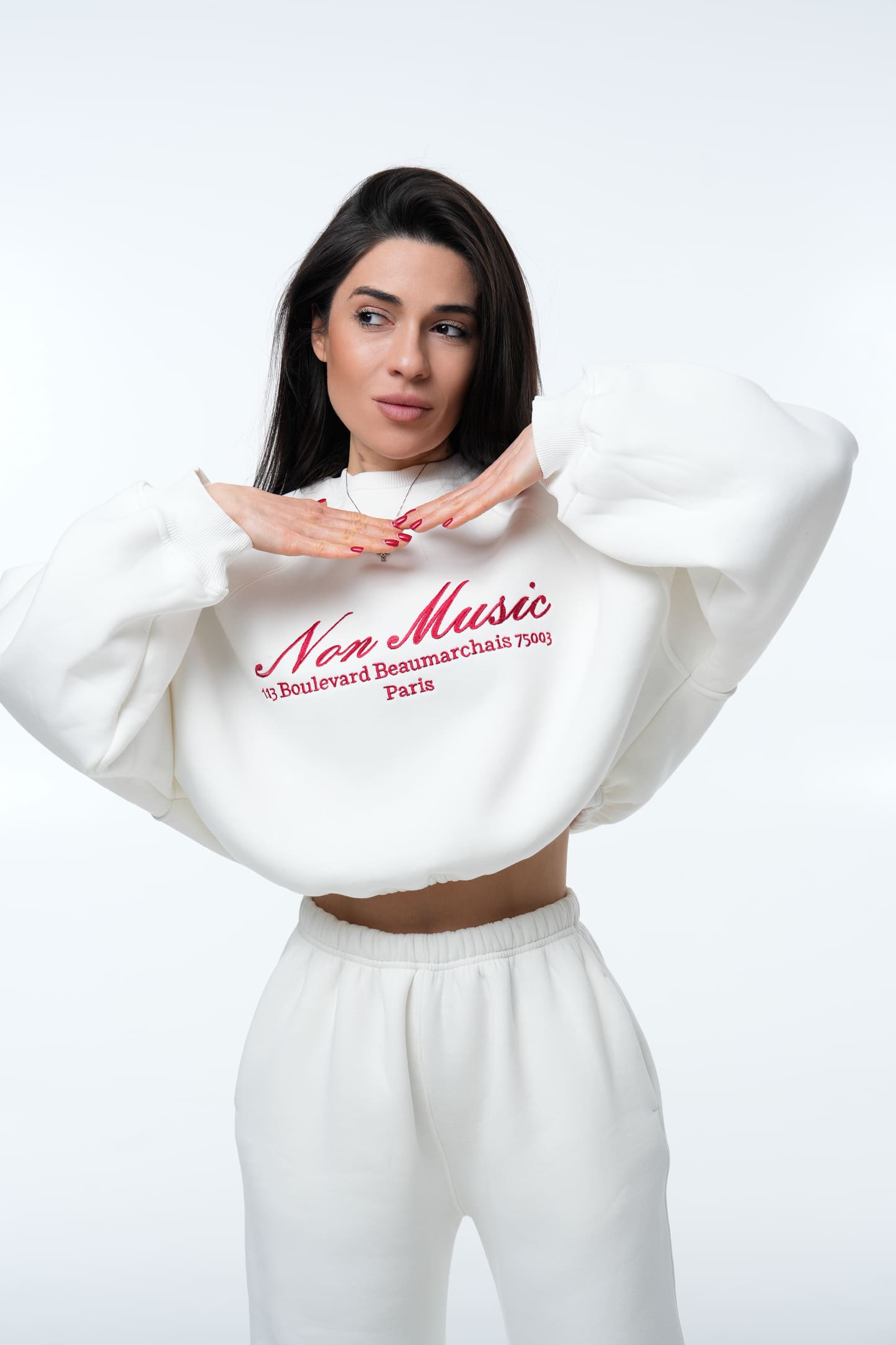 Світшот Non Music White виконаний із високоякісного футера на флісі, що забезпечує м’якість, комфорт і приємне тепло. Модель має укорочений силует із легкою свободою, що додає образу сучасності та легкості. Універсальний розмір комфортно сідає на різні параметри фігури.